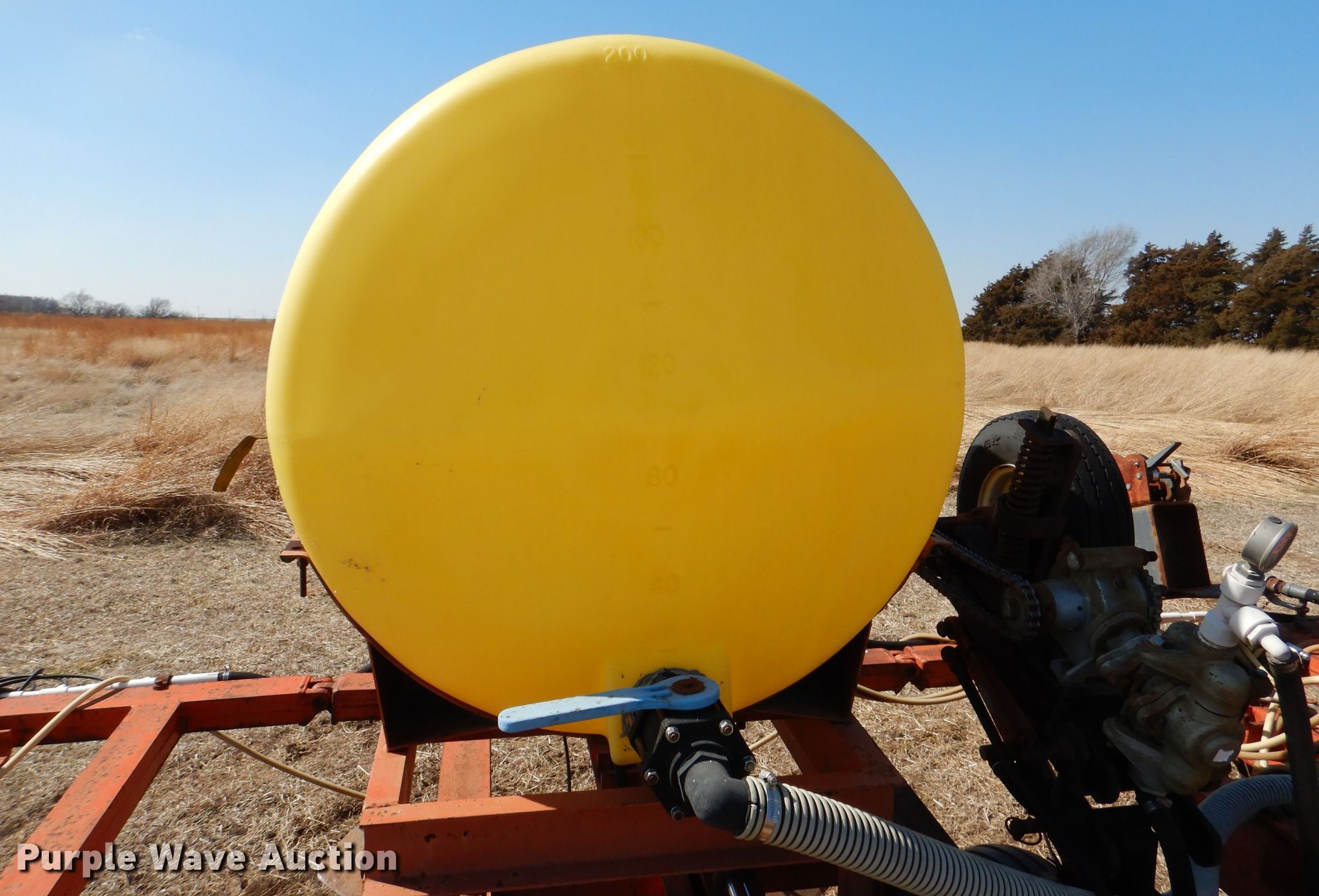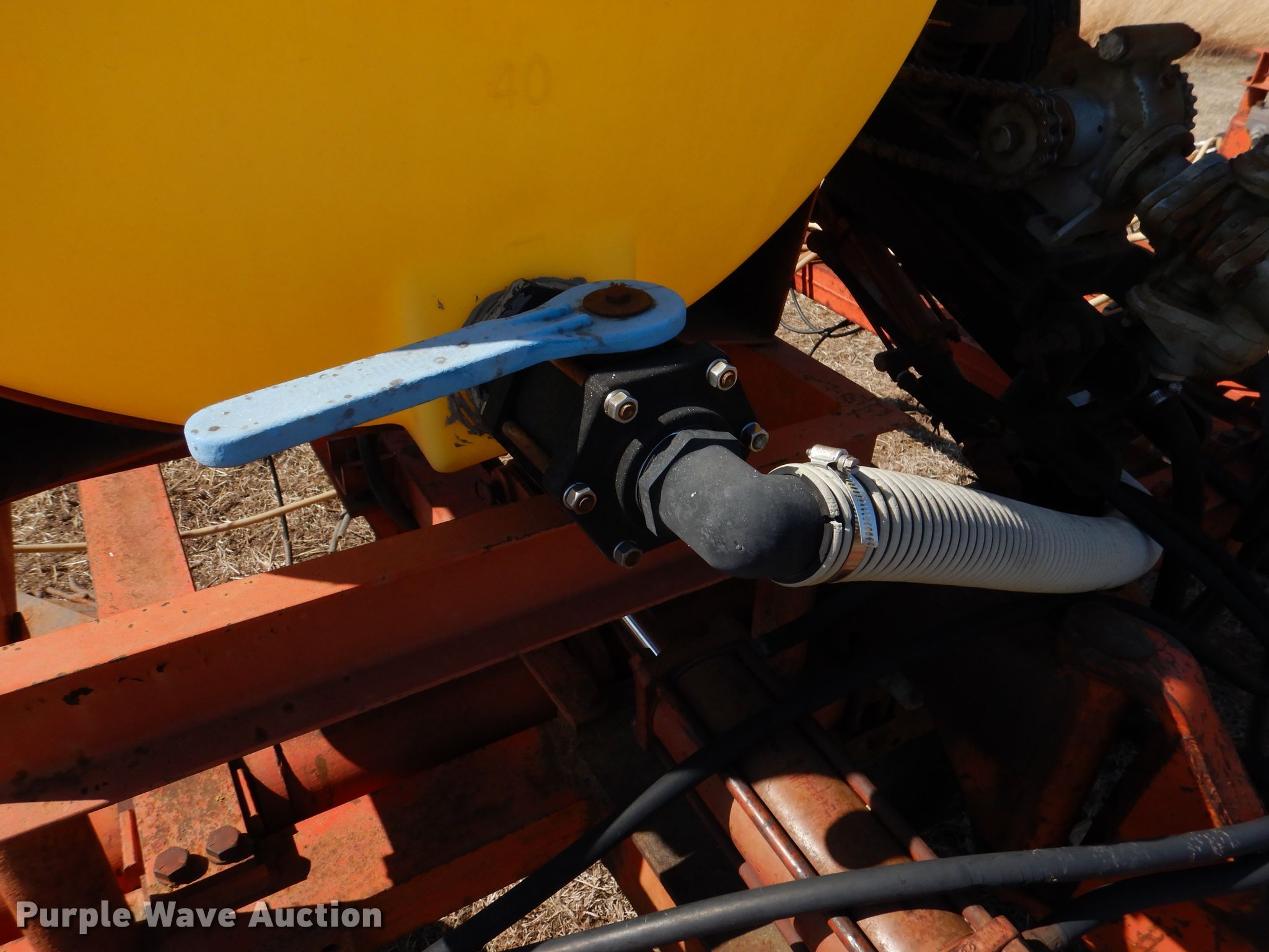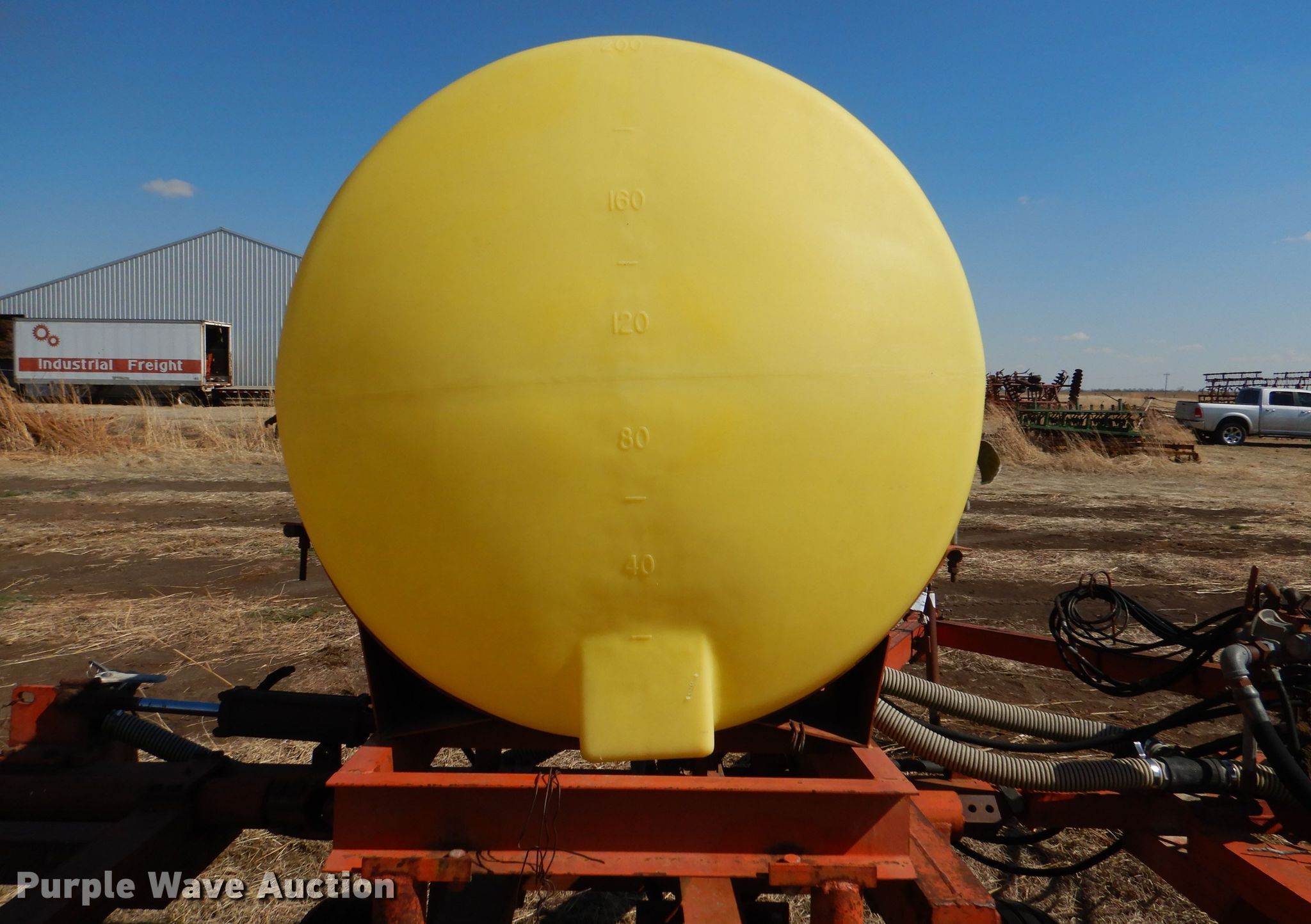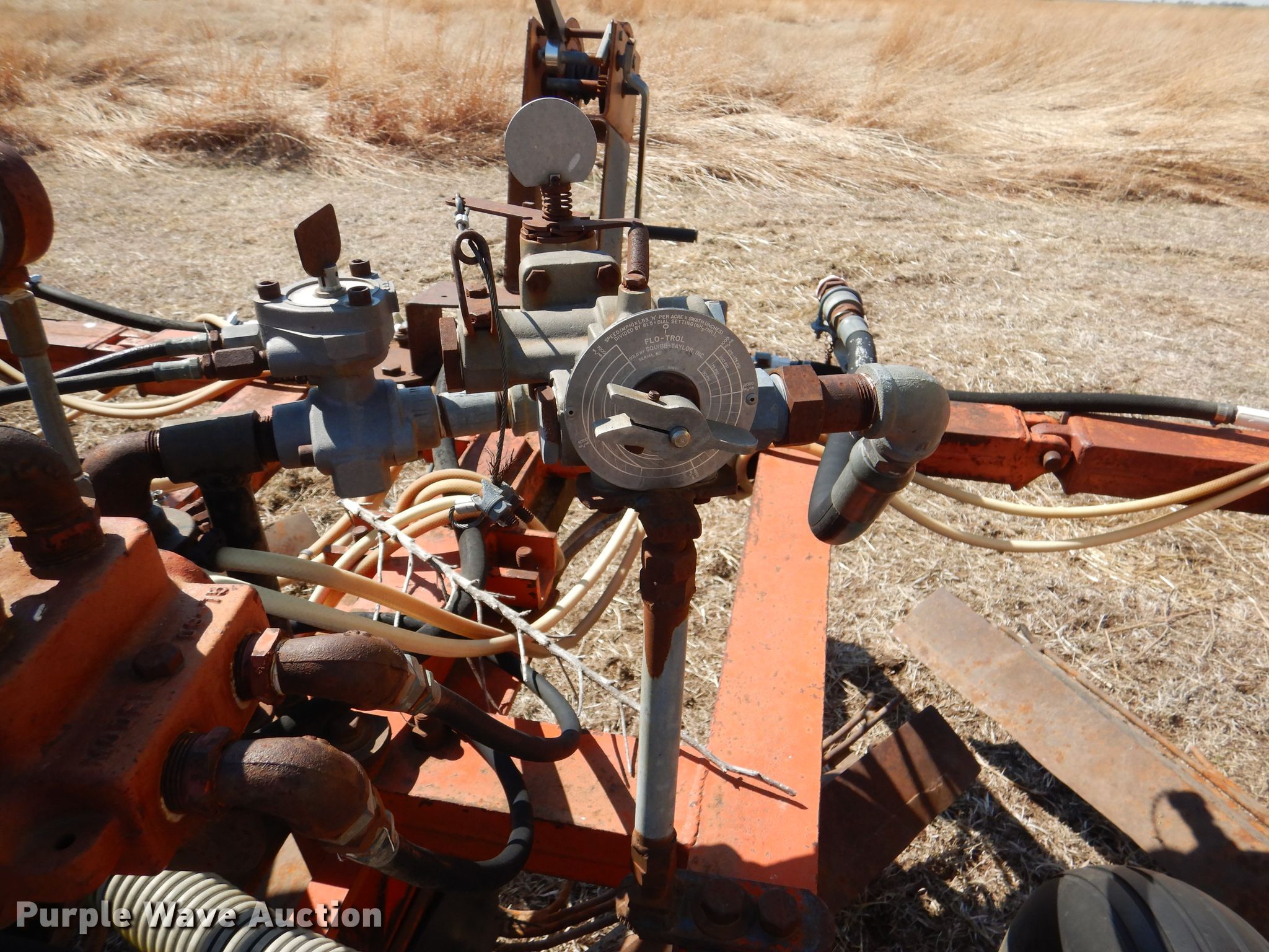 Richardson sweep plow. Overall width: 24' 6". Operational Hydraulic fold, Hydraulic lift, Liquid fertilizer Capacity: 400 gallons, NH3 hookups, Rear hitch, Shanks: 5, Sweep width: 5' 6", Blade diameter Front: 16". Tires Tire size: 7.60-15SL. Notes (3) front blades missing. Becca Farms. Sawyer, KS 67134