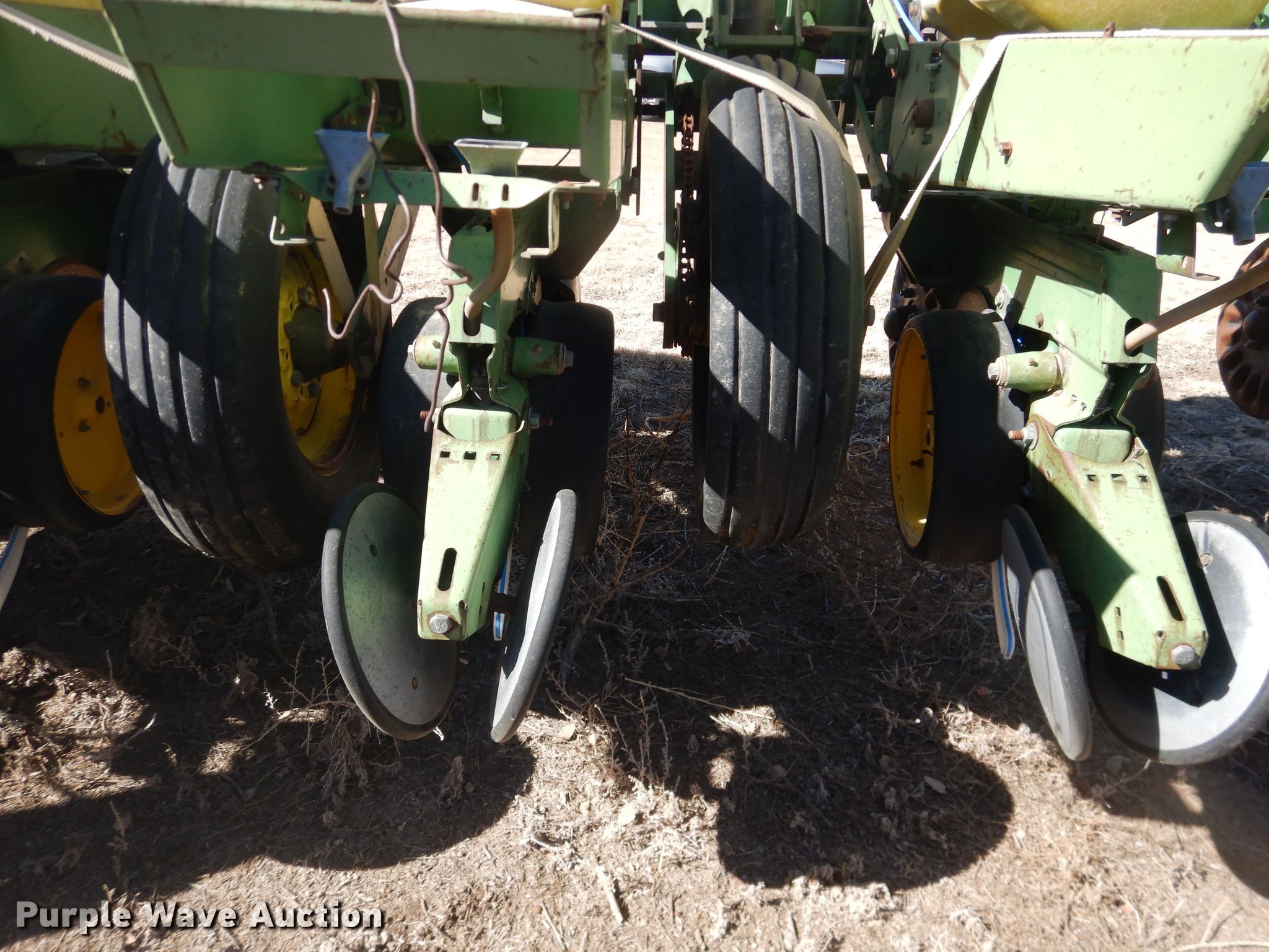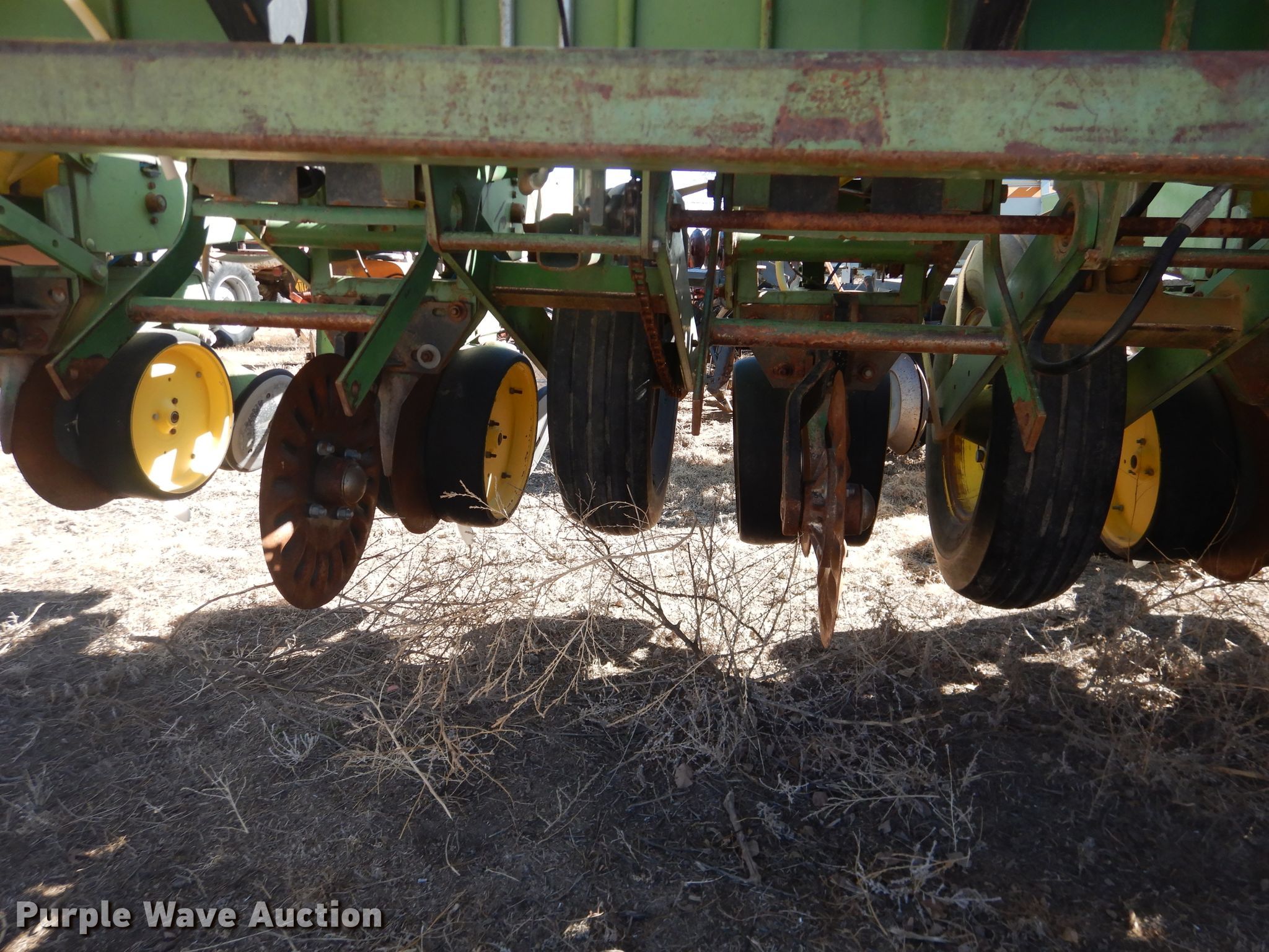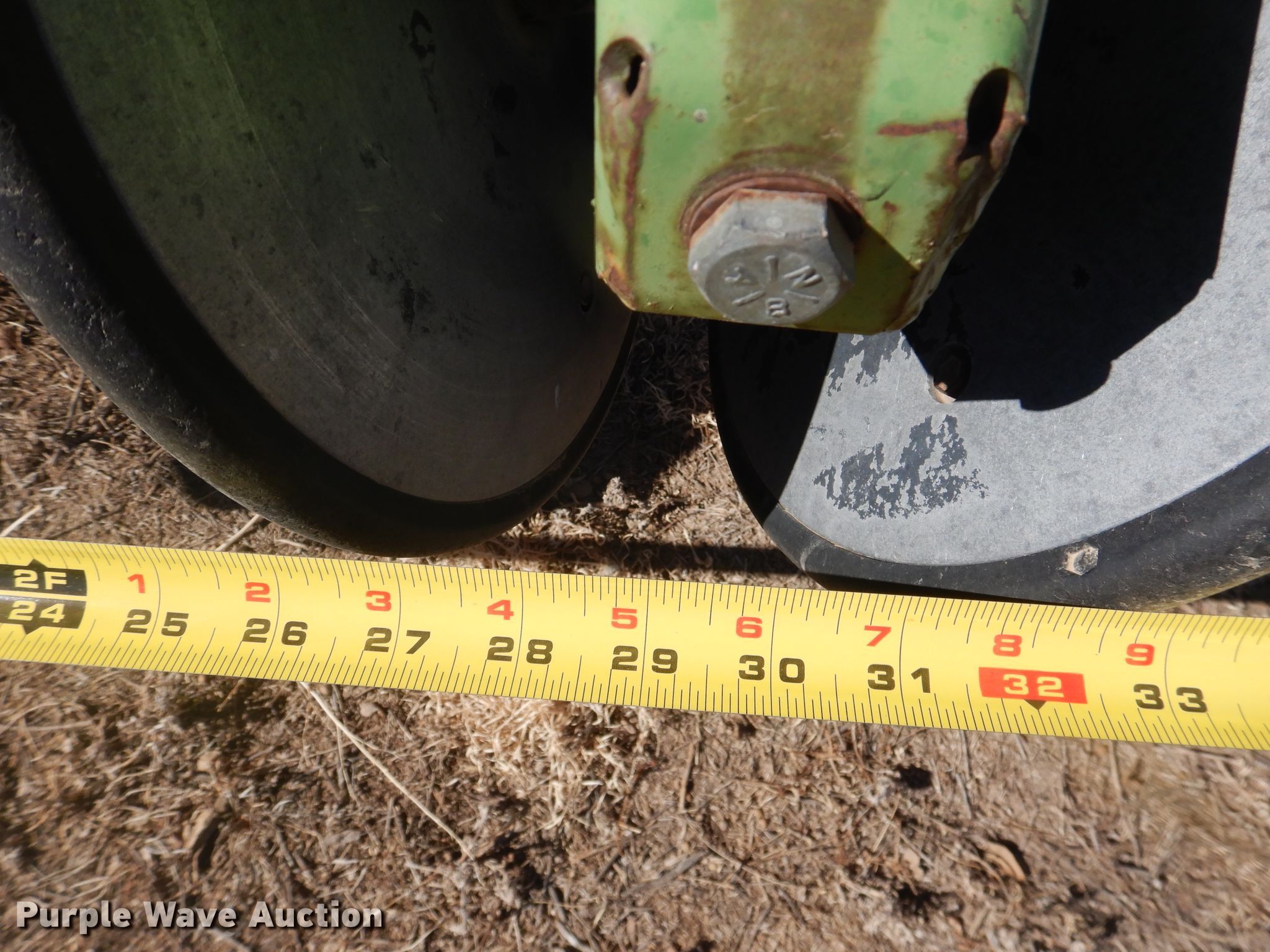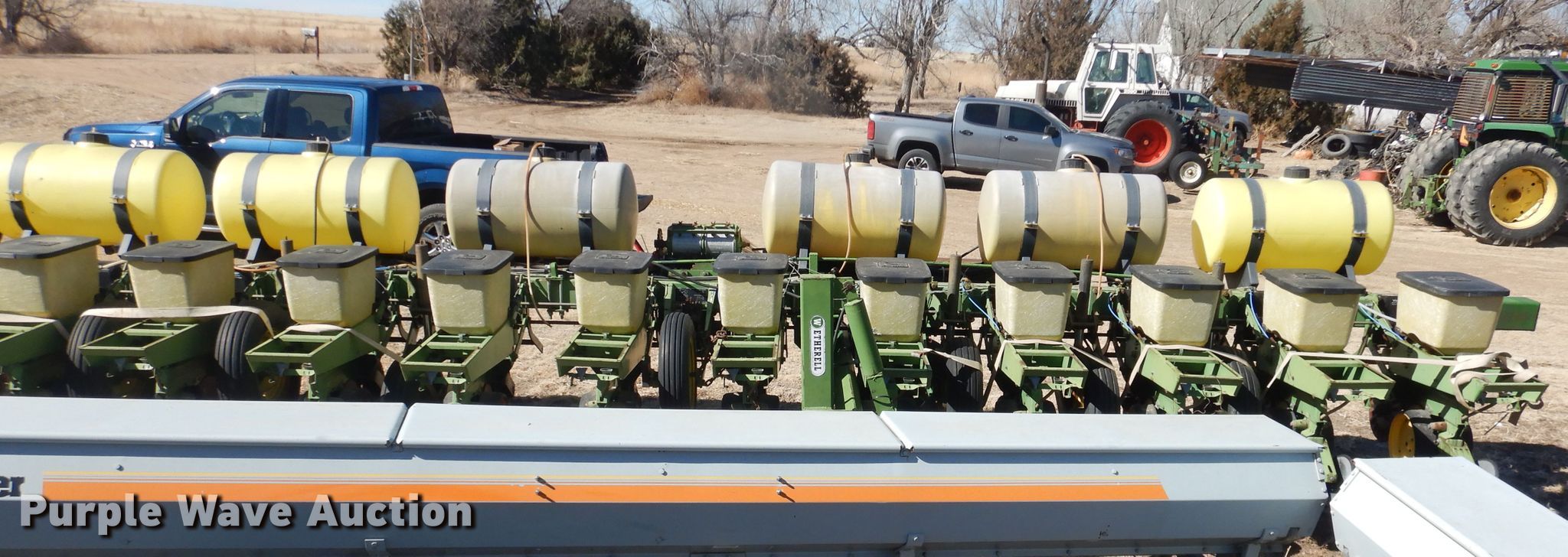 John Deere 7000 planter. Width: 30', Row units: 12, Row spacing: 30", Serial: 089494A. Operational Seed delivery Individual seed hoppers, Row units Meter drive: Ground, Down pressure: Spring, Disk openers: Double, Gauge wheels: Double, Closing system: Double Type: Rubber, Fertilizer/ insecticide Fertilizer Liquid capacity: 360 gallons.. Tires Transport tire size: 11L-15 Quantity: 2, Drive/outside tires Quantity: 7. Notes (12) additional seed hoppers, (12) additional corn fingers, (12) additional milo seeders. L5M Land and Cattle Company. Holly, CO 81047