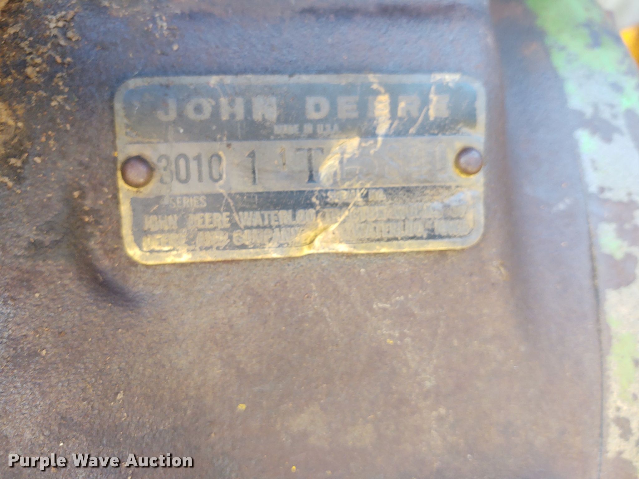 John Deere 3010 tractor. Serial: 301011T15840. Engine Fuel type: Diesel. Transmission Synchro, 8F - 3R. Operational PTO: 540, Three point, Hydraulic remote sets Rear: 1. Tires Front: 6.50-16, Rear: 13.6-38. CH White and Sons LLC. Council Grove, KS 66846