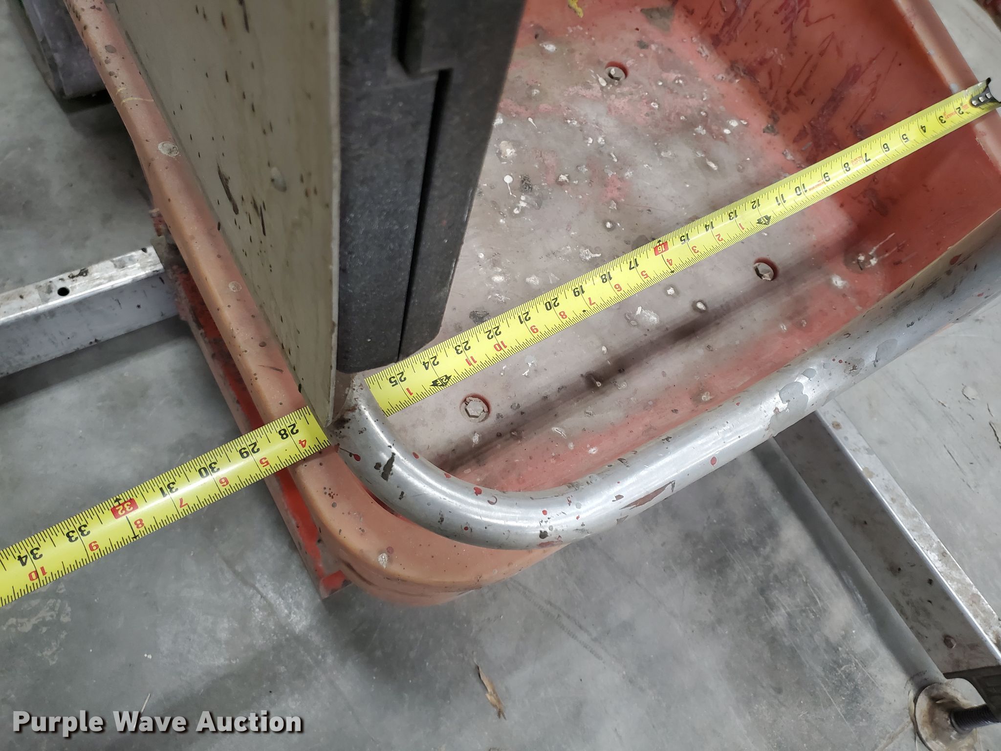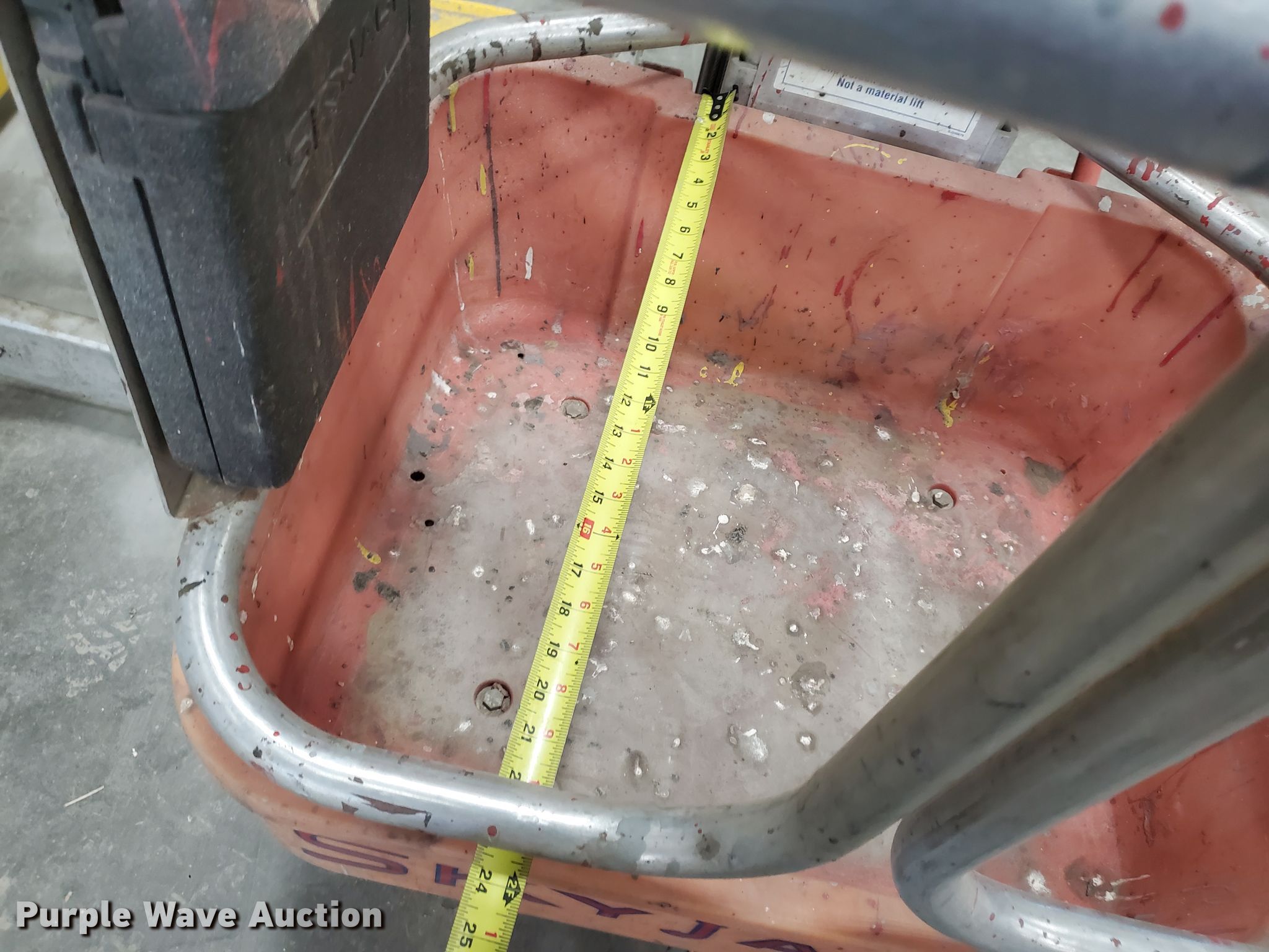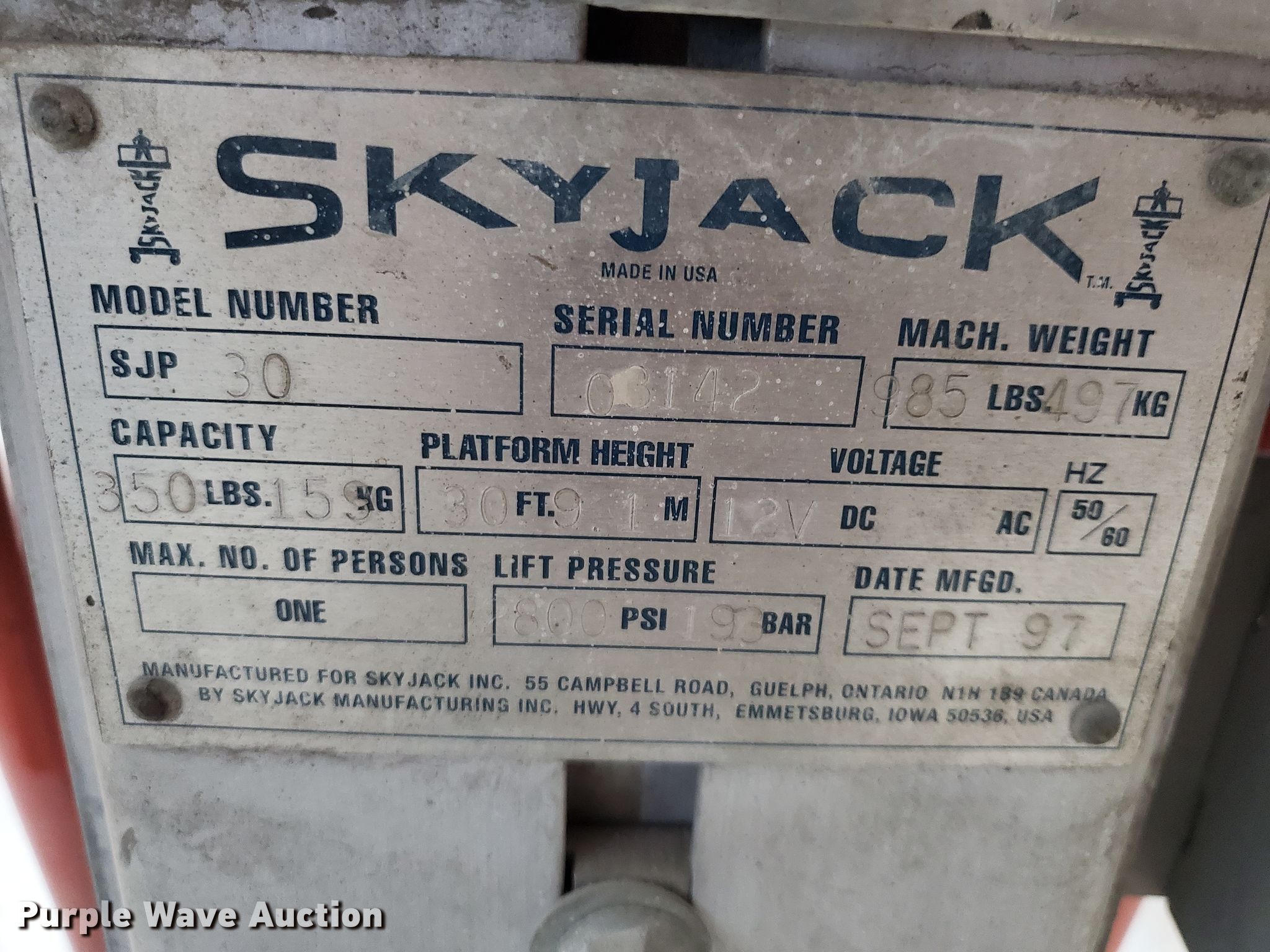 1997 Skyjack SP30 vertical lift. Serial: 03142. Electric Motor Volts: 12. Operational Maximum lift capacity: 350 lbs, Maximum lift height: 30', Platform: 24" L x 22" W, AC power outlet, Controls: Platform. Tires Solid. doyle bohl welding ser.. 323 W Union Rd. Phillipsburg, KS 67661