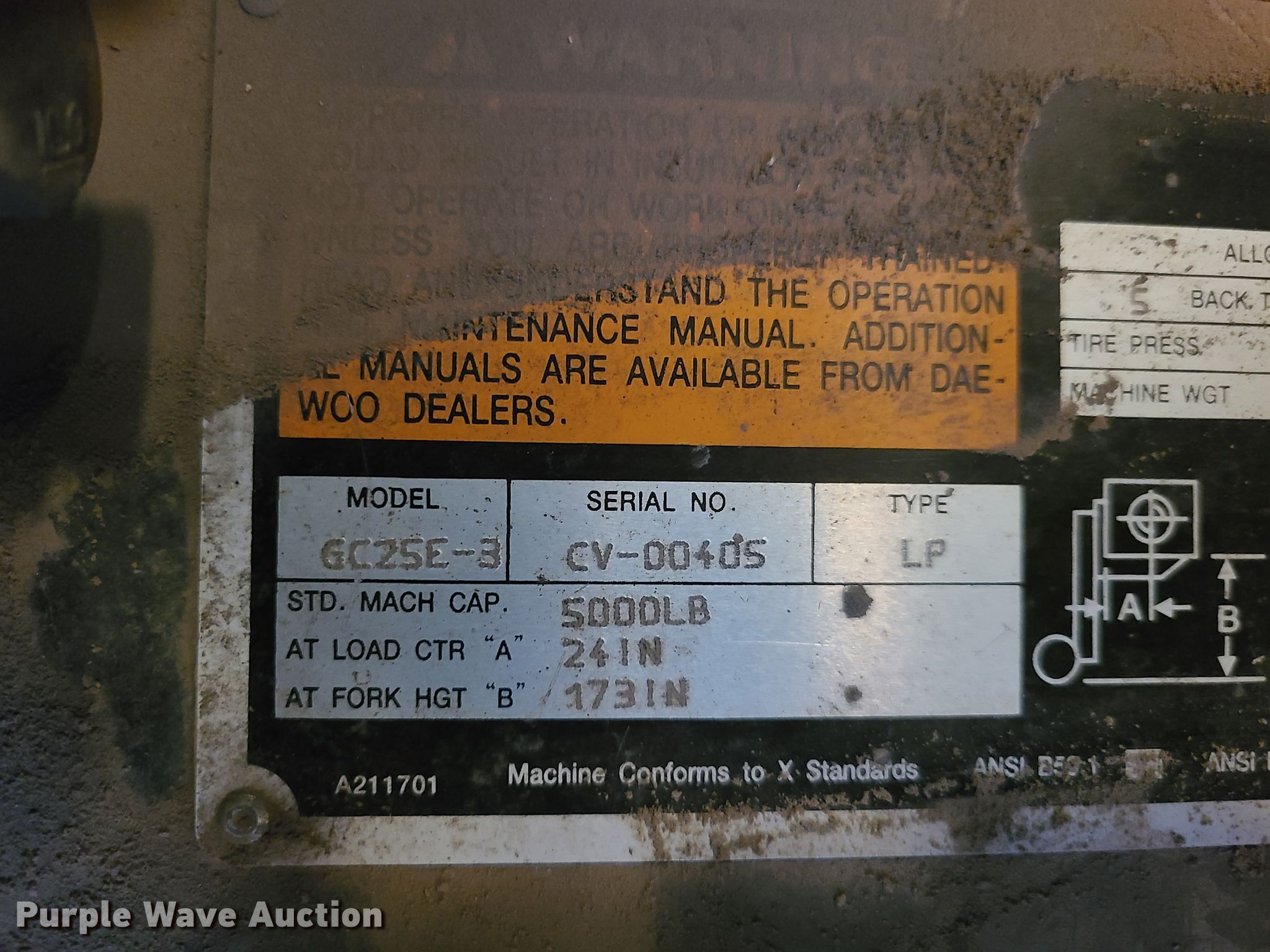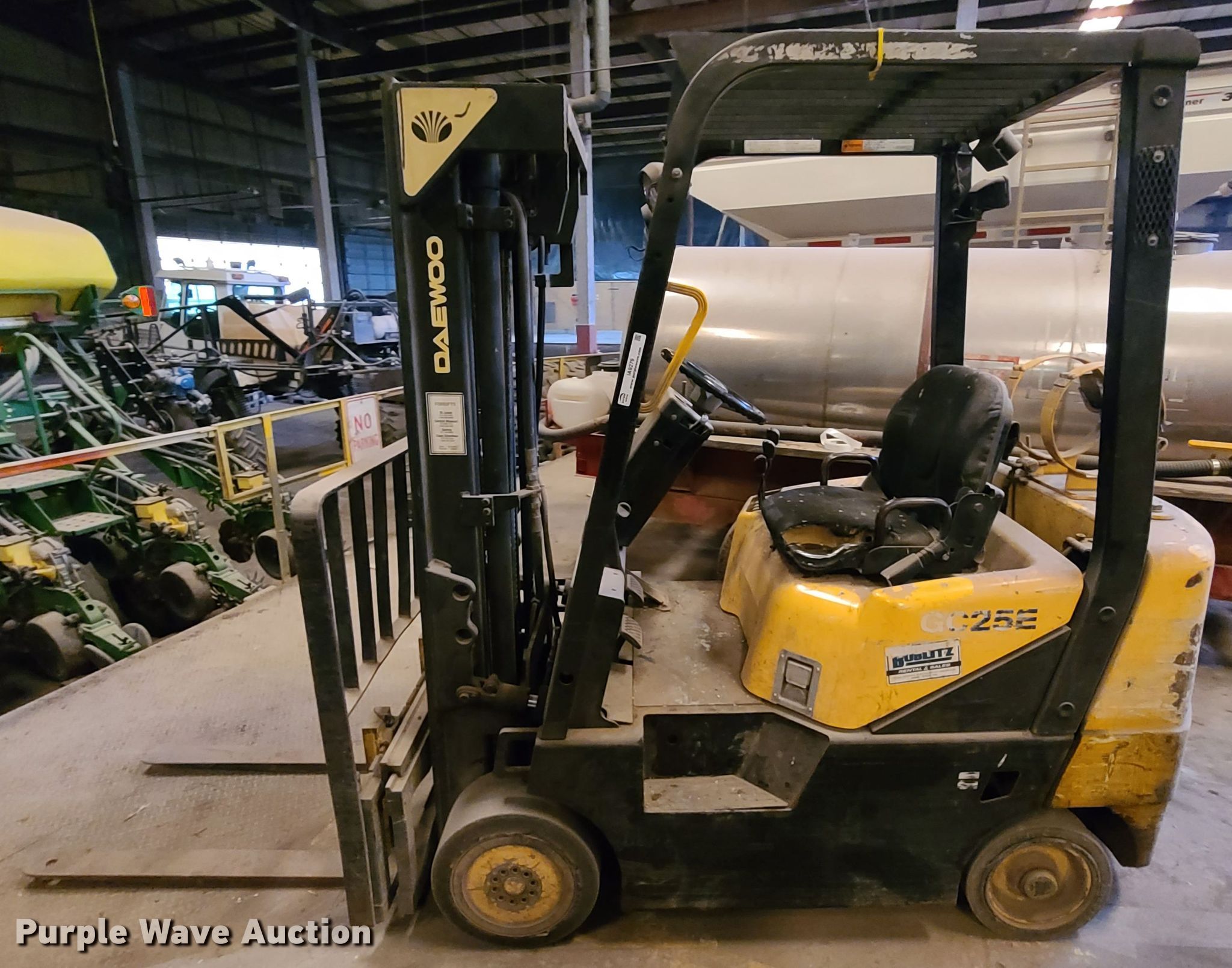 Purple Wave is selling a used Warehouse Forklift in Missouri. This item is a Daewoo GC25E-3 forklift with the following: Serial: CV-00405