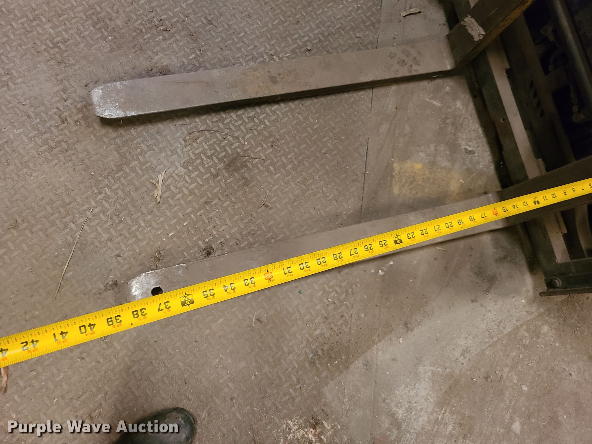Daewoo GC25E-3 forklift. Serial: CV-00405. Engine Cylinders: 4, Fuel type: LPG LP bottle: Not included. Transmission Powershift 1F-1R gears. Operators station Canopy. Operational Maximum lift capacity: 5,000 lbs, Maximum lift height: 241", Mast stages: 3, Side shift, Mast tilt, Fork length: 38". Tires Solid. Wright Farms. Atherton, MO 64058