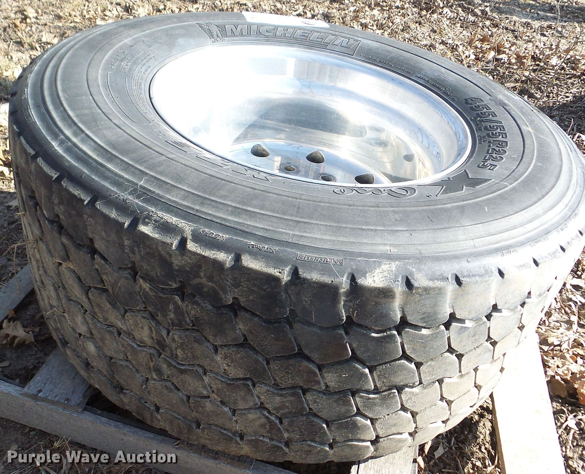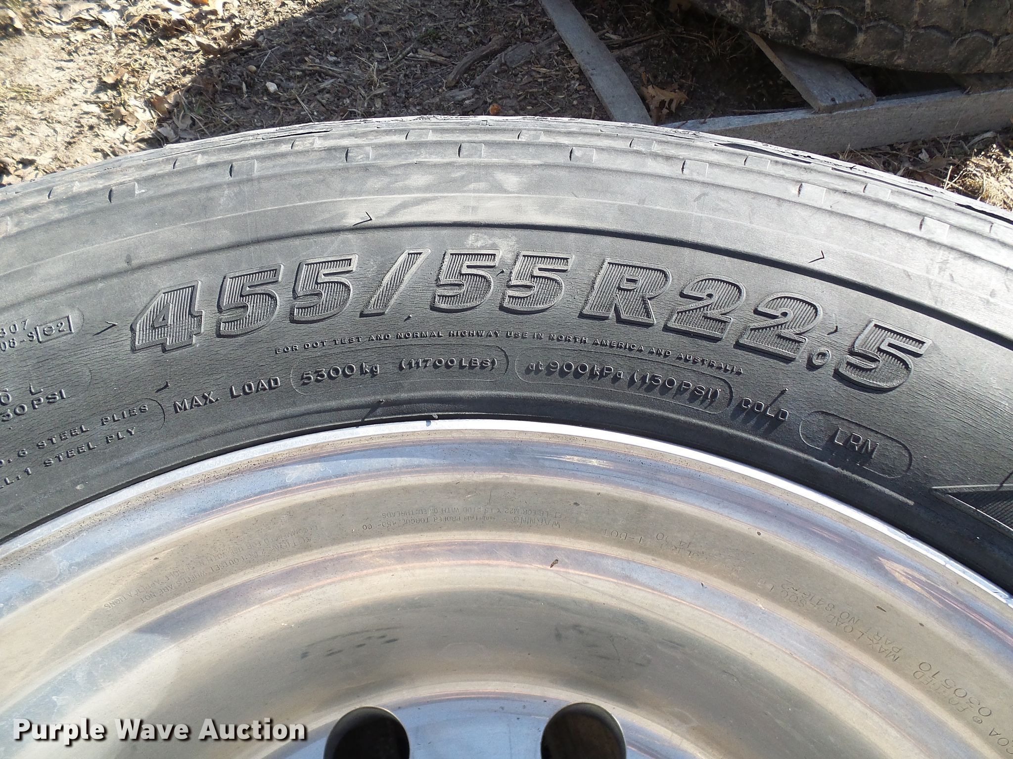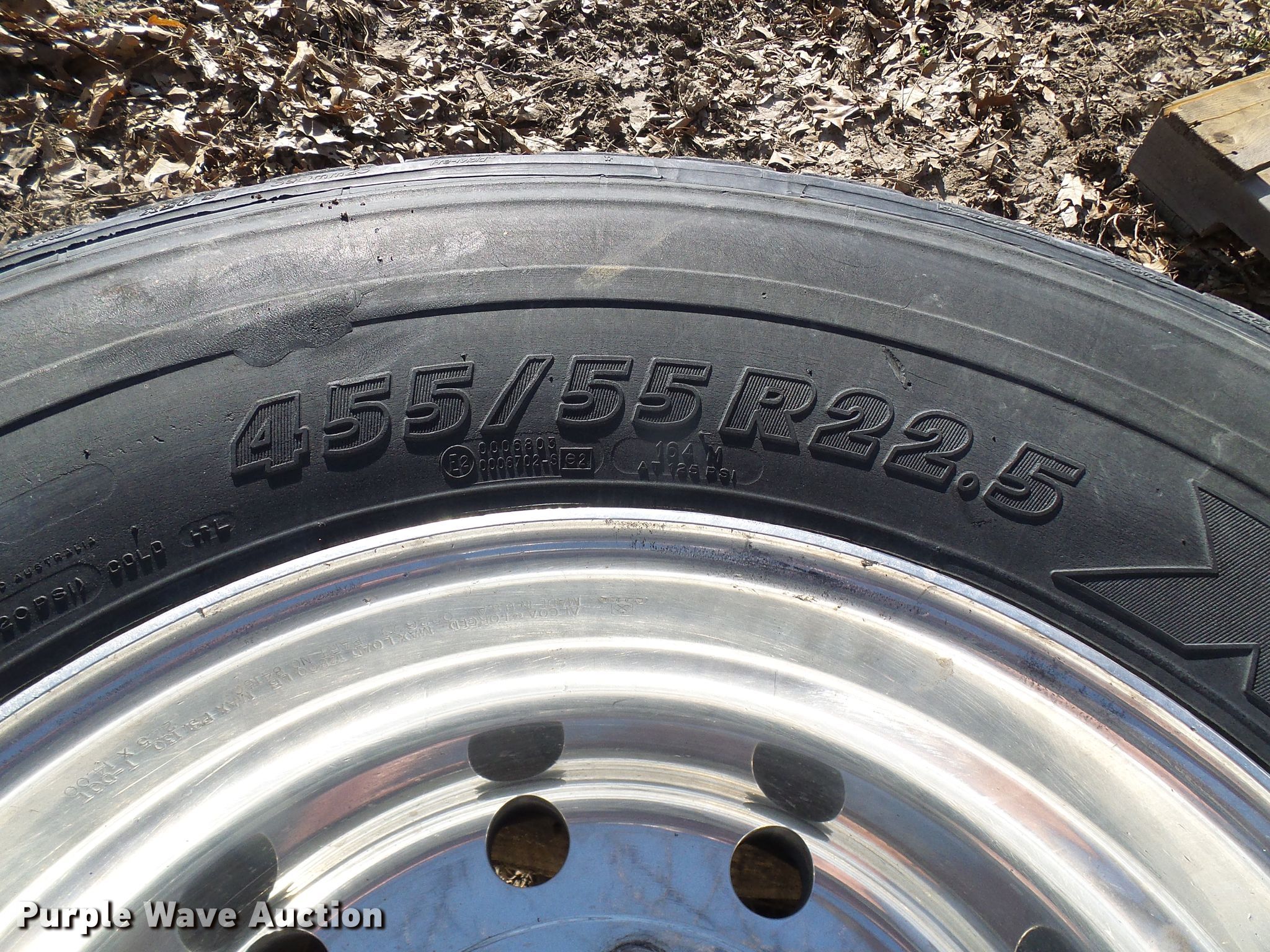 Purple Wave is selling a used Fleet Tires in Missouri. This item is a (4) Michelin 455/55R22.5 super single tires and wheels with the following: Aluminum wheels