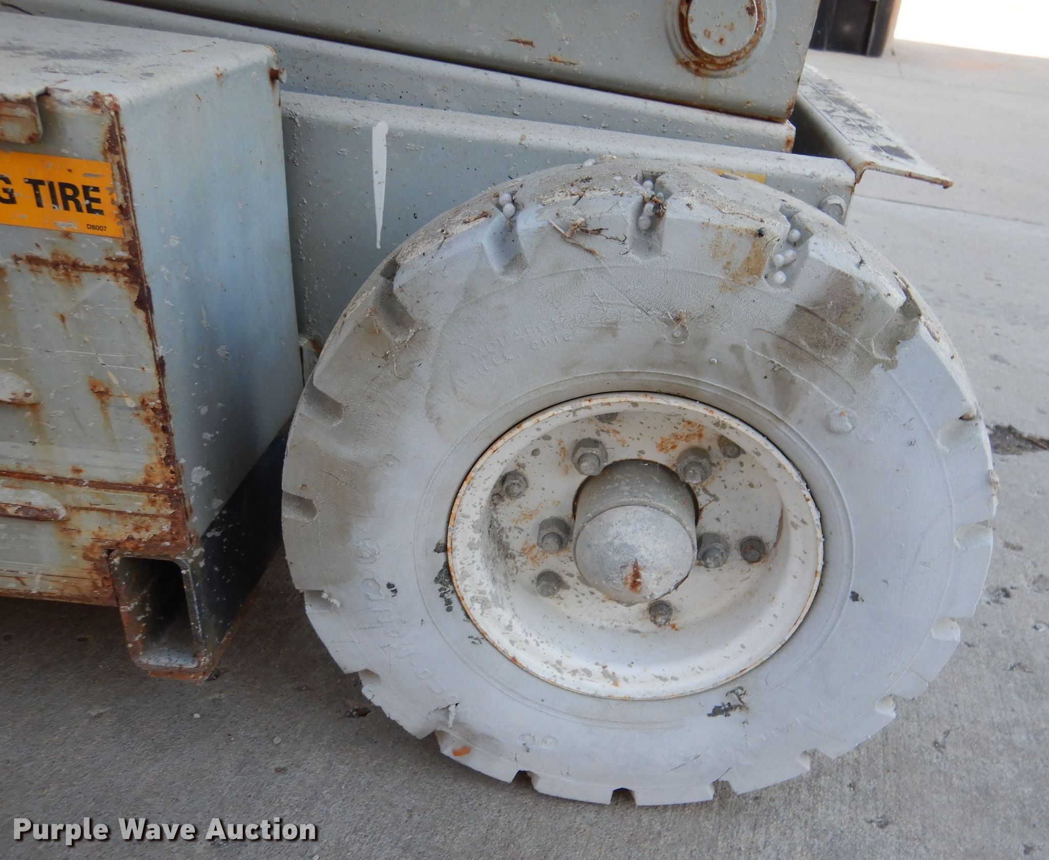 1999 Mec 2548HT scissor lift. Serial: 07104540. Operational Maximum lift capacity: 1,000 lbs, Maximum lift height: 24' 9", Platform: 100" L x 46" W, AC power outlet, Controls: Platform. Tires Tire size: 5.00x8, Solid, Serial 07104540. Haag Oil Company. 4700 NW Hunters Ridge Dr. Topeka, KS 66618