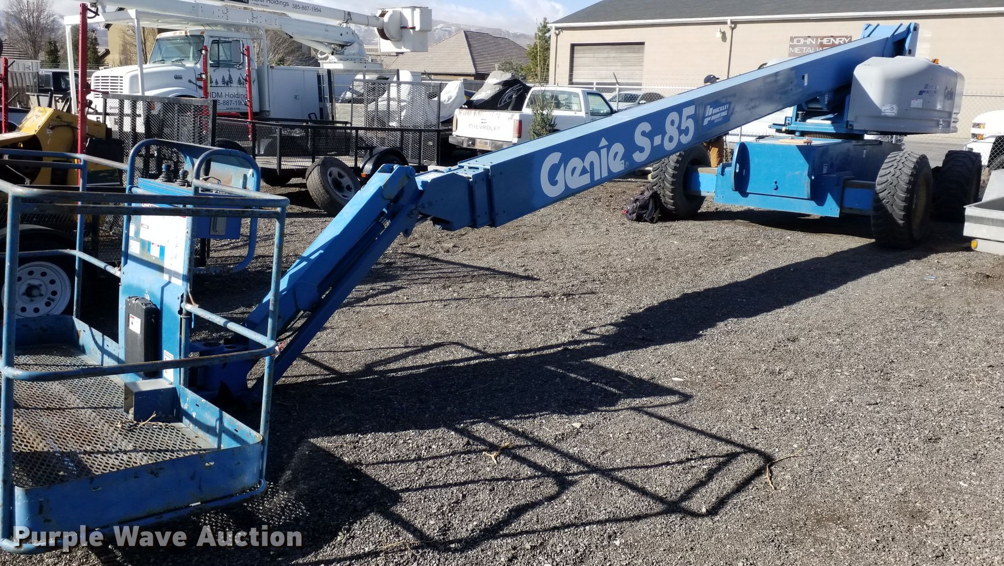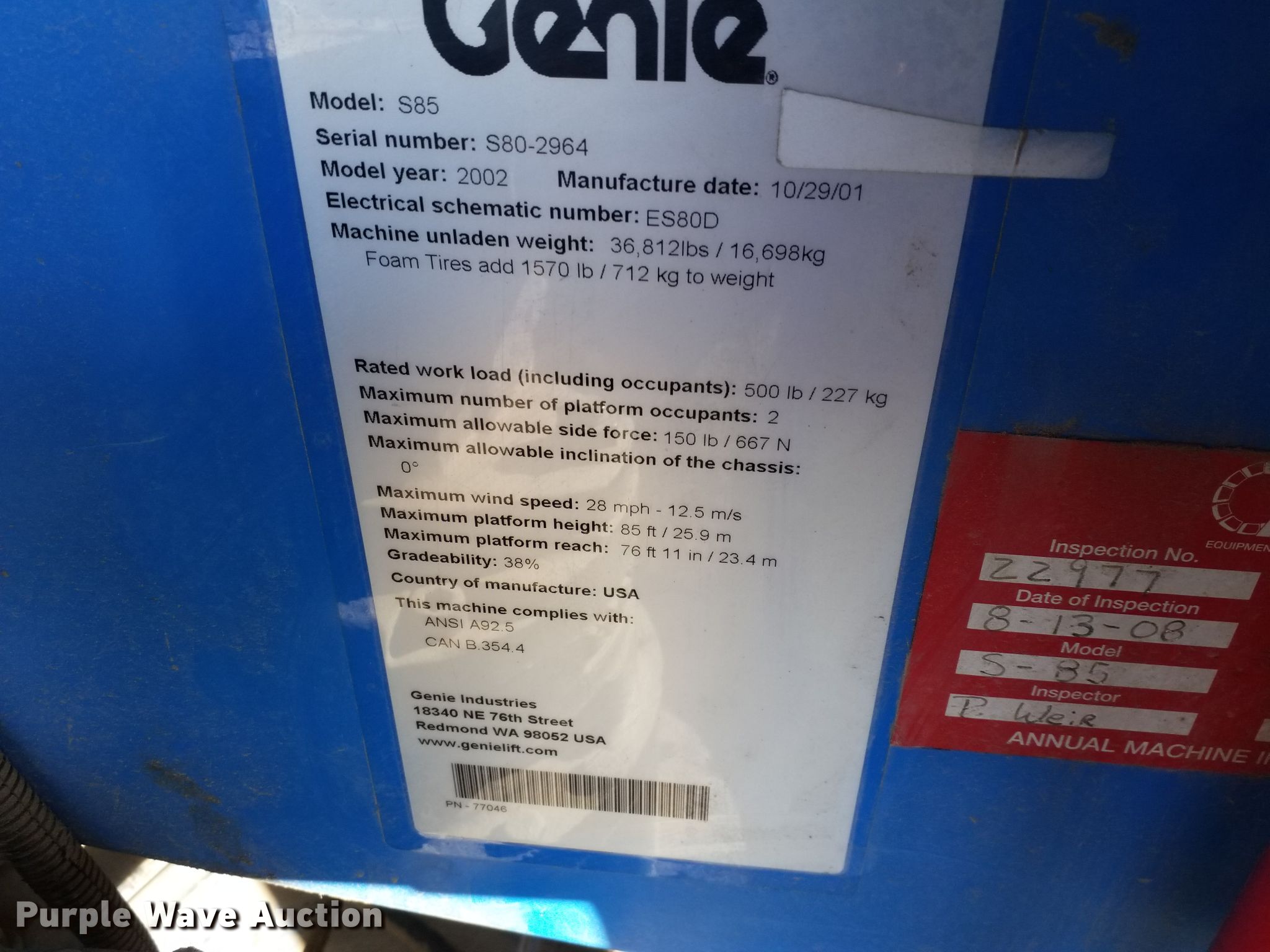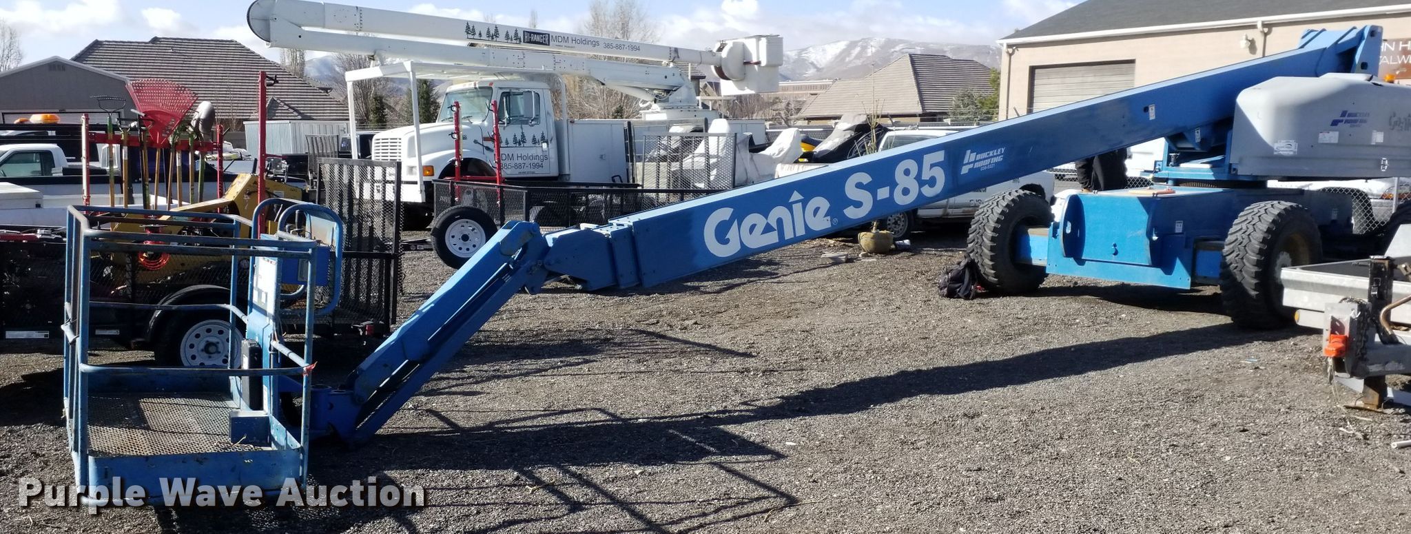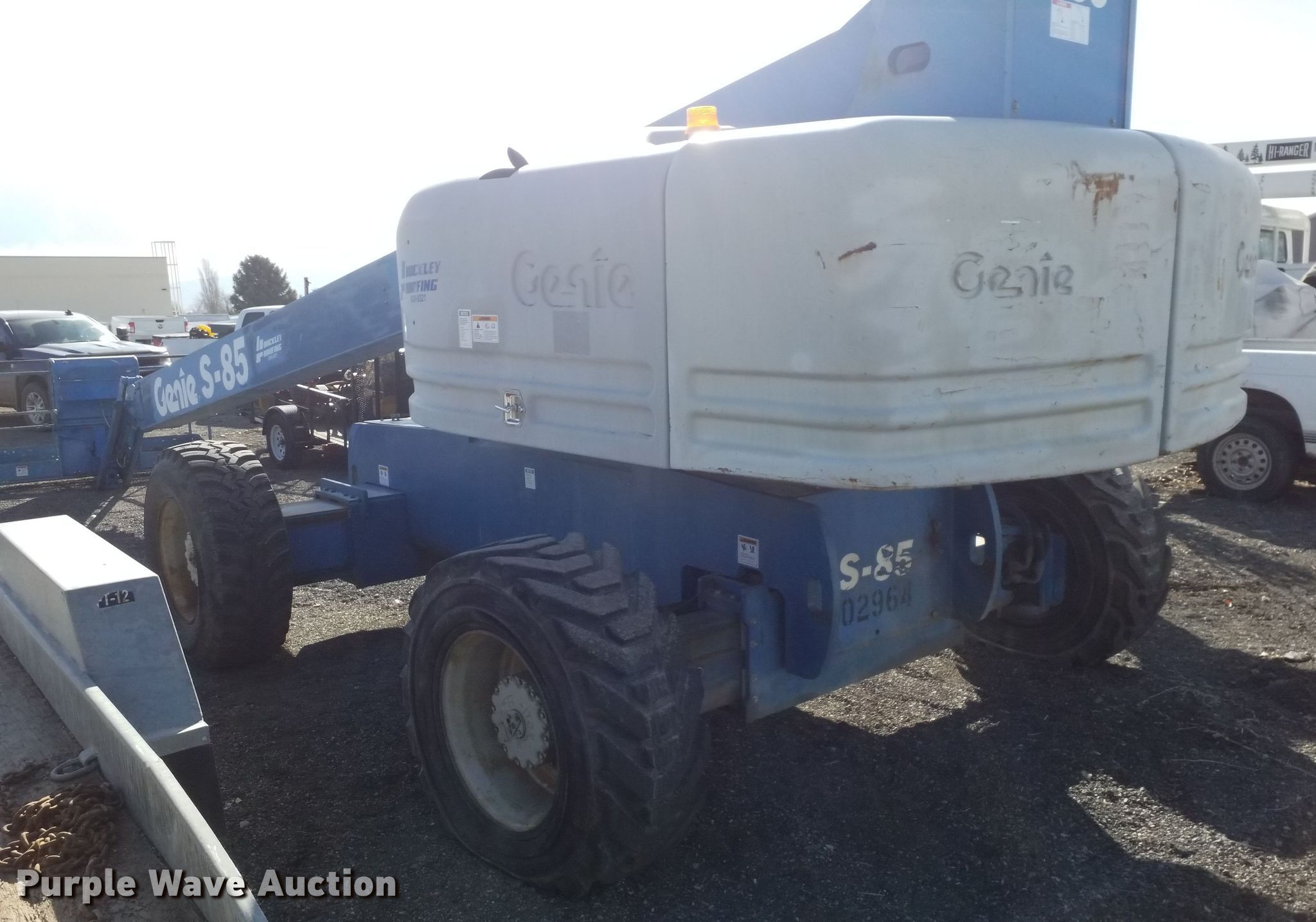 Purple Wave is selling a used Boom Lift in Utah. This item is a 2002 Genie S-85 boom lift with the following: 6,414 hours on meter, Serial: S80-2964
