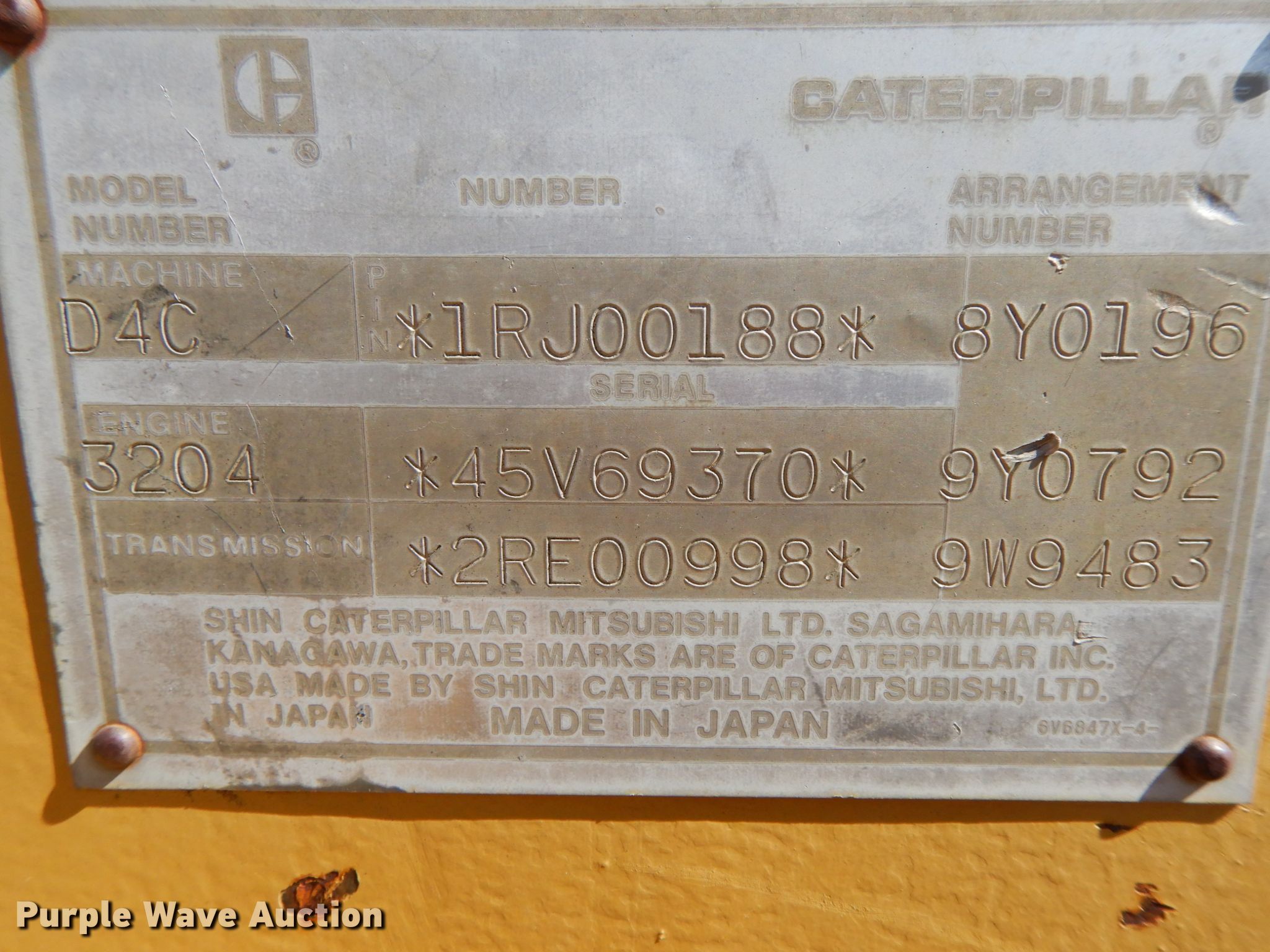 1988 Caterpillar D4C dozer. 5,577 hours on meter, Serial: 1RJ00188. Engine Caterpillar 3406, Serial: 45V69370, Cylinders: 4, Fuel type: Diesel. Transmission Powershift, 3F - 3R. Operators station OROPS, Steering: Clutch brake. Operational Rear drawbar, Dozer blade Type: 6-way, Straight, Width: 96" W. Tracks Width: 16", Grouser pads: Single. Notes Non-operational unit. Murphy Brown of Missouri, LLC. 15068 225th st. Coffey, MO 64636