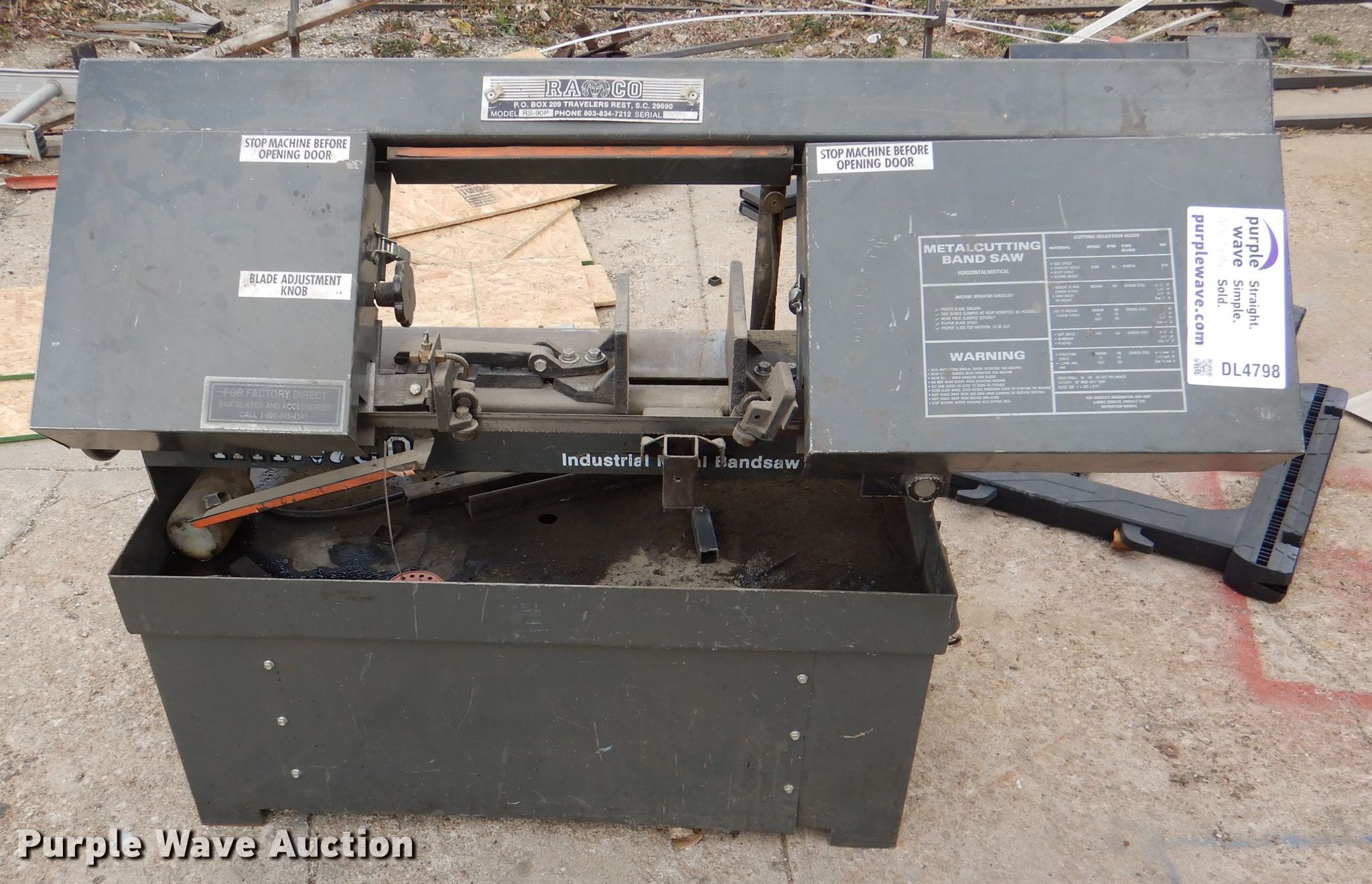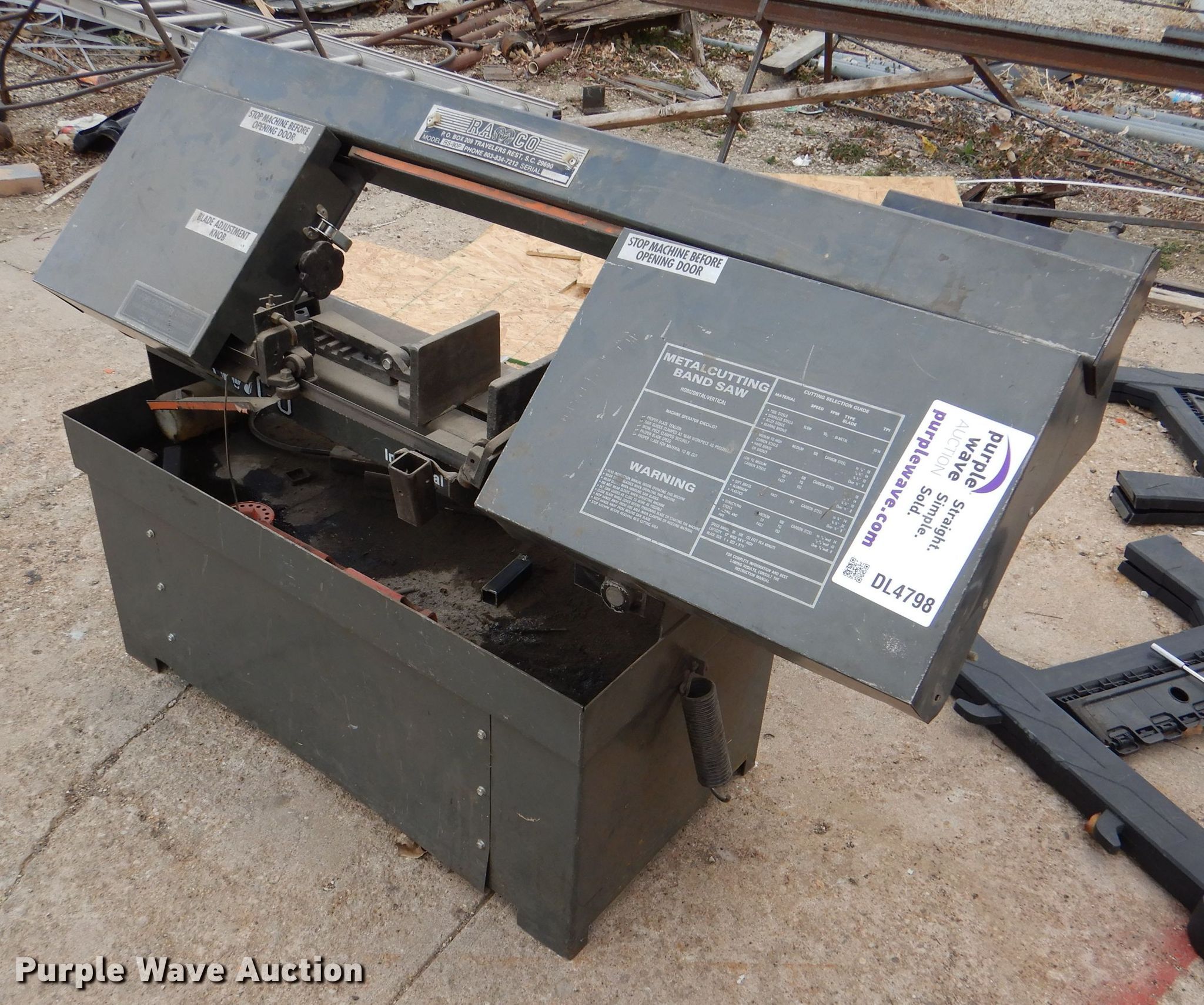 Purple Wave is selling a used Tools in Kansas. This item is a Ramco RS-90P band saw with the following: Single phase, 115V, 48"blade, Non-operational motor, Serial 06059