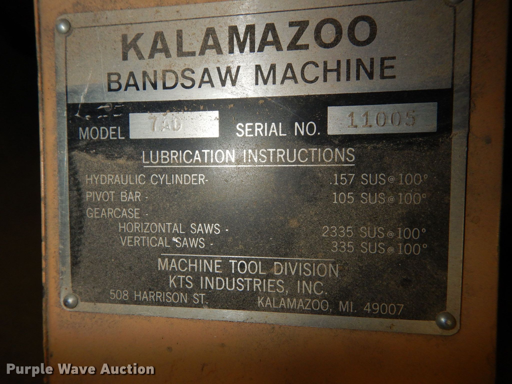 Purple Wave is selling a used Tools in Kansas. This item is a Kalamazoo 7AD metal bandsaw with the following: Serial 11005