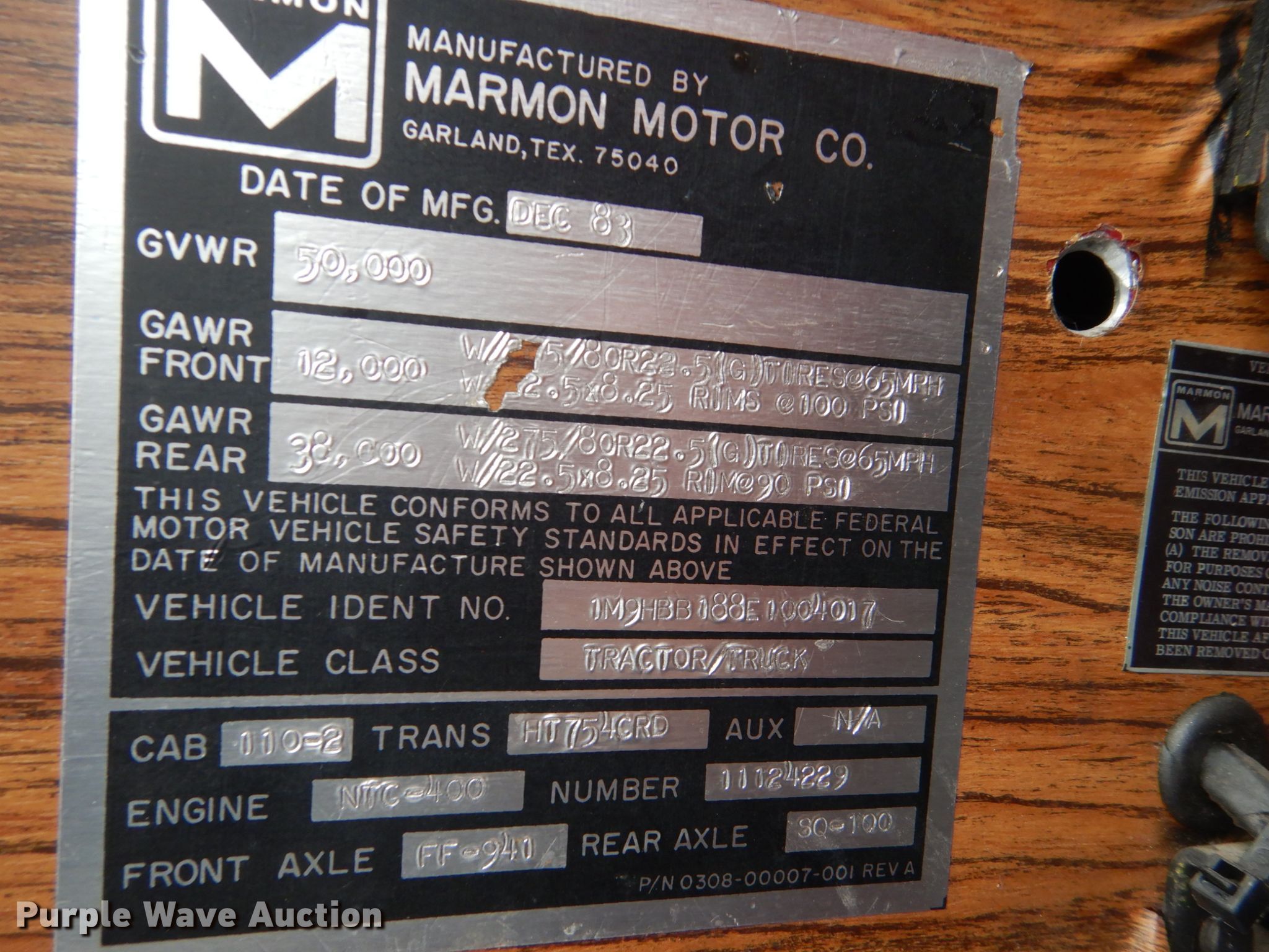 1983 Marmon semi truck. 240,988 miles on odometer, Unit #: I005. Engine Cummins , Cylinders: 6, Fuel type: Diesel, Engine brake. Transmission Automatic. Chassis Axles: Tandem, Differential lock: Inter-axle, Suspension: Air, Brakes: Air, GVWR: 50,000 lbs FAWR: 12,000 lbs, IAWR: 19,000 lbs, RAWR: 19,000 lbs. Interior Heat, Heated mirrors, Sleeper Sleeper length: 36", Beds: Single, Rear climate control. Operational Fifth wheel type: Sliding, Fuel tank: Dual. Tires Size: 295/75R22.5. Notes Generator Engine hours: 1,332, Four cylinder diesel engine. South Dakota title. 1M9HBB188E1004017. State of South Dakota. 104 South Garfield. Pierre, SD 57501