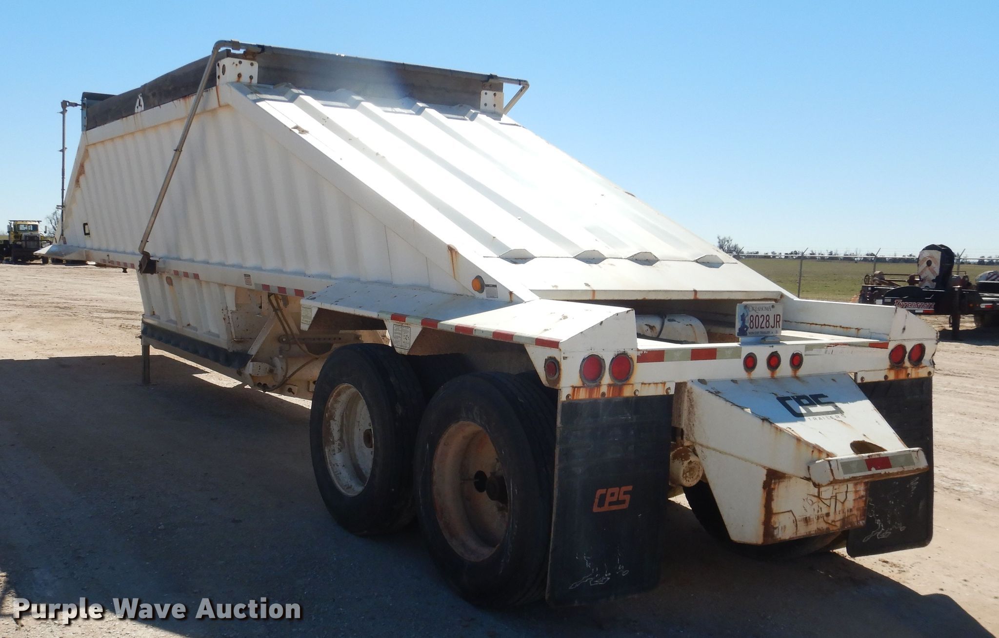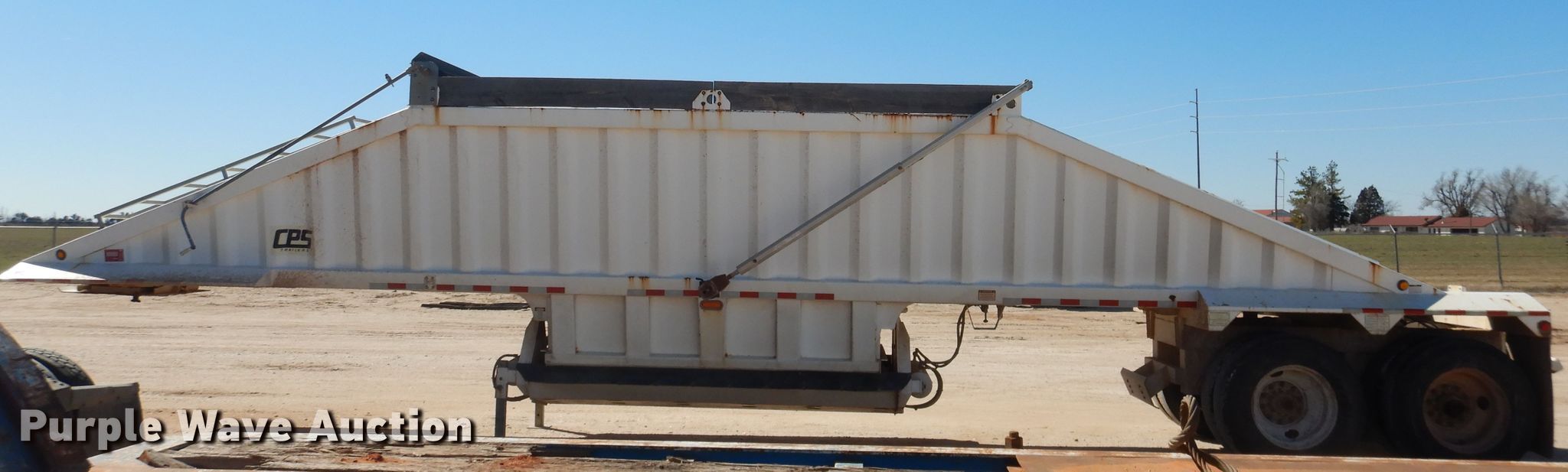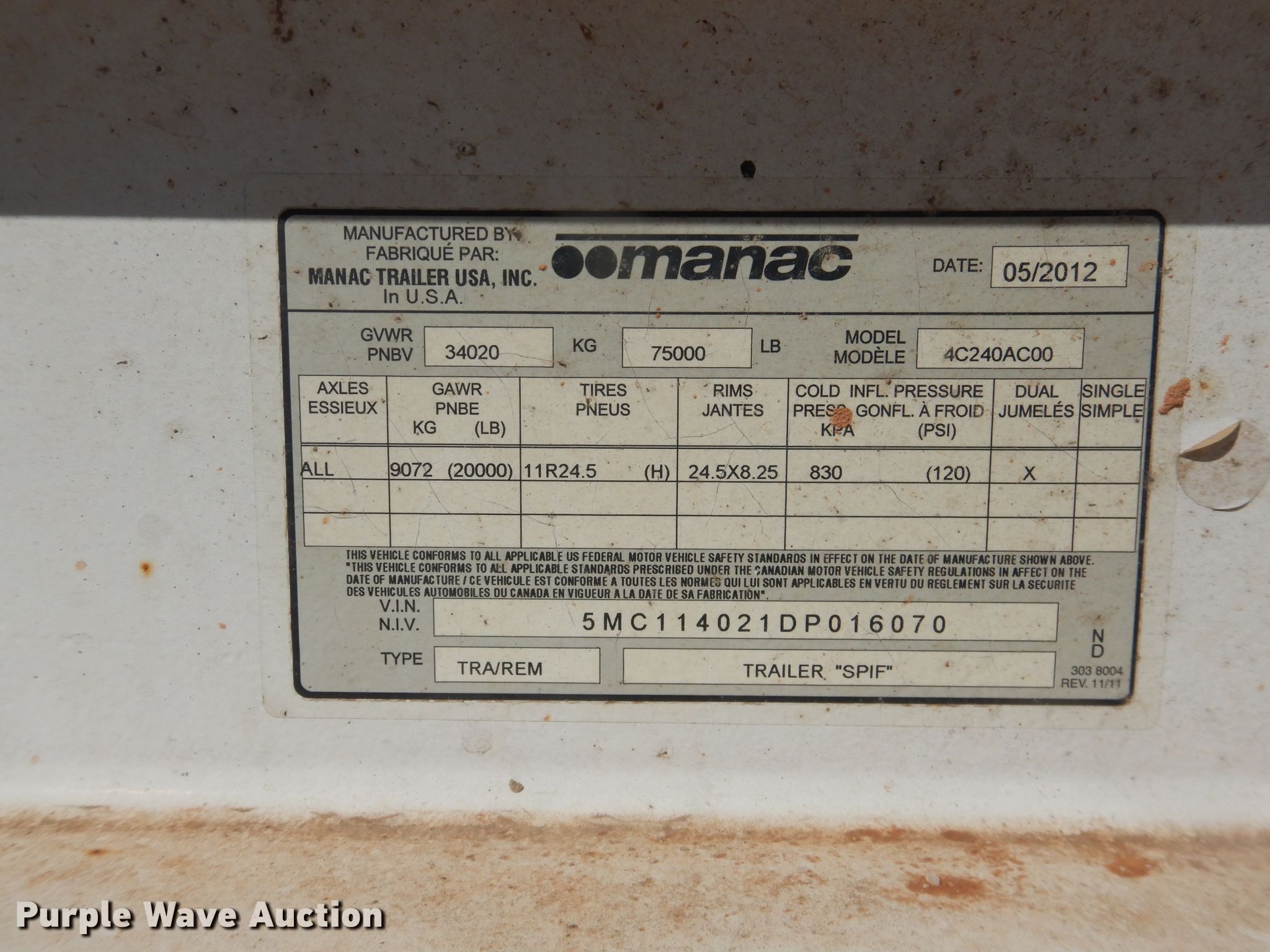 Purple Wave is selling a used Bottom Dump Trailer in Oklahoma. This item is a 2013 Manac 4C240AC00 bottom dump trailer with the following: 42'L x 96"W overall, 59"W side height, Air operated clamshell gate, Trailer controls, Rear push block, Roll tarp, Steel construction, Dual leg landing gear, Air suspension, Air brakes, Tandem axle, Steel wheels, 11R24.5 tires, GVWR 75,000 lbs, GAWR 20,000 lbs