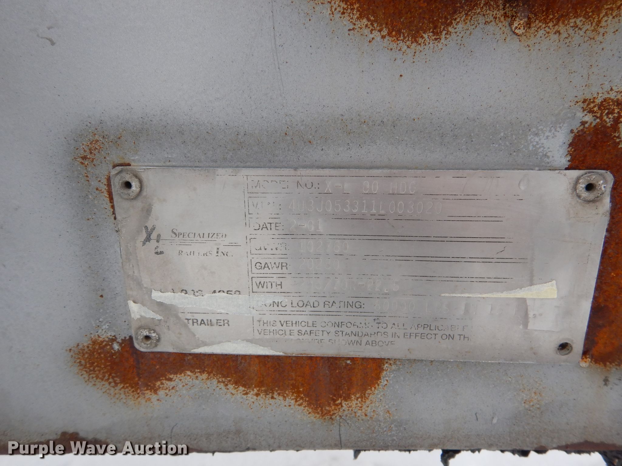 Purple Wave is selling a used Equip. Trailer in Minnesota. This item is a 2001 XL Specialized XL80HDG equipment trailer with the following: 53'L x 102"W overall, 40'5"L main deck, Wood deck, 12" swingouts, 8'L hydraulic ramps, Detachable neck, Manual hydraulic controls, Air suspension, Air brakes, Triple axle, Steel wheels, 225/70R22.5 tires, GVWR 102,760 lbs, No lights