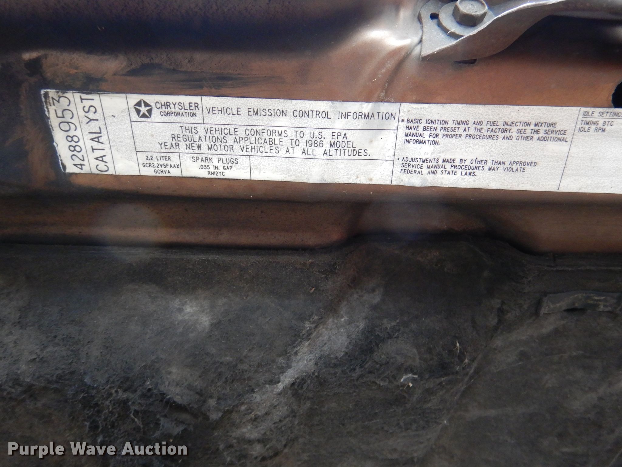 1986 Chrysler Lebaron. Unknown miles on odometer. Engine Displacement: 2.2L L4 SOHC 8V, Cylinders: 4, Fuel type: Gas. Transmission Automatic. Interior AC, Heat, Power windows, Power locks. Tires Size: 185/70R14. Notes Dead battery. Kansas non highway no liability insurance title. Title distribution may be delayed up to 14 days from verification of funds. Mileage has not been verified. Exempt will be written in the odometer disclosure on the title. 1C3BC55E7GG147763. 1822 E 1450th Rd. Lawrence, KS 66049