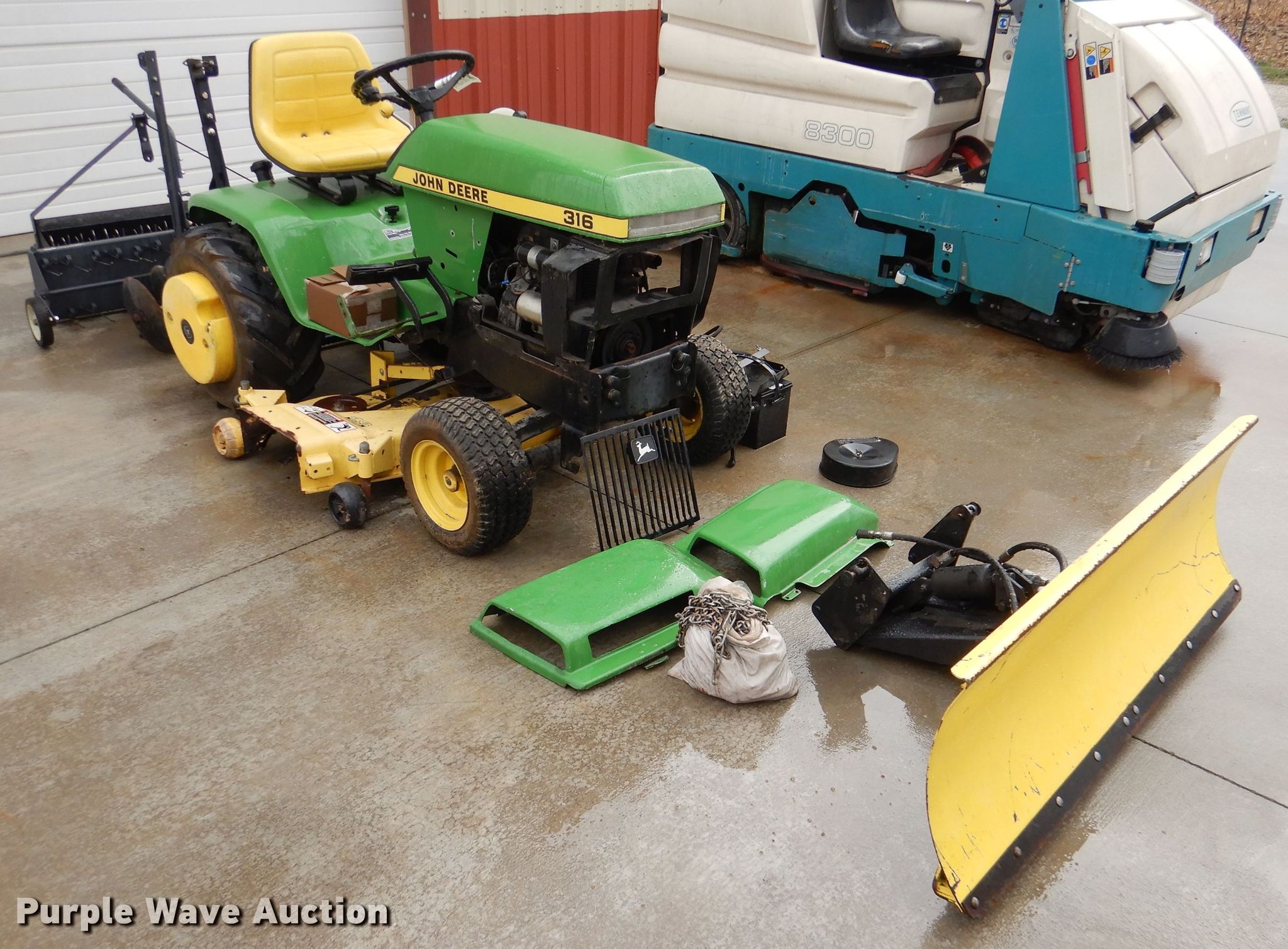 John Deere 316 lawn mower. 823 hours on meter, Cutting width: 48", Serial: C316G080098M. Engine Kohler, Cylinders: 1, Fuel type: Gas, HP: 16. Transmission Hydrostatic. Operational Self- propelled, Front blade Width: 54", Mower deck Width: 48", Brinly disk Width: 36", Ridged harrow Width: 43", Aerator Width: 36", Hitch: Sleeve. Tires Front: 16x6.50-8, Rear: 23X10.50-12. Notes Non-operational engine, disassembled, Non-operational unit. Pro Sweep. Topeka, KS 66616