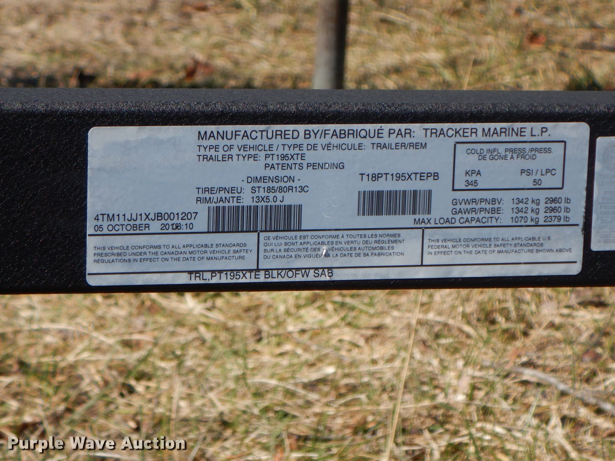 2018 Tracker PT195XTE boat trailer. 21'L x 96"W, 2" ball hitch, 185/80R13 tires, GVWR 2,960 lbs. Missouri title. Seller is a Missouri licensed motor vehicle dealer. Title will be assigned and distributed by the dealer. Please contact the seller for distribution questions. 4TM11JJ1XJB001207. Marine Center Inc.. 13580 MO-43. Seneca, MO 64865