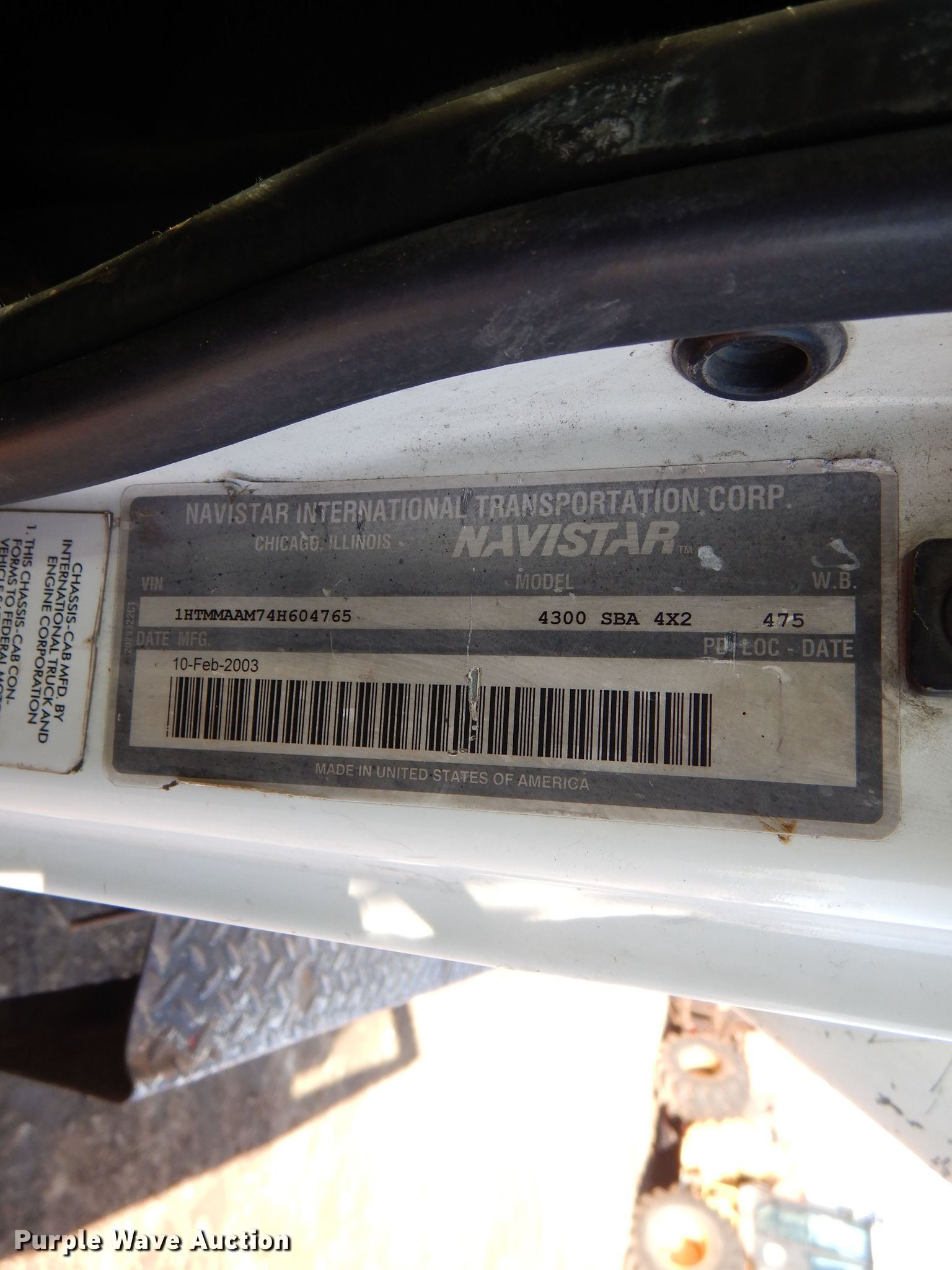 2004 International 4300 forestry bucket truck. 161,629 miles on odometer, Engine hours: 19,753, Unit #: 765. Engine International DT466, Displacement: 7.6L, Cylinders: 6, Fuel type: Diesel. Transmission Manual, Speed: 6. Chassis Axles: Single, Suspension: Spring, Brakes: Hydraulic, PTO, GVWR: 25,999 lbs, Wheelbase: 186". Interior Heat, Brake controller. Operational Chip bed Arbortech, Serial: W43-0089, Length: 15' 3", Dump bed Length: 11', Width: 92", Side height: 60", Hoist: Single cylinder, Boom 2003 Terex Hi-Ranger XT5, Serial: 2030221458, Maximum lift capacity: 350 lbs, Maximum lift height: 55', Boom type: Articulating, Insulated, Man basket, Boom controls Platform/ basket.. Tires Size: 295/75R22.5. Notes Dash warning indicator: ABS, Windshield chipped or cracked, Damaged tailgate latch. Kansas title. Vehicle has an E-Title in the State of Kansas. A paper title will be distributed to the buyer within 30 days from verification of funds. 1HTMMAAM74H604765. Custom Tree Care. 3431 SE 21st St. Topeka, KS 66607