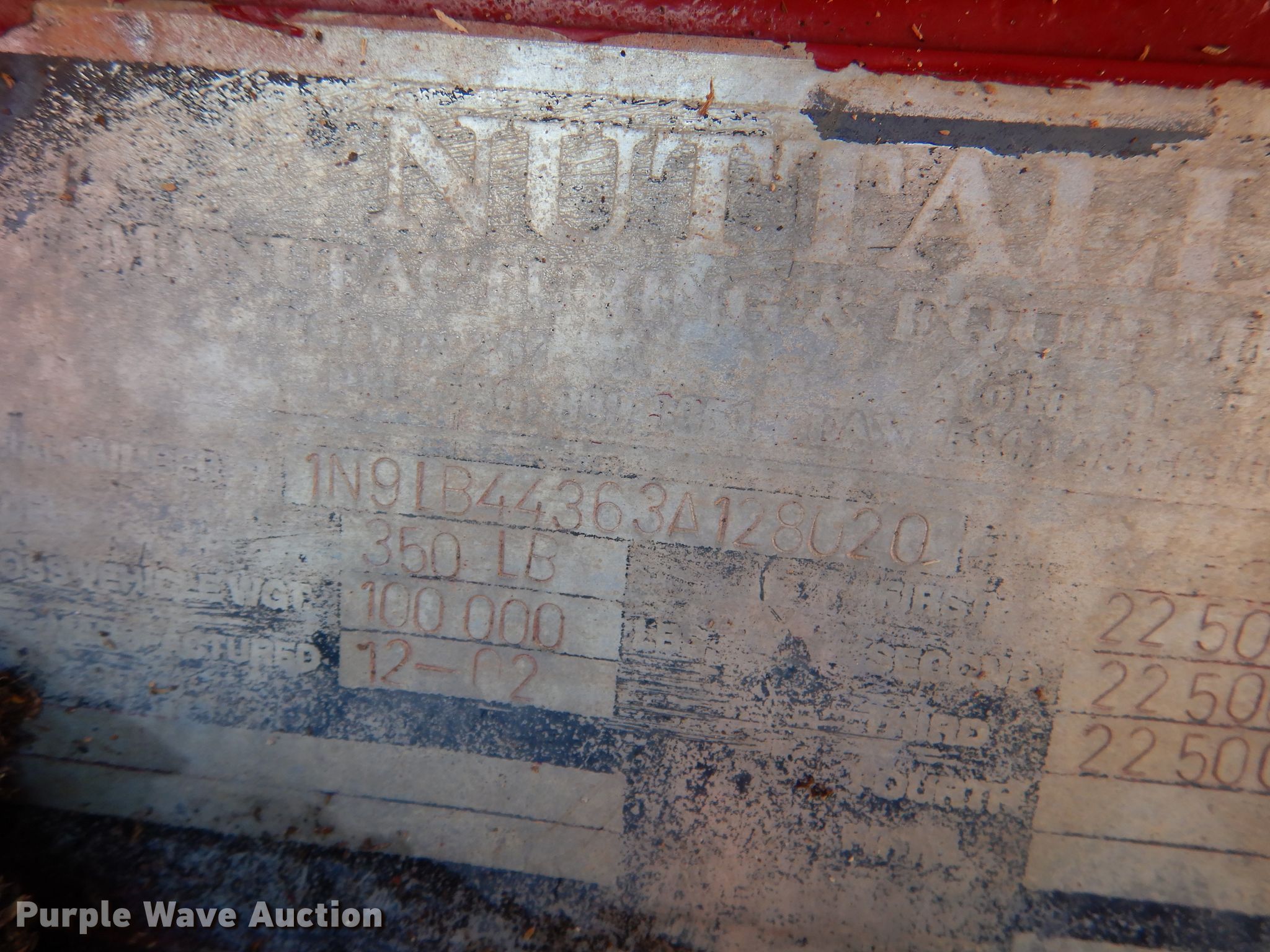 Nuttall drop deck equipment trailer. 45'L x 102"W overall, 30'L x 102"W deck, 5'L tail, 4'L ramps, Wood deck, Dual leg landing gear, Spring suspension, Air brakes, Triple axle, Steel wheels, 255/70R22.5 tires, GVWR 100,000 lbs, GAWR 22,500 lbs. Kansas title. Title has a lien that will be released following the close of the auction. Title distribution may be delayed up to 30 days from verification of funds. 1N9LB44363A128020. Custom Tree Care. 3431 SE 21st St. Topeka, KS 66607