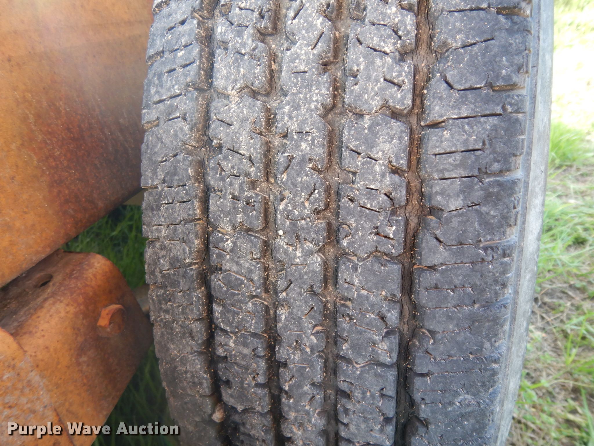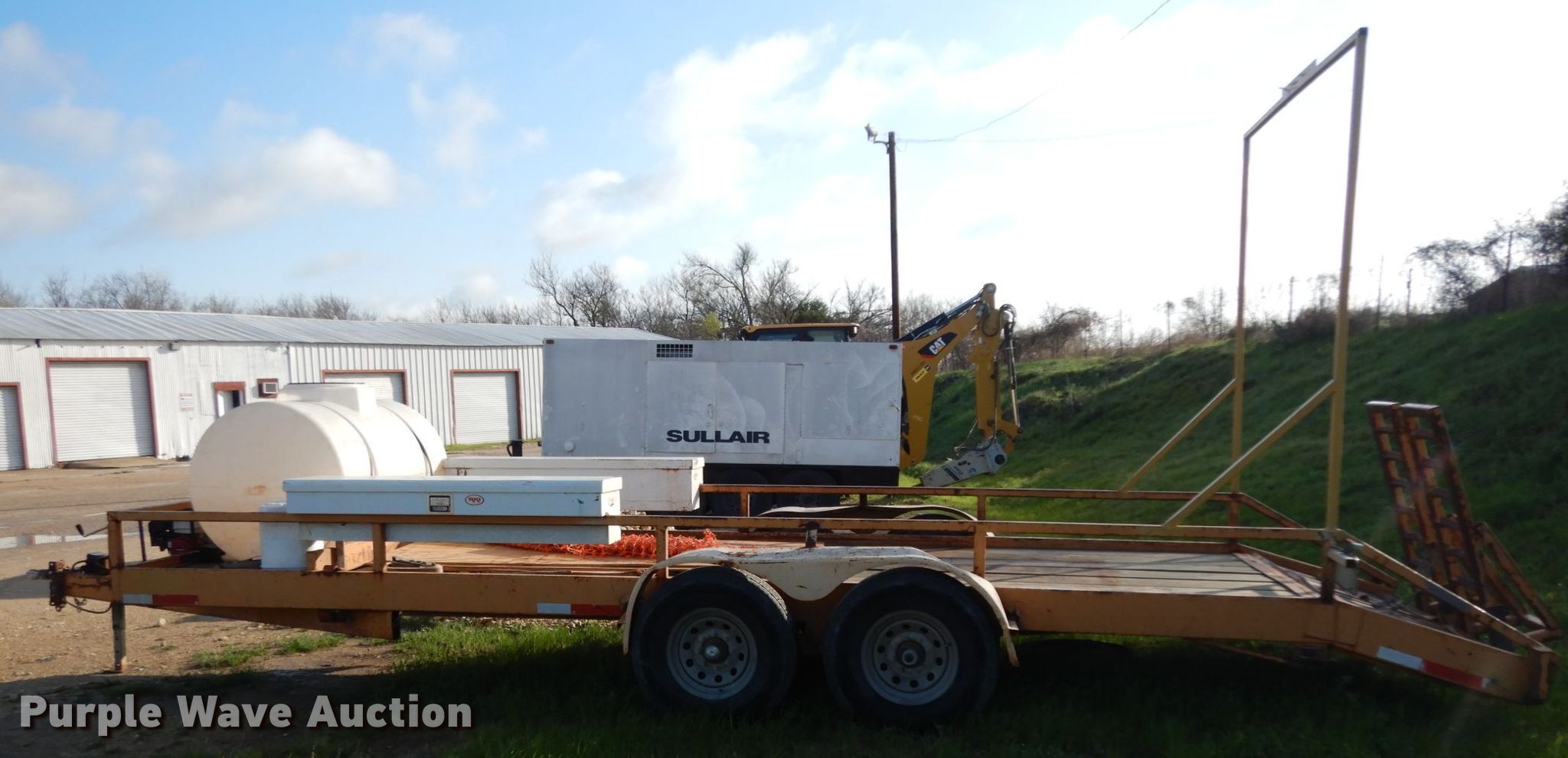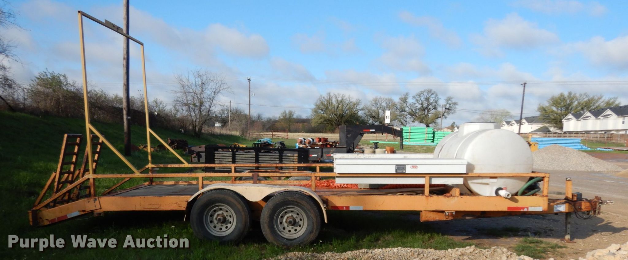 Purple Wave is selling a used Equip. Trailer in Texas. This item is a 2004 Shop built utility trailer with the following: 28'L x 102"W overall, 20'L x 82"W deck, 3'L tail, 4'L ramps, 2 5/16" ball hitch, Wood deck, Poly tank, Capacity: 300 gallons, Wacker 2" pump, Single leg landing gear, Spring suspension, Electric brakes, Tandem axle, 235/85R16 tires