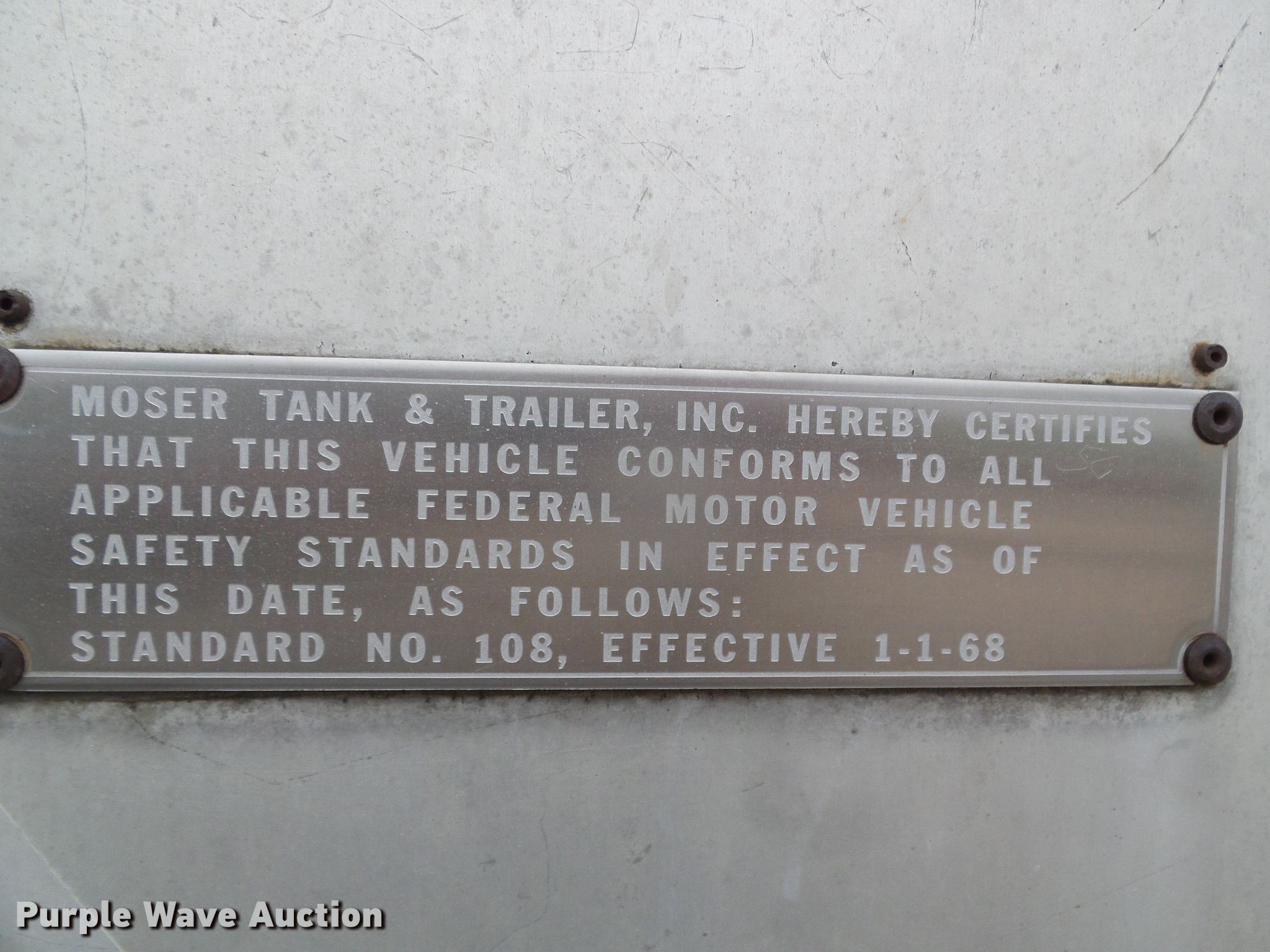1959 Moser tank trailer. 38'L x 96"W overall, Aluminum trailer, Dual leg landing gear, Spring suspension, Air brakes, Tandem axles, Steel wheels, 11R24.5 tires. Title distribution may be delayed up to 14 days from verification of funds. Scott County Public Works. 481 E Rd 160. Scott City, KS 67871