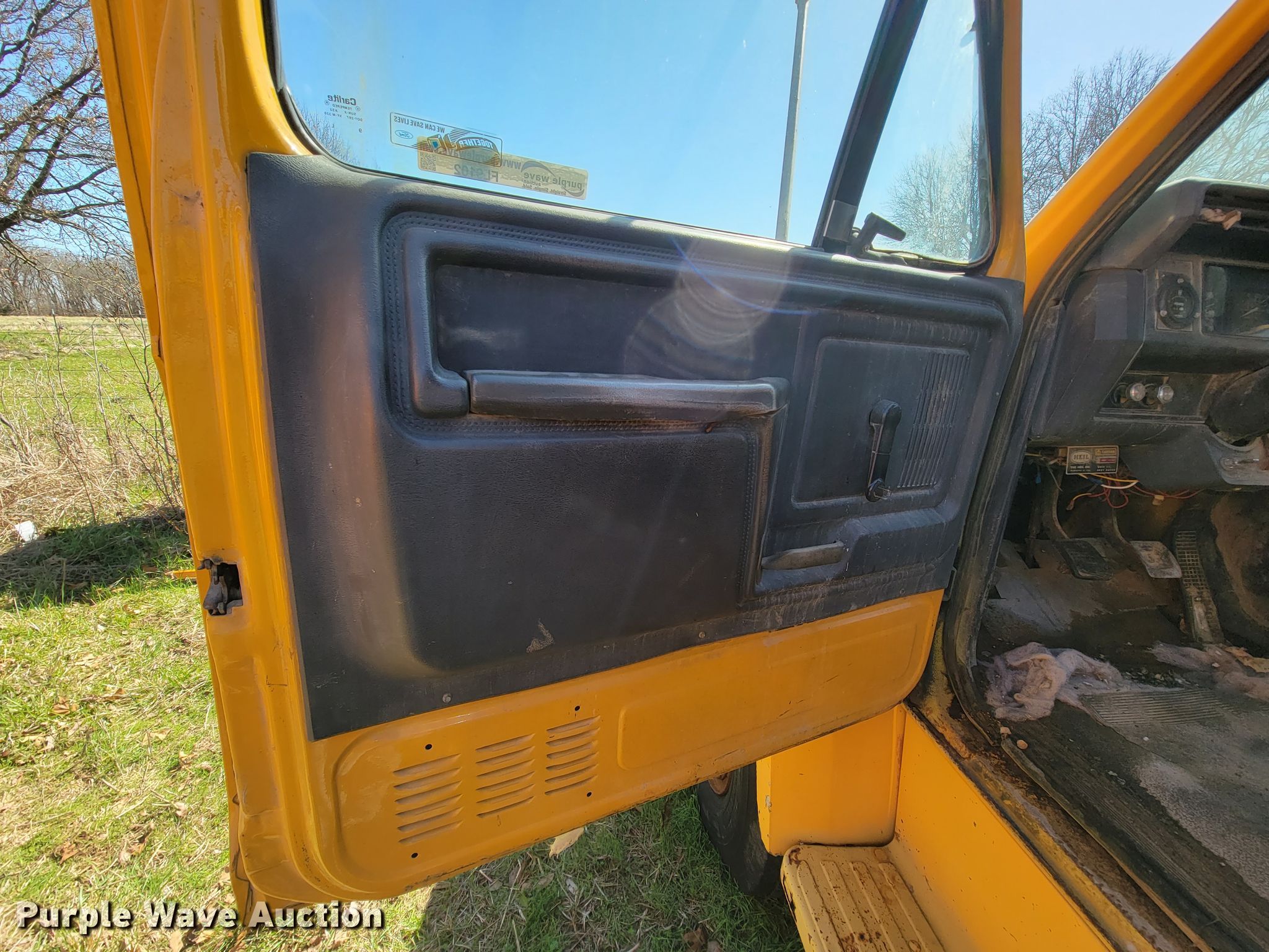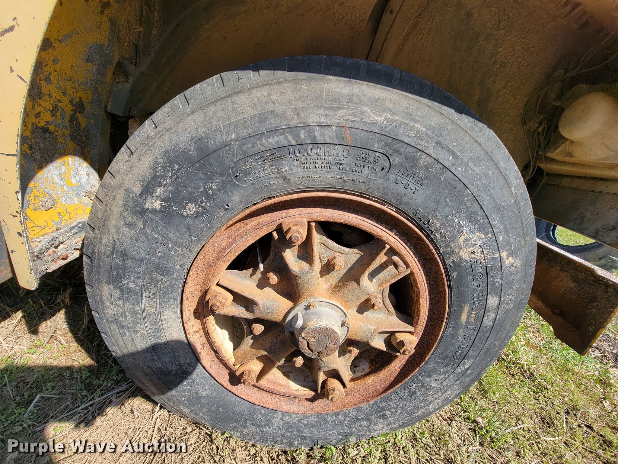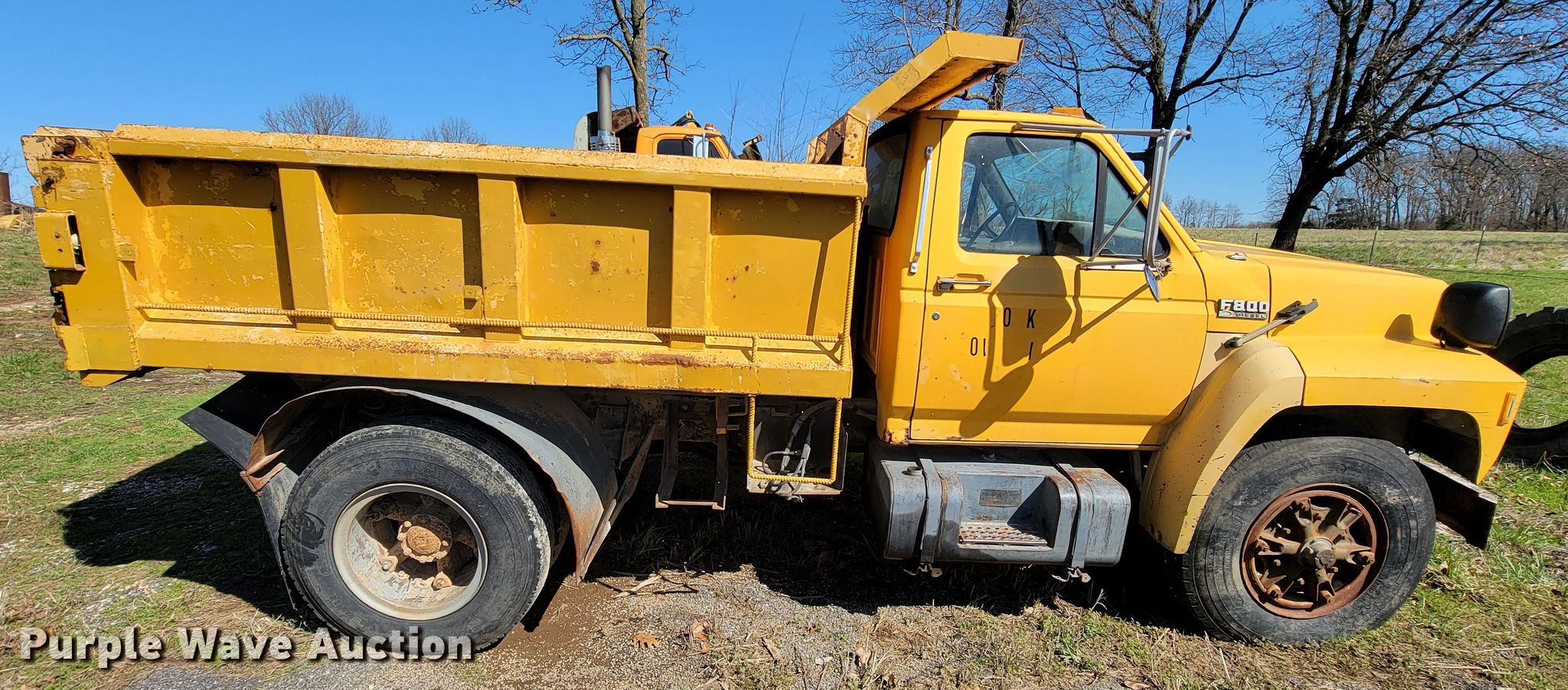 1990 Ford F800 dump truck. 51,020 miles on odometer. Engine Displacement: 7.8L, Cylinders: 6, Fuel type: Diesel. Transmission Manual, Speed: 10. Chassis Axles: Single, Suspension: Spring, Brakes: Air, PTO, GVWR: 27,000 lbs, Wheelbase: 141". Operational Dump bed 9' L x 96" W, Side height: 28", Bed type: Steel, Ram: Single , End gate: Manual. Tires Front: 10.00R20, Rear: 9.00R20. Notes Unknown operating condition. Missouri title. 1FDPK84A5LVA31063. Dade County. 478 S Dade 217. Everton, MO 65646