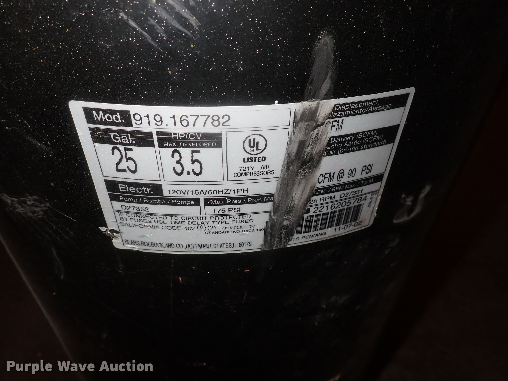 Purple Wave is selling a used Air Compressor in Kansas. This item is a Craftsman 919167782 air compressor with the following: Volts: 120, Phase: Single