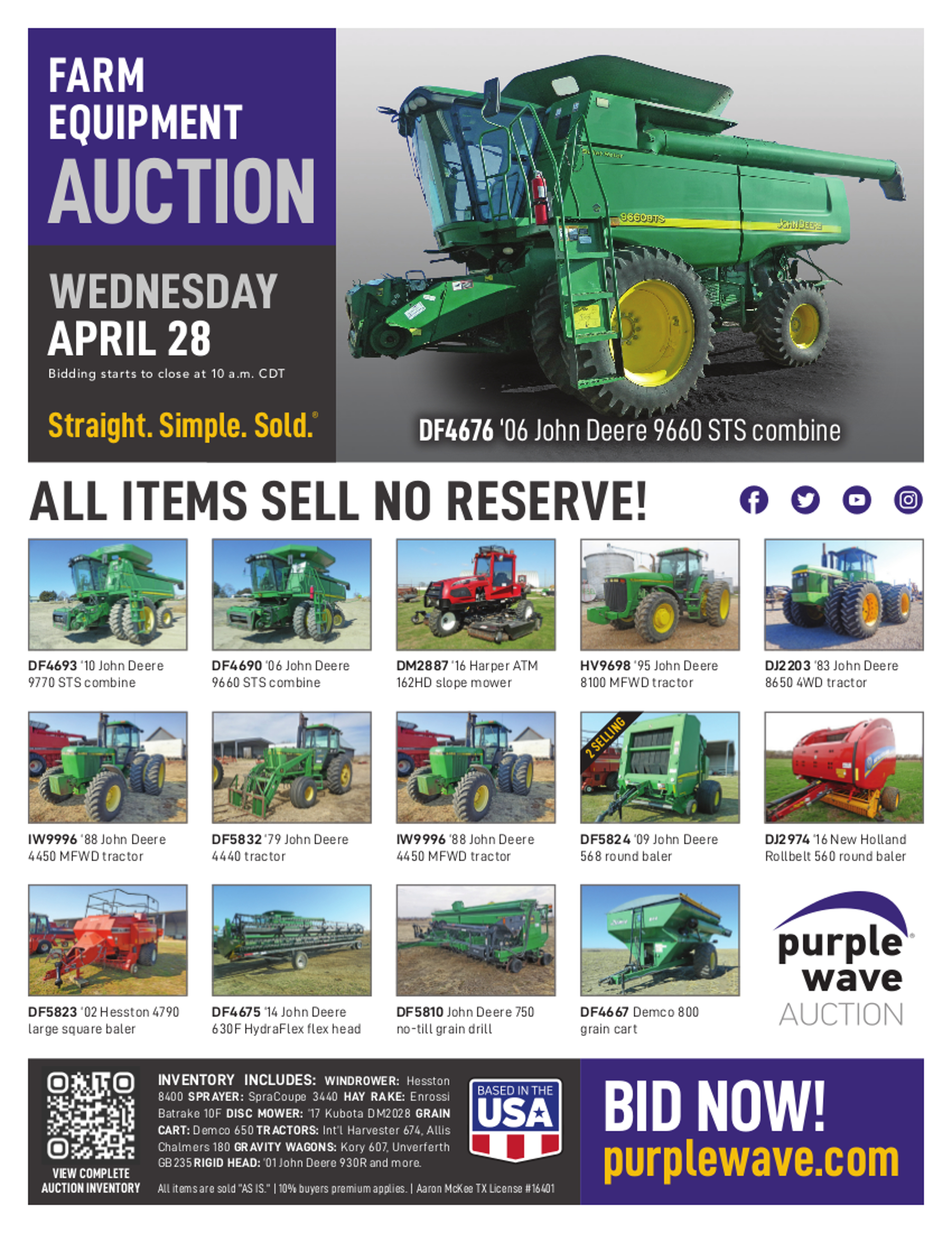 This auction is conducted by Purple Wave, Inc., whose home office is 825 Levee Drive, Manhattan, Kansas. Aaron McKee, Texas auctioneer license # 16401, operates Purple Wave, Inc. Complaints against us may be directed to the Texas Department of Licensing and Regulation, P.O. Box 12157, Austin, Texas 78711, (512) 463-6599. For additional required information, see the attached document.