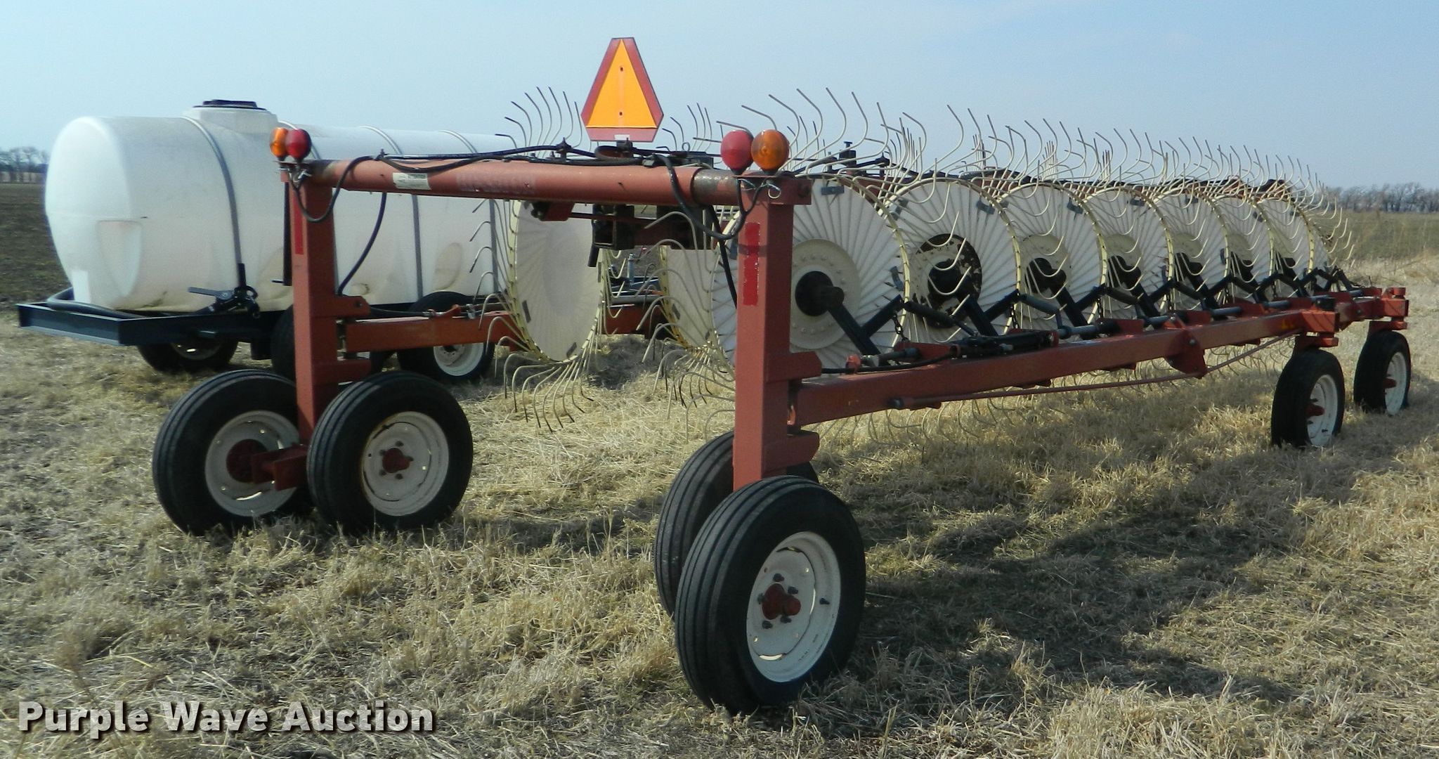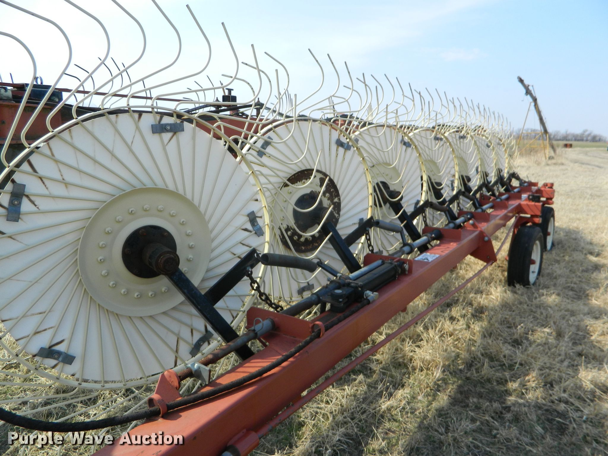Purple Wave is selling a used Hay Rake in Kansas. This item is a Hesston 3986 hay rake with the following: (16) 55" diameter wheels, Hydraulic lift and fold, Transport lights, 6.70-15 tires, Serial 3986N0615