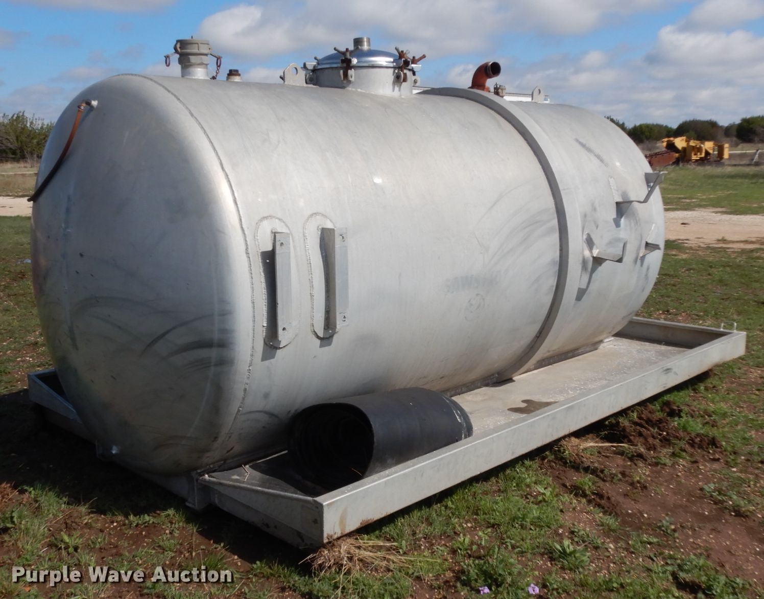 Purple Wave is selling a used Tanks in Texas. This item is a Progress water tank with the following: 2000 gallon capacity, Aluminum, 12'L x 65"D tank, 11'8"L x 8'W pan