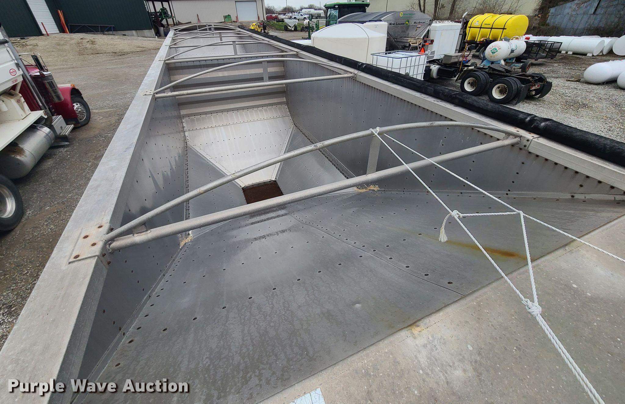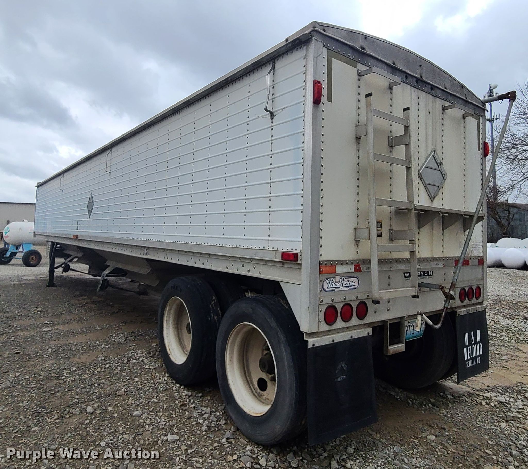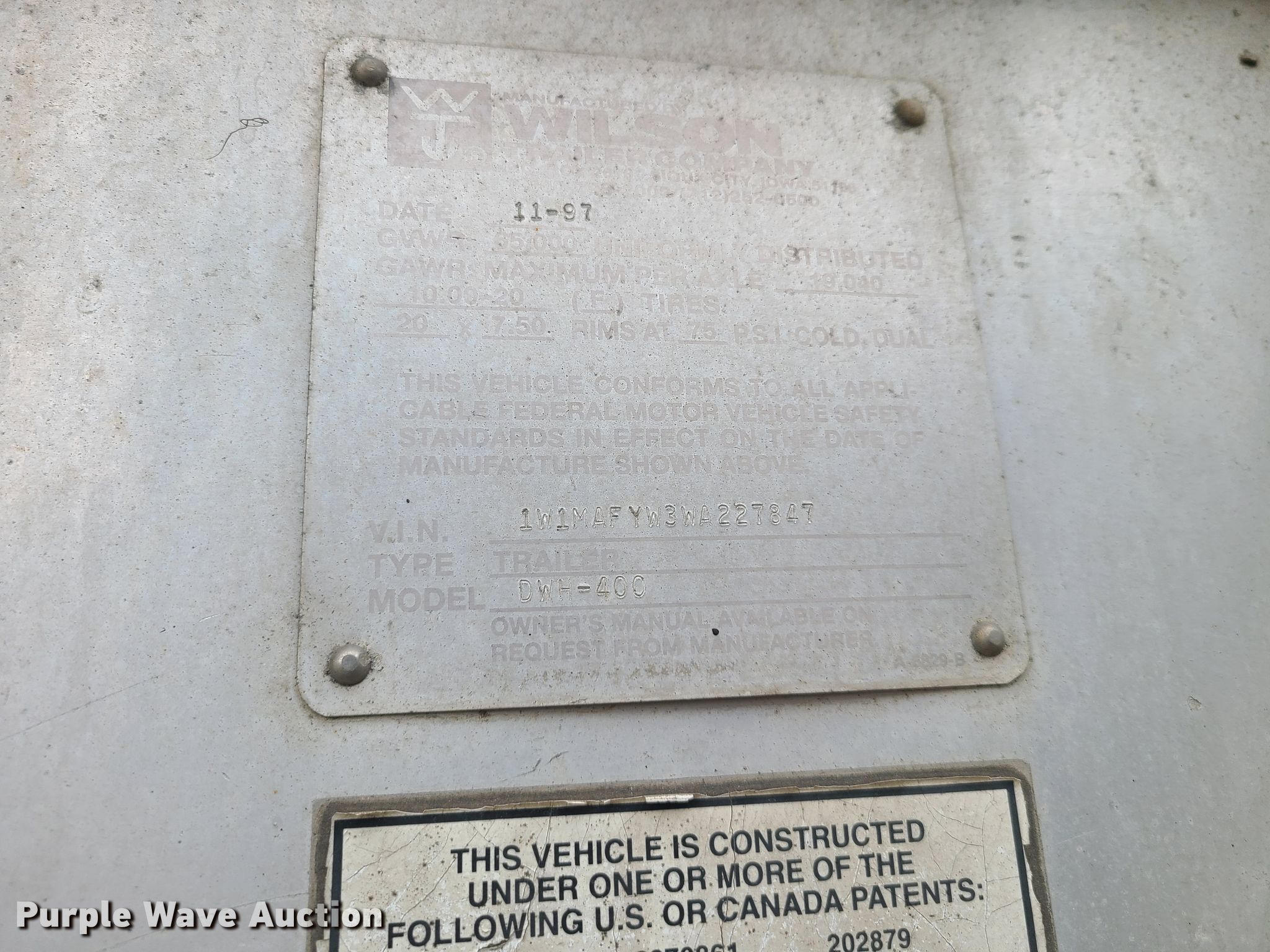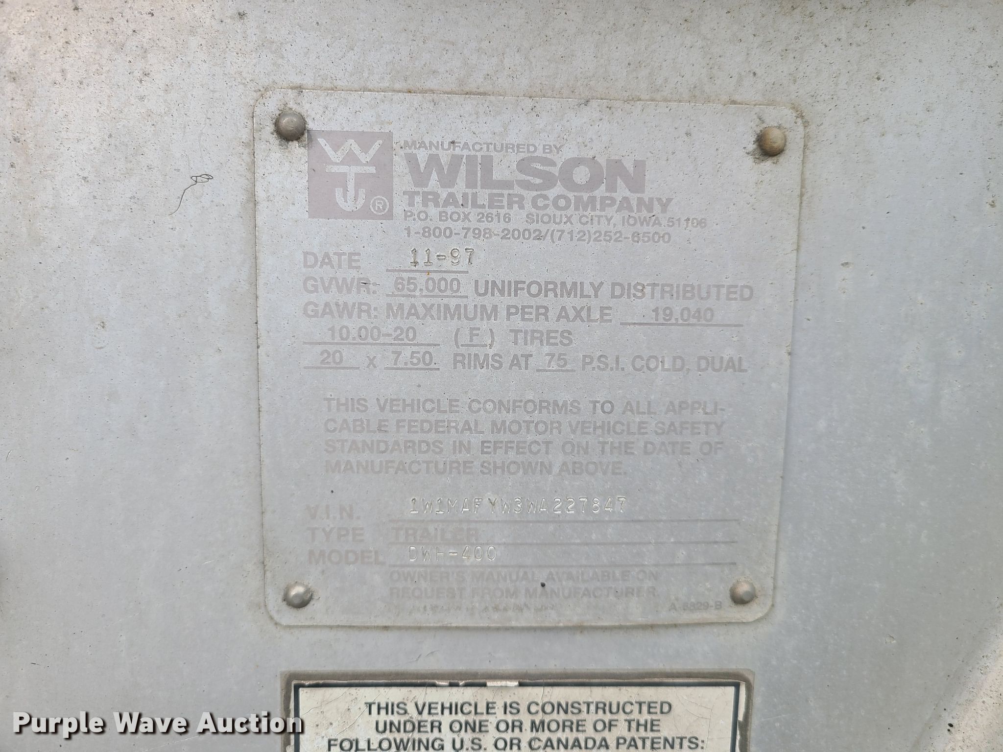 Purple Wave is selling a used Grain or Commodity Trailer in Missouri. This item is a Wilson DWH-400 grain trailer with the following: 42'L x 96"W overall, 56" side height, Hoppers: Double, Trap gates: Manual, Roll tarp, Dual leg landing gear, Air suspension, Air brakes, Tandem axle, 285/76R24.5 tires, GVWR 65,000 lbs