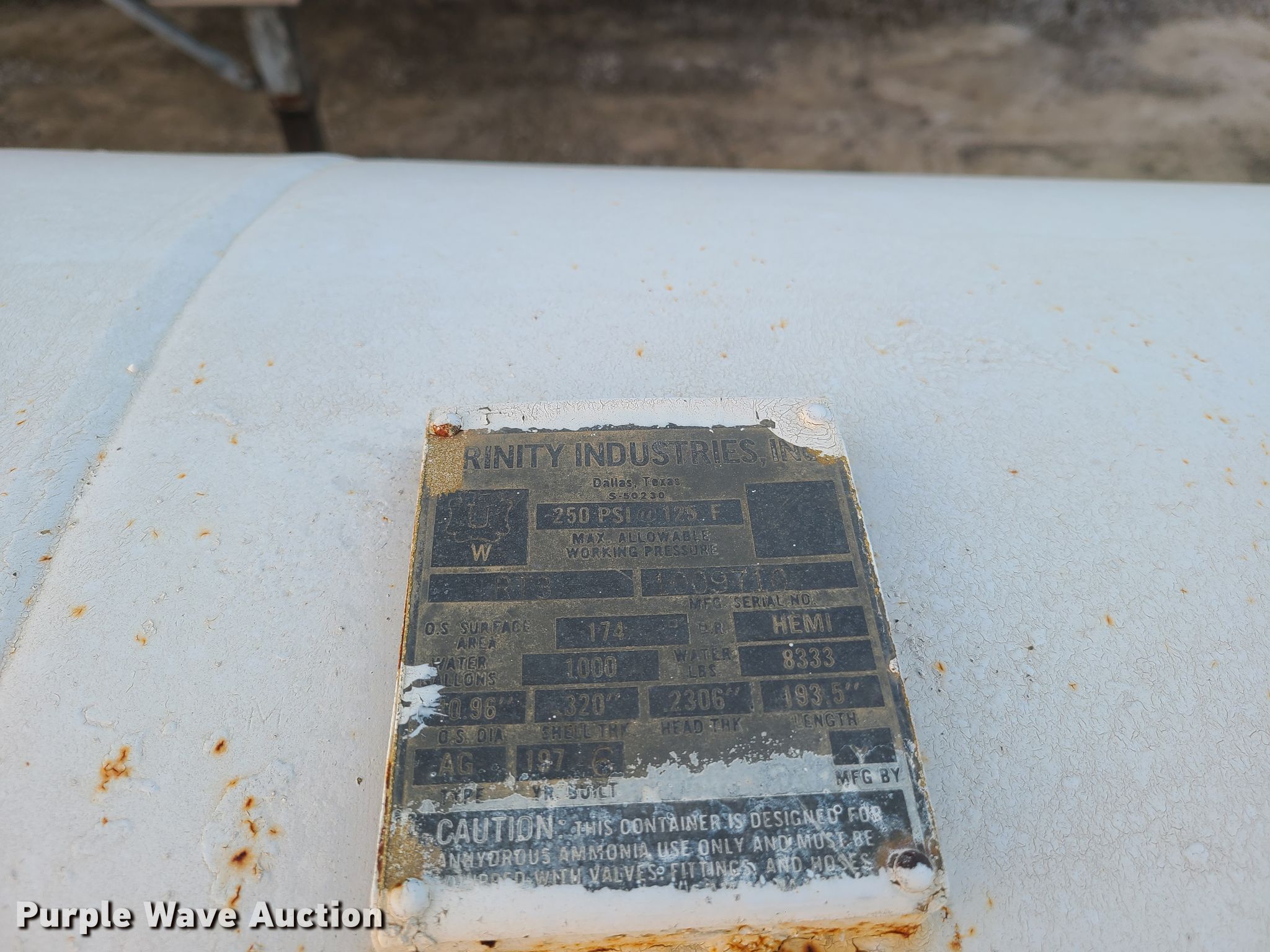 NH3 tank. 1,000 gallon capacity, 11-15 tires, Serial 1009710. Ag Co-op Services. 2420 Clinton Rd. Sedalia, MO 65301