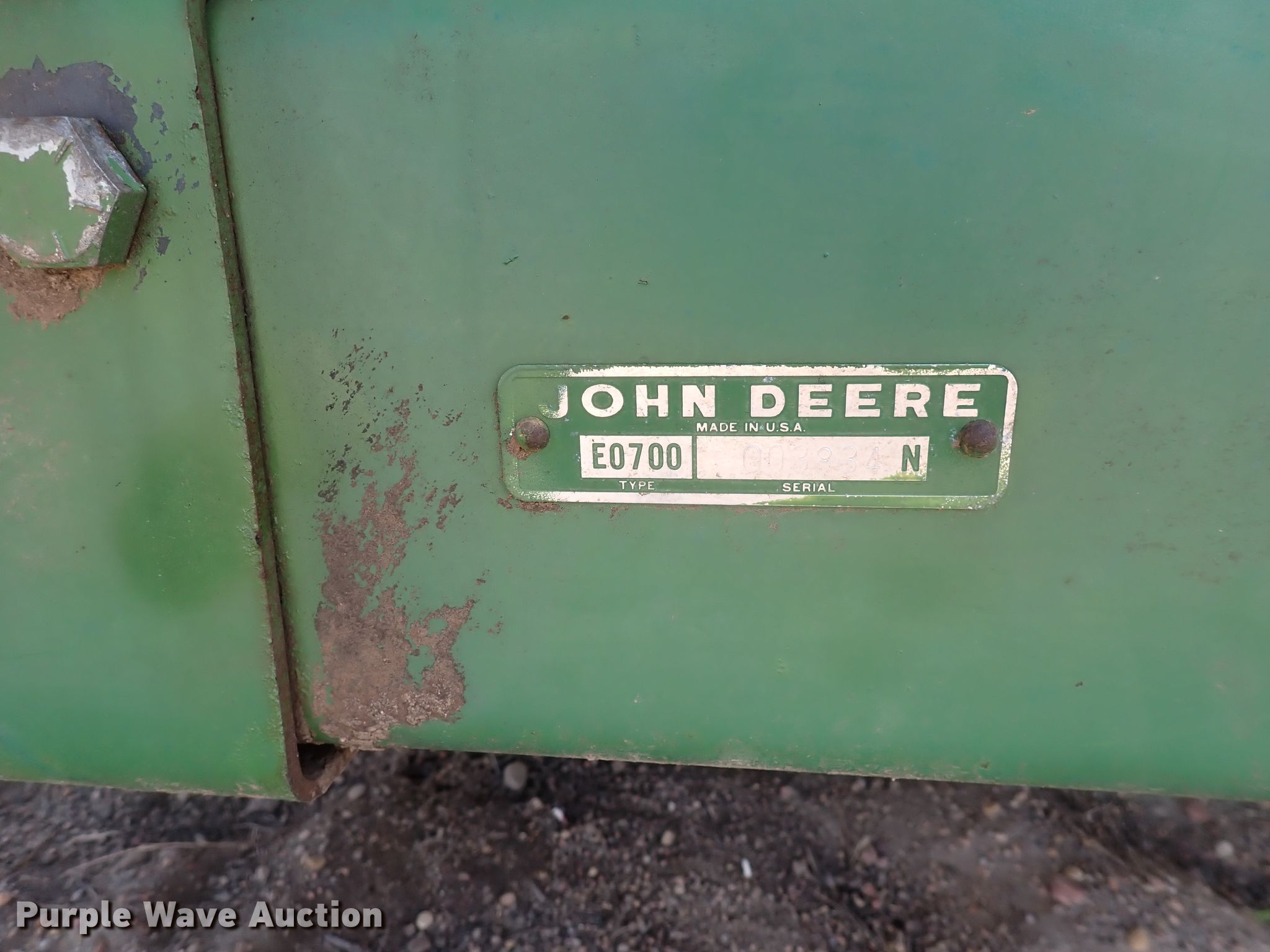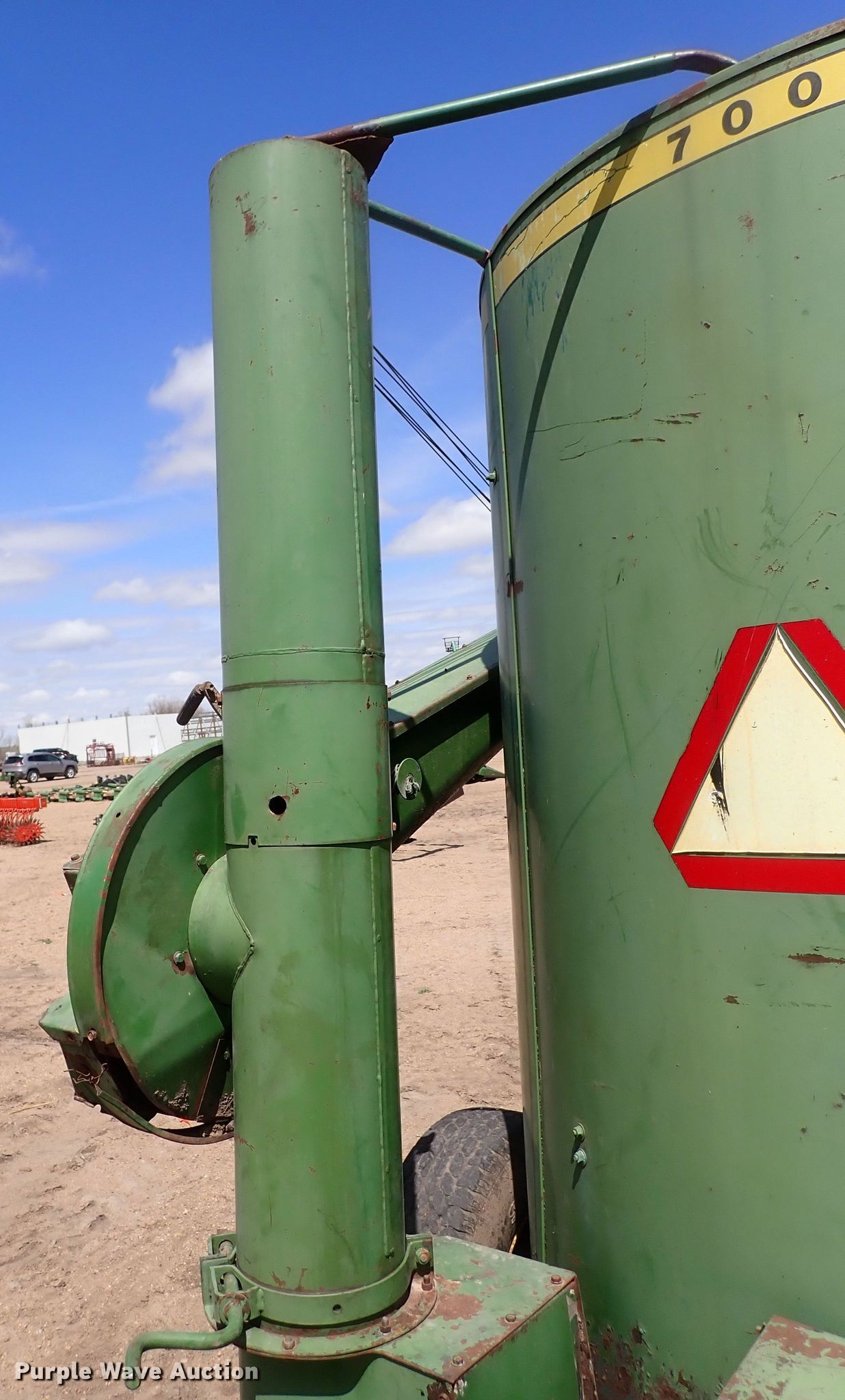 John Deere 700 feed grinder/mixer. Operational. Bushel capacity: 80, PTO: 540. Tires Size: 11L-15. 1137 90th Ave. Kinsley, KS 67547