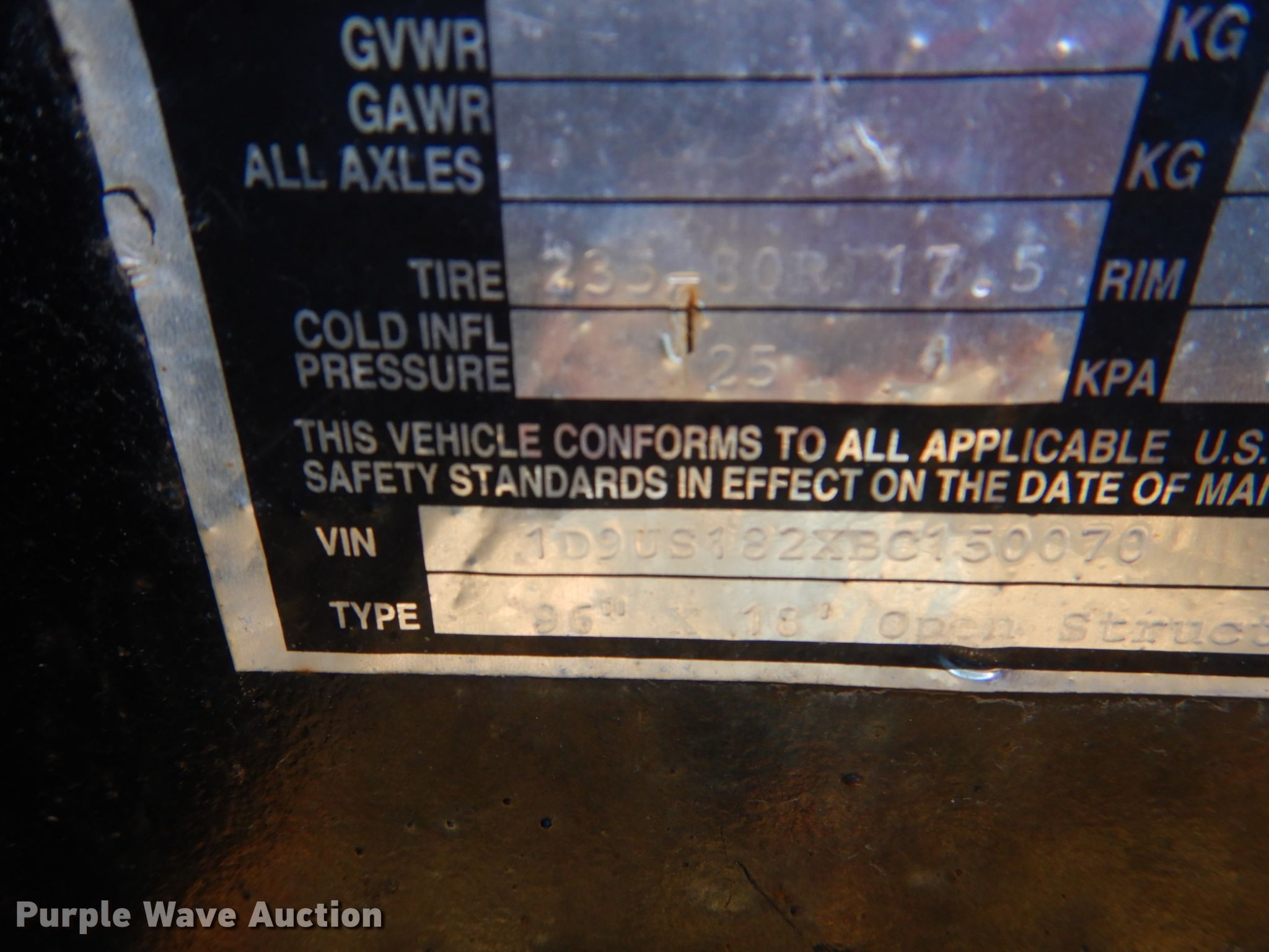 2011 D&K trailer. 21'5"L x 96"W overall, Dual leg landing gear, Spring suspension, Electric brakes, Tandem axle, 235/80R16 tires. Title distribution may be delayed up to 14 days from verification of funds. 1D9US182XBC150070. Valley Ag Supply. 509 Washington St. Gayville, SD 57031