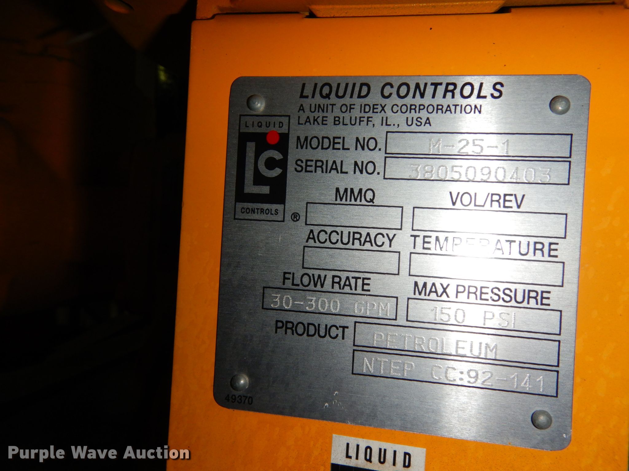 Purple Wave is selling a used Truck Part and Attach. in Texas. This item is a Liquid control meter with the following: Model M25-1, 30 to 300 gpm flow rate, 150 max psi, Used for petroleum, Serial 3805090403