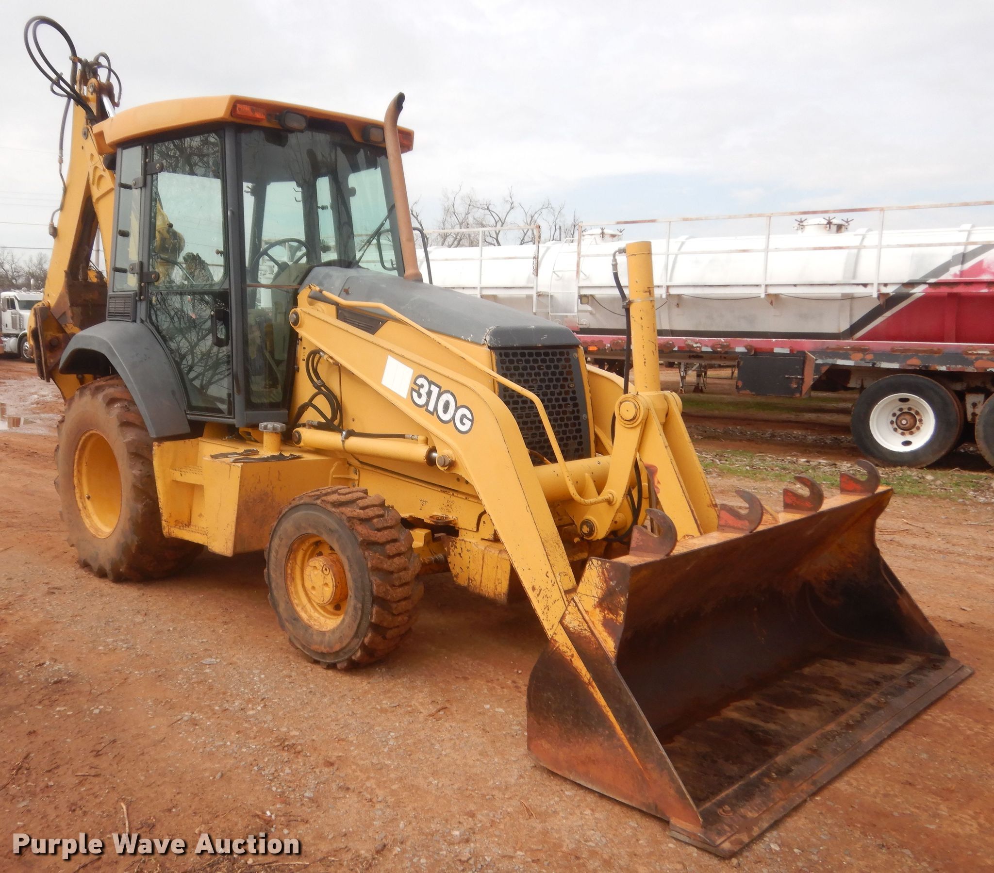 John Deere 310G backhoe. 5,831 hours on meter. Engine John Deere, Cylinders: 4, Fuel type: Diesel. Transmission Shuttle shift, 4F - 4R. Chassis Four wheel drive. Operators station EROPS AC, Heat, Backhoe controls: Wobble stick / two stick. Operational Loader Bucket Width: 86", Backhoe Bucket Width: 24".. Tires Front: 12-16.5, Rear: 19.5-24. Canadian Valley Trucking Retirement Sale. Crescent, OK 73028