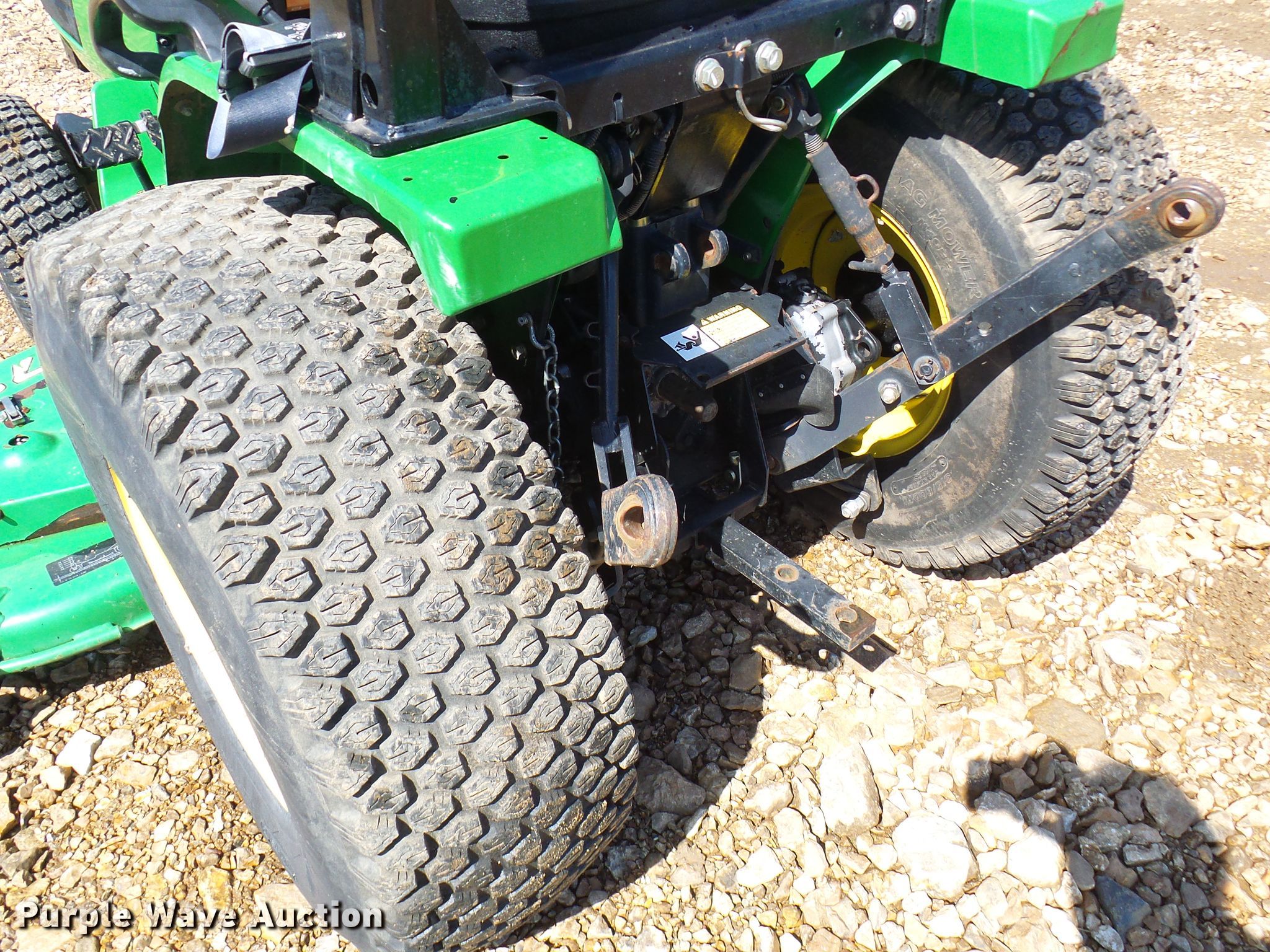 John Deere 4115 tractor. 1,029 hours on meter, Serial: H110691. Engine Yanmar, Cylinders: 3, Fuel type: Diesel. Transmission Hydrostatic. Operational PTO: 540, Three point, Hydraulic remote sets Side: 2, 72"W mid-mount mower. Tires Front: 23x8.50x12, Rear: 315/80D16. T&R Equipment. 5172 County Rd 456. Tebbetts, MO 65080