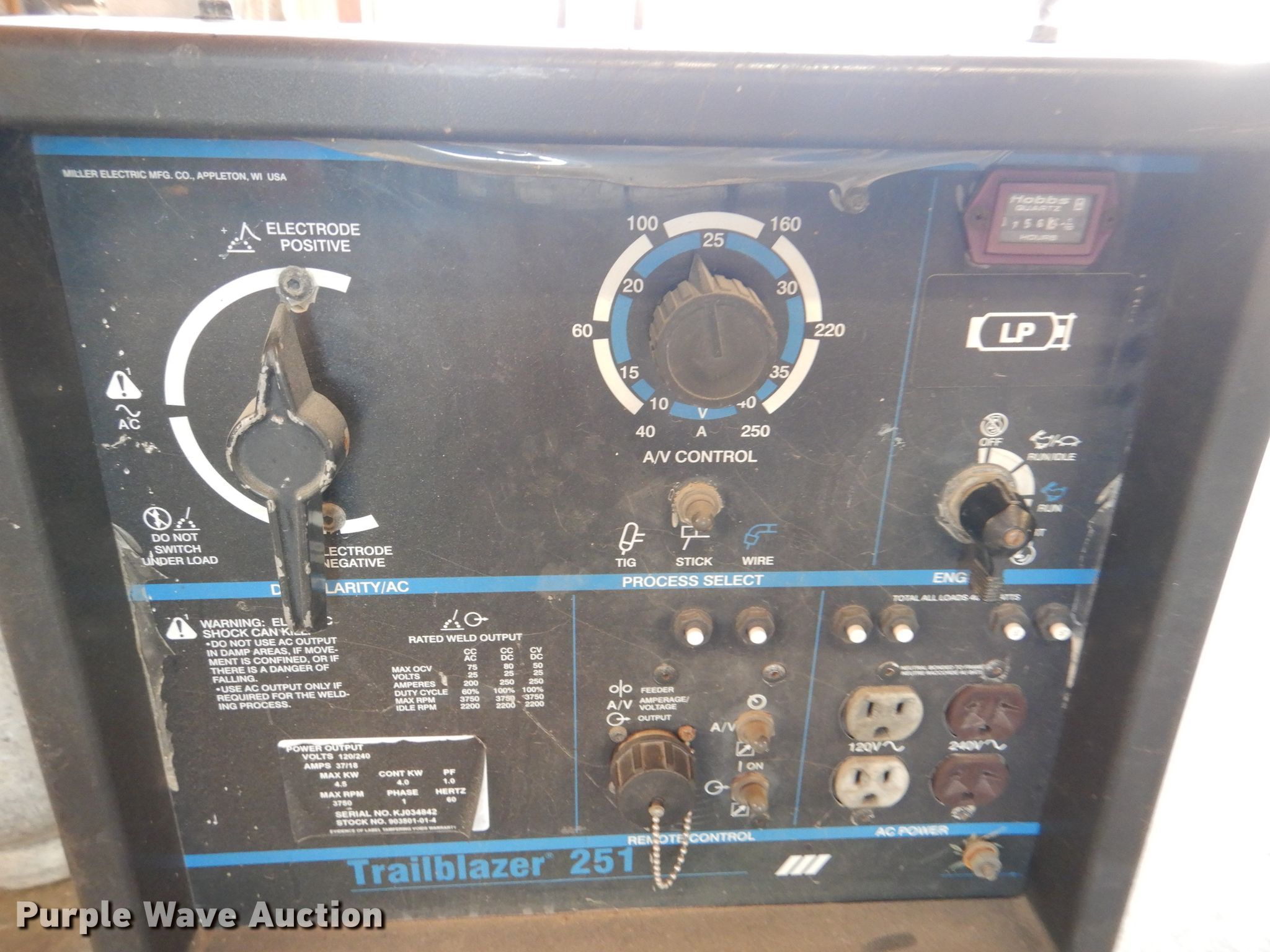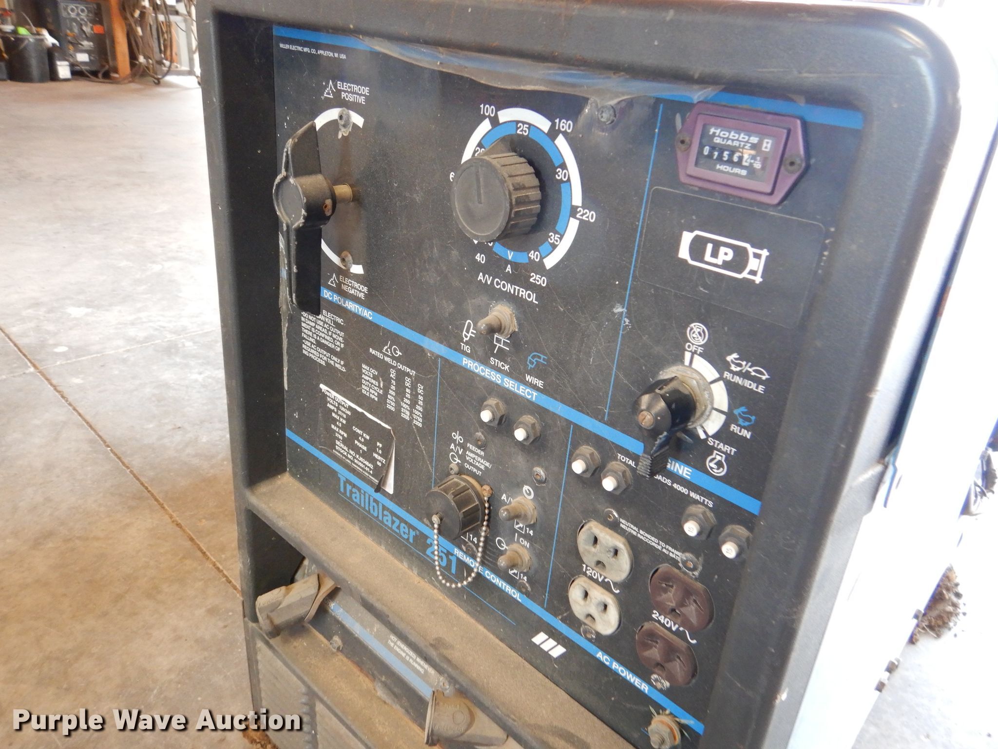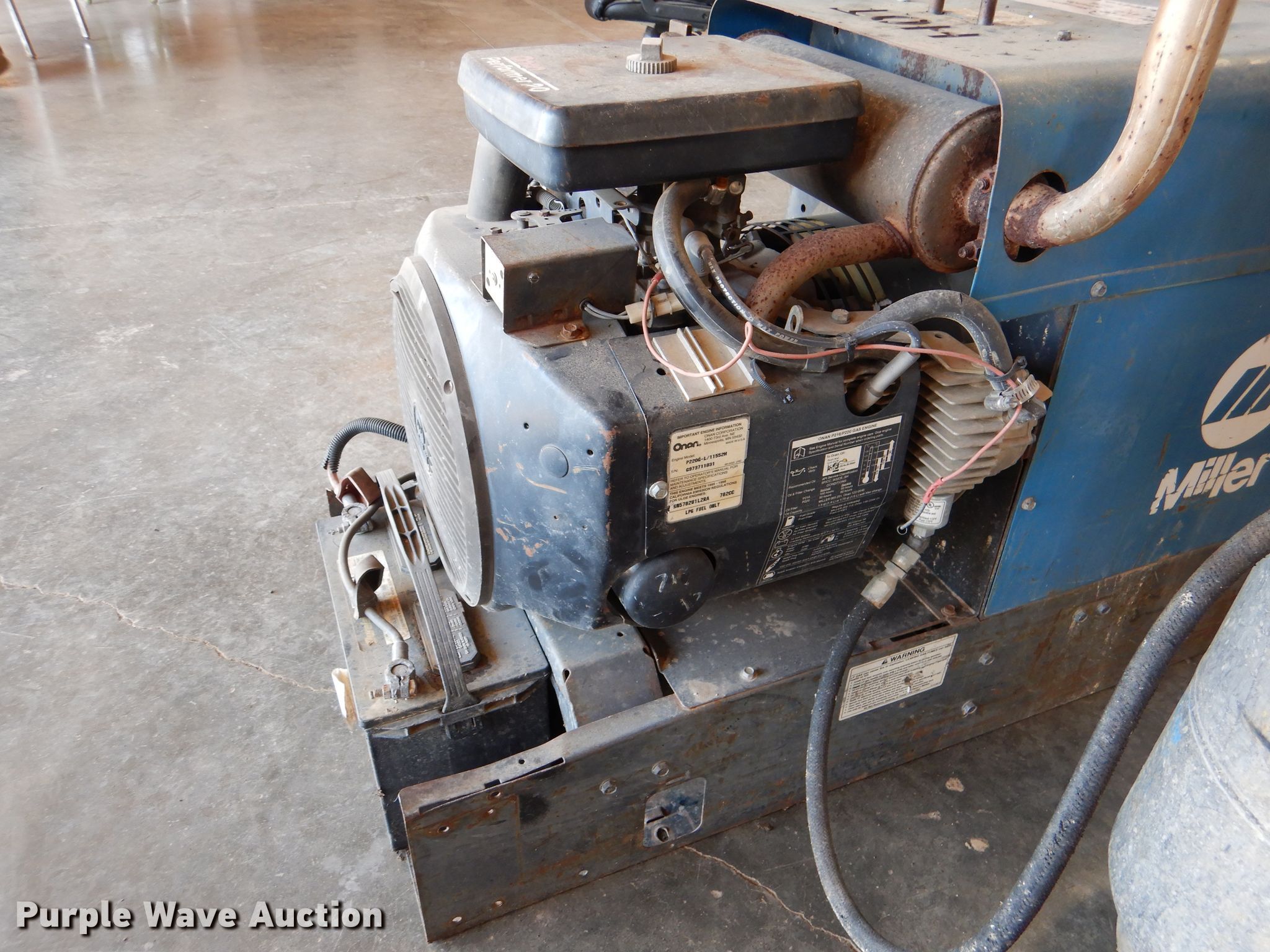 Purple Wave is selling a used Welder (Manual) in Kansas. This item is a Miller Trailblazer 251 welder with the following: 756 hours on meter, Onan Performer 20 782cc LPG engine, Model P220G-L/11552H, Serial G973711031, Weak battery, Serial 903501-01-4