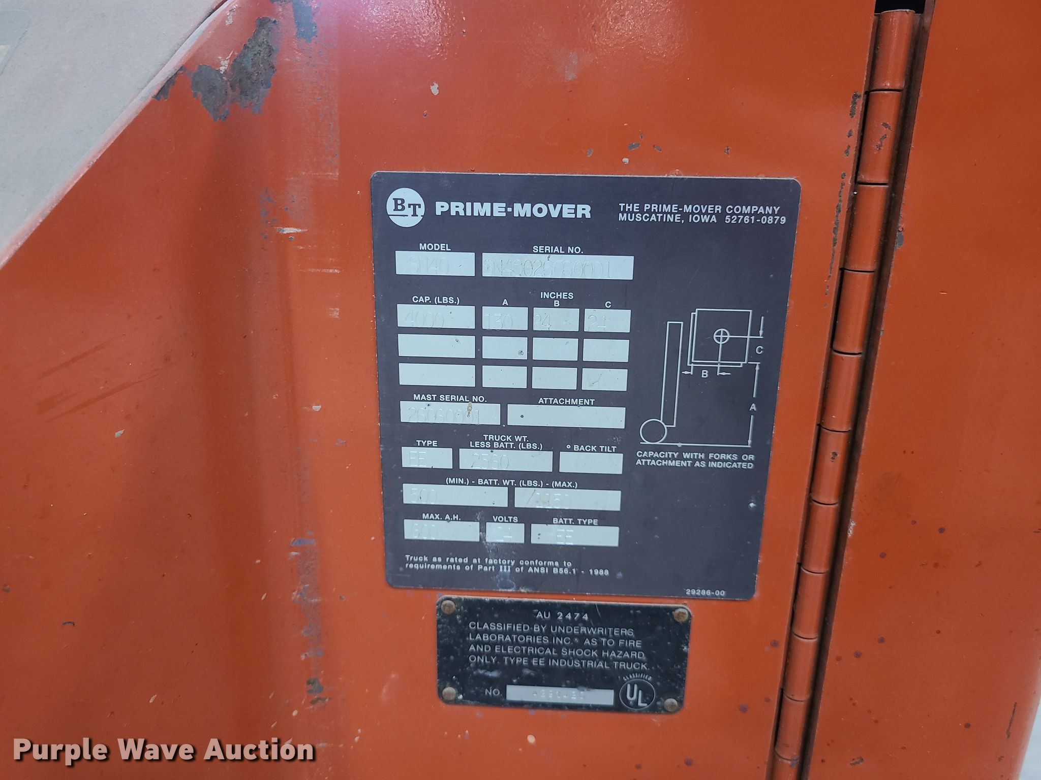 Purple Wave is selling a used Warehouse Forklift in Missouri. This item is a Prime Mover SN40 forklift with the following: 137 hours on meter, Serial: SN40026060001
