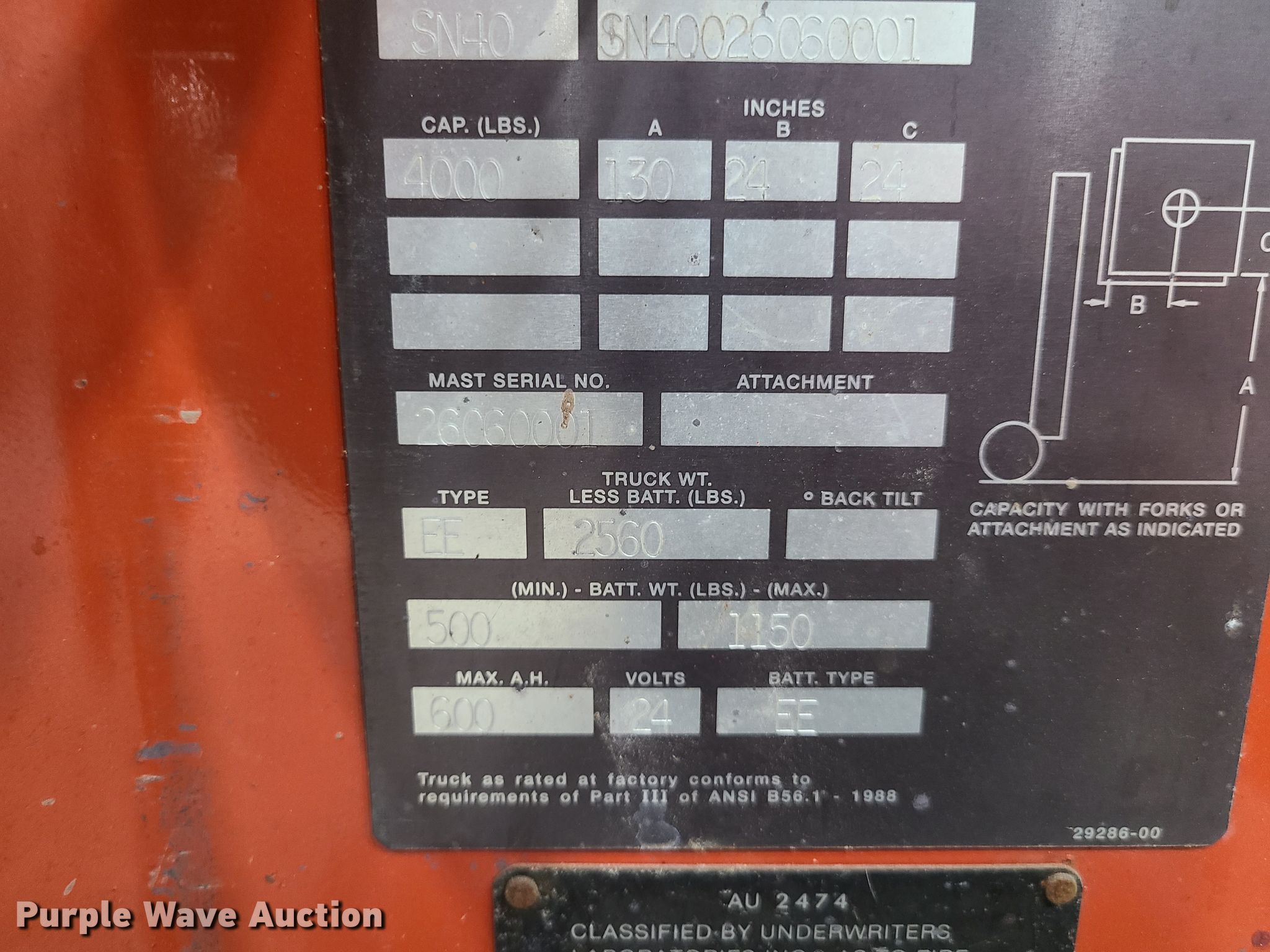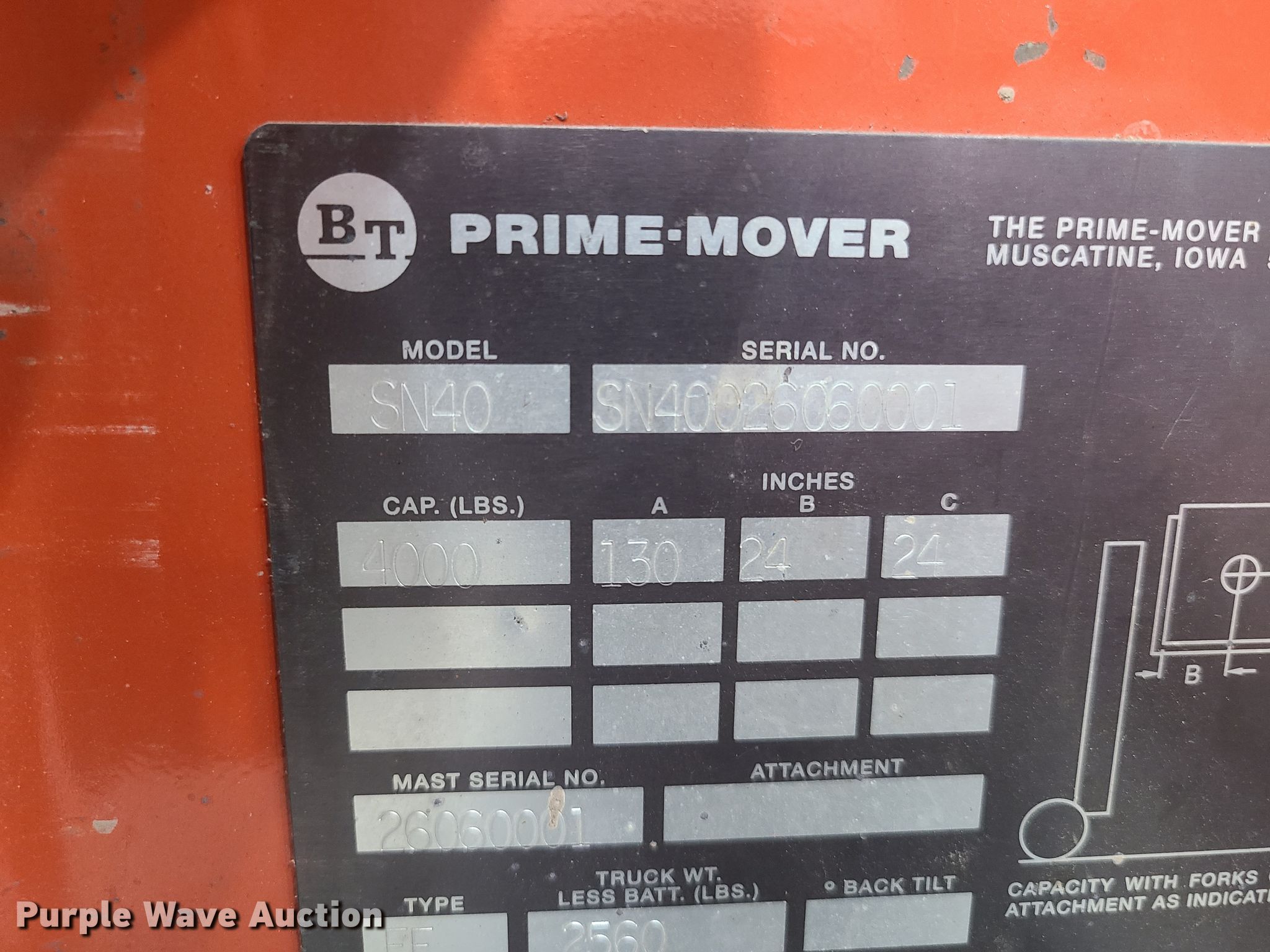 Prime Mover SN40 forklift. 137 hours on meter, Serial: SN40026060001. Electric Motor Volts: 24. Operational Maximum lift capacity: 4,000 lbs, Maximum lift height: 130", Mast stages: 2, Fork length: 30". Tires Solid. Notes Unknown operating condition. Concorp. 8100 NW Terr. Kansas City, MO 64153