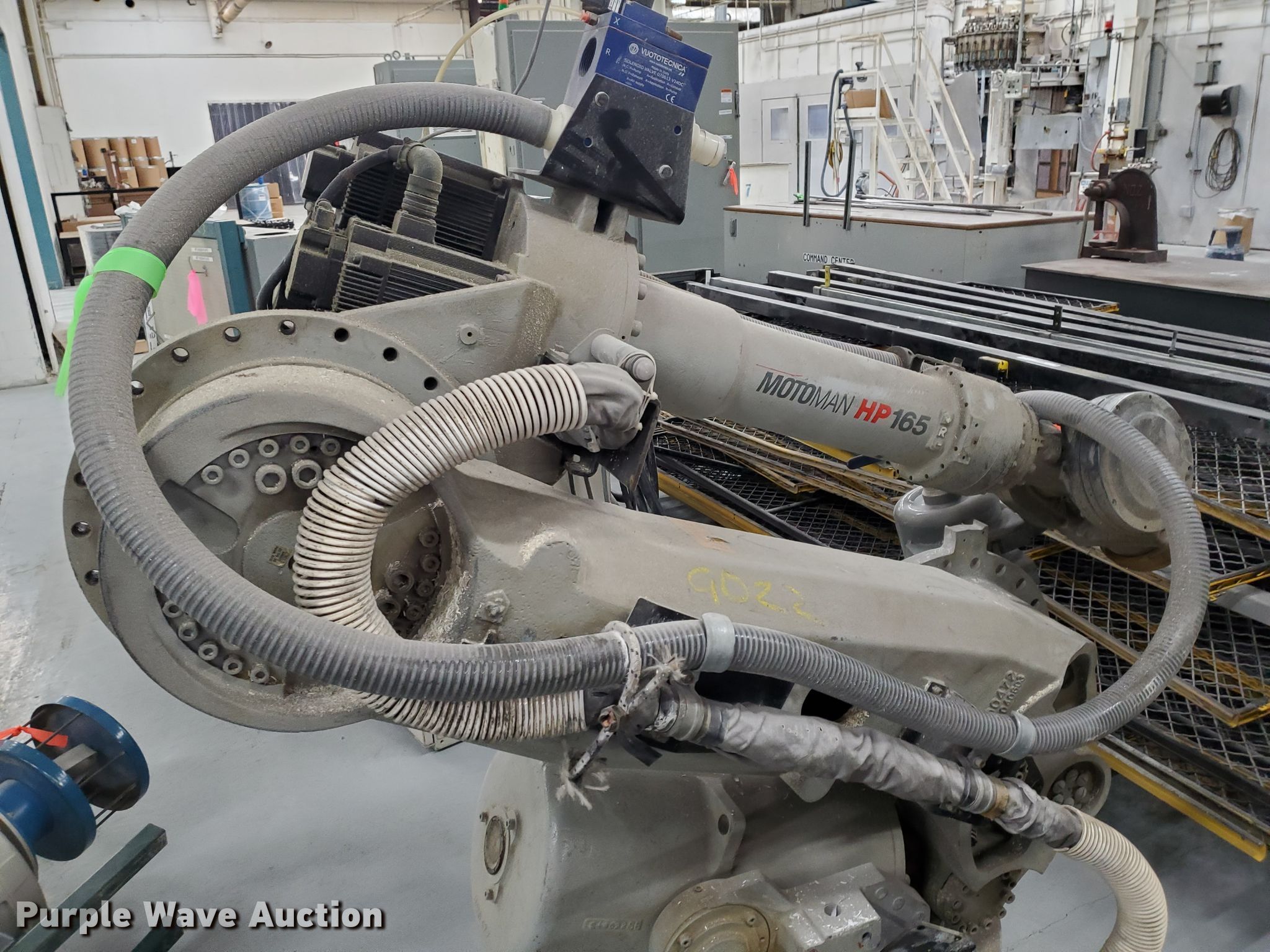 Purple Wave is selling a used Robot in Kansas. This item is a 2004 Motoman HP165 six axis material handling robot with the following: 480V, Three phase, Power supply, Motorman NX100 controller, Serial S4M126-2-4