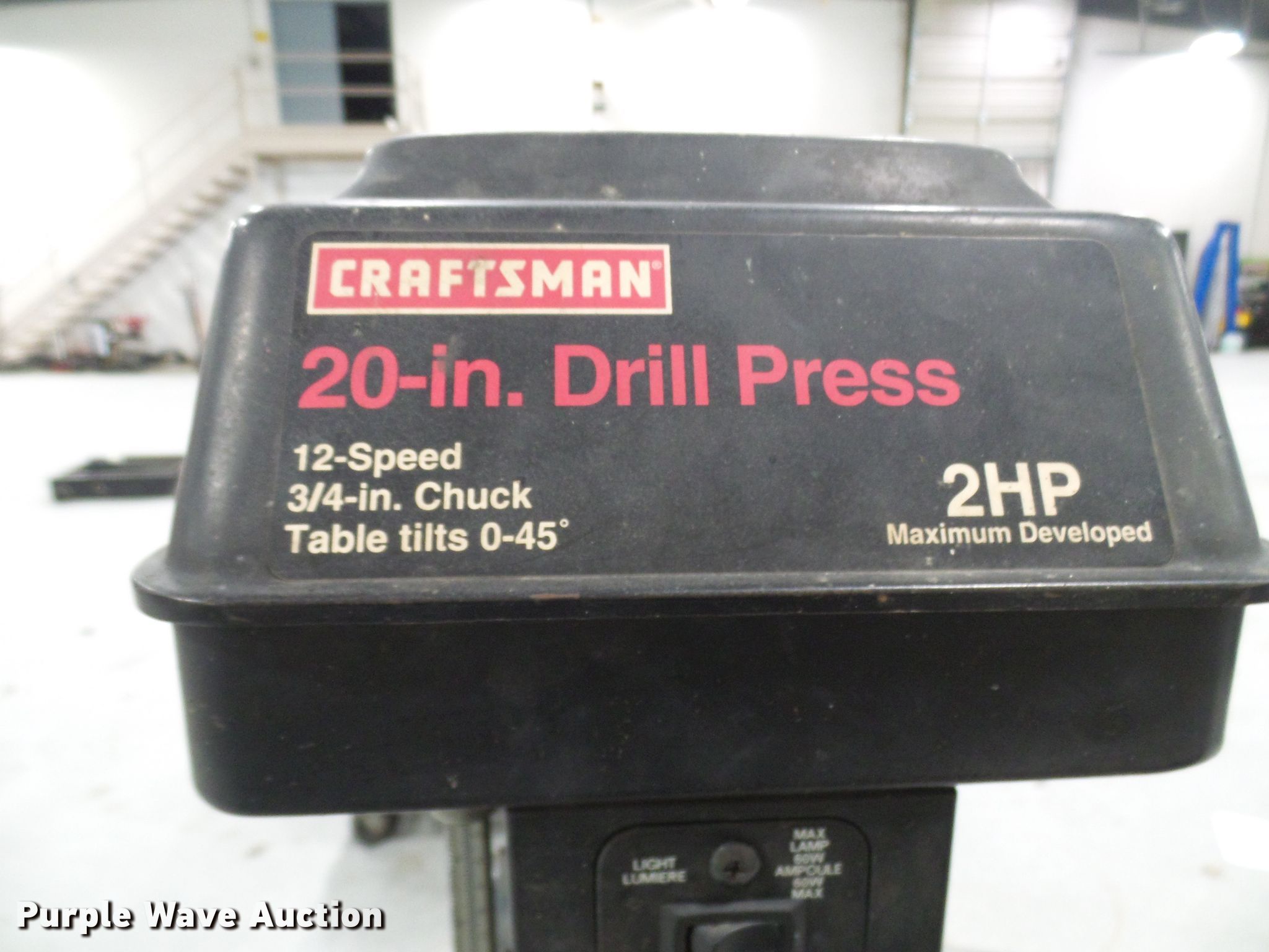 Purple Wave is selling a used Machine Shop Tools and Equip. in Missouri. This item is a Craftsman drill press with the following: 20", Electric motor, HP: 2, 12 speed, 3/4" chuck