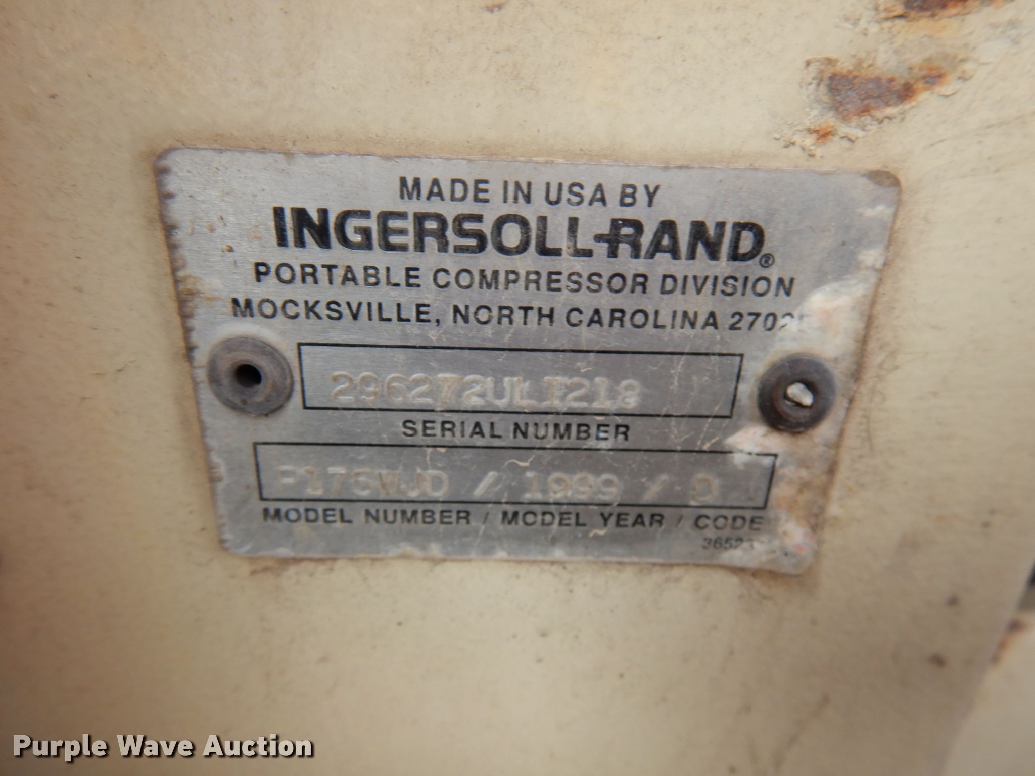 1999 Ingersoll Rand P175 air compressor. 158 hours on meter, Serial: 296272ULI218, Unit #: 5063. Engine John Deere, Cylinders: 3, Fuel type: Diesel. Operational CFM: 175, PSI: 100. Trailer Suspension: Spring, Brakes: Electric, Axles: Single, Tire size: 225/75R15. Transfer of ownership documentation will be a bill of sale. 296272ULI218. Push, Inc.. 1100 Lindy St. Rice Lake, WI 54868