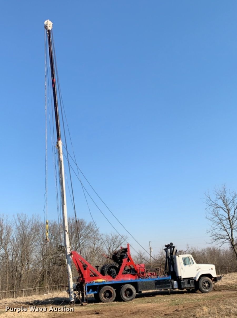 1982 International F2654 pulling unit. 3,134 miles on odometer. Engine Caterpillar 3208, Displacement: 7.6L, Cylinders: 8, Fuel type: Diesel, HP: 210. Transmission Allison, Automatic. Chassis Differential lock: Inter-axle, Axles: Tandem, Suspension: Walking beam, Brakes: Air, PTO, GVWR: 53,200 lbs, Wheelbase: 238". Interior Heat. Operational Bed: 19'L, 7' x 8' poles, Approximately 4,000'L x 9/16" diameter sand line, 7/8" tube line, C-65 Wichtex double drum draw, Three sheave crown, Winch, Power tong connections, Air slip connections, Rod hook, Tubing block, Pneumatic controls, Outriggers. Tires Size: 385/65R22.5, Brand: Yokohama. Notes Diverter box noisy in the high gear. Oklahoma title. 1HTCF265XCHA15465. Merriman Trucking. Cleveland, OK 74020