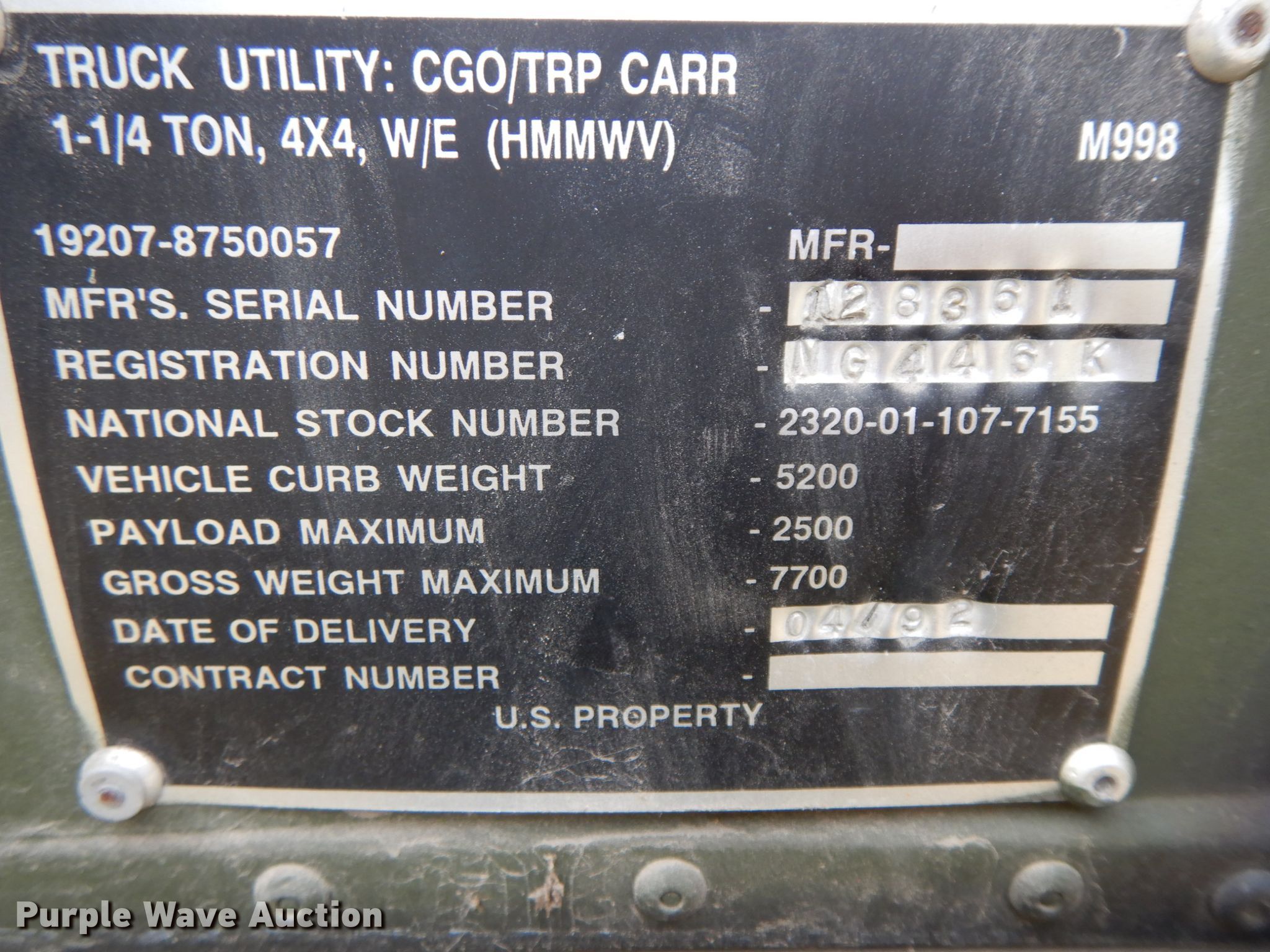 Take a look at this used 1991 Am General Humvee SUV being sold on May 11th, 2021 in the SOLD! May 11 Government Auction made by Am General. Take a look at all of the item information below or take a look at similar auctions for Passenger Vehicles.
