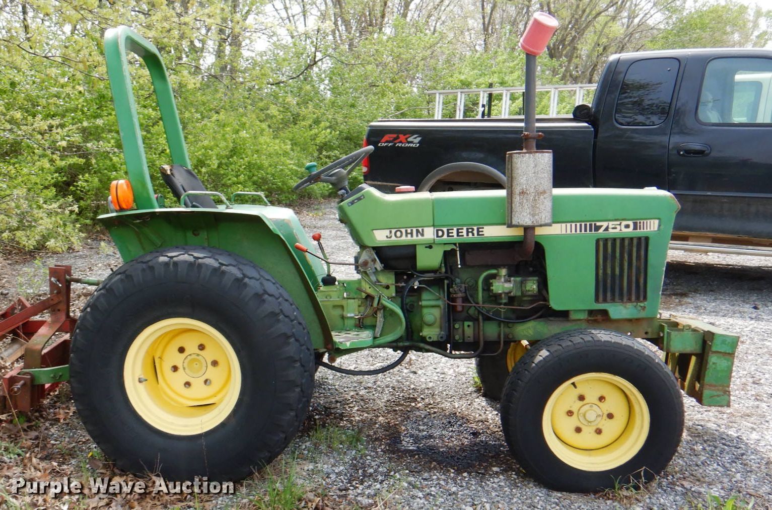 John Deere 750 tractor. 5,788 hours on meter. Engine John Deere , Cylinders: 3, Fuel type: Diesel. Transmission Powershift, 8F - 1R. Operational PTO: 540, Three point. Tires Front: 225/70R14, Rear: 13.50-16.1. Notes Left wheel is welded on. City of Nevada, MO. 17330 E Quail Rd. Nevada, MO 64772