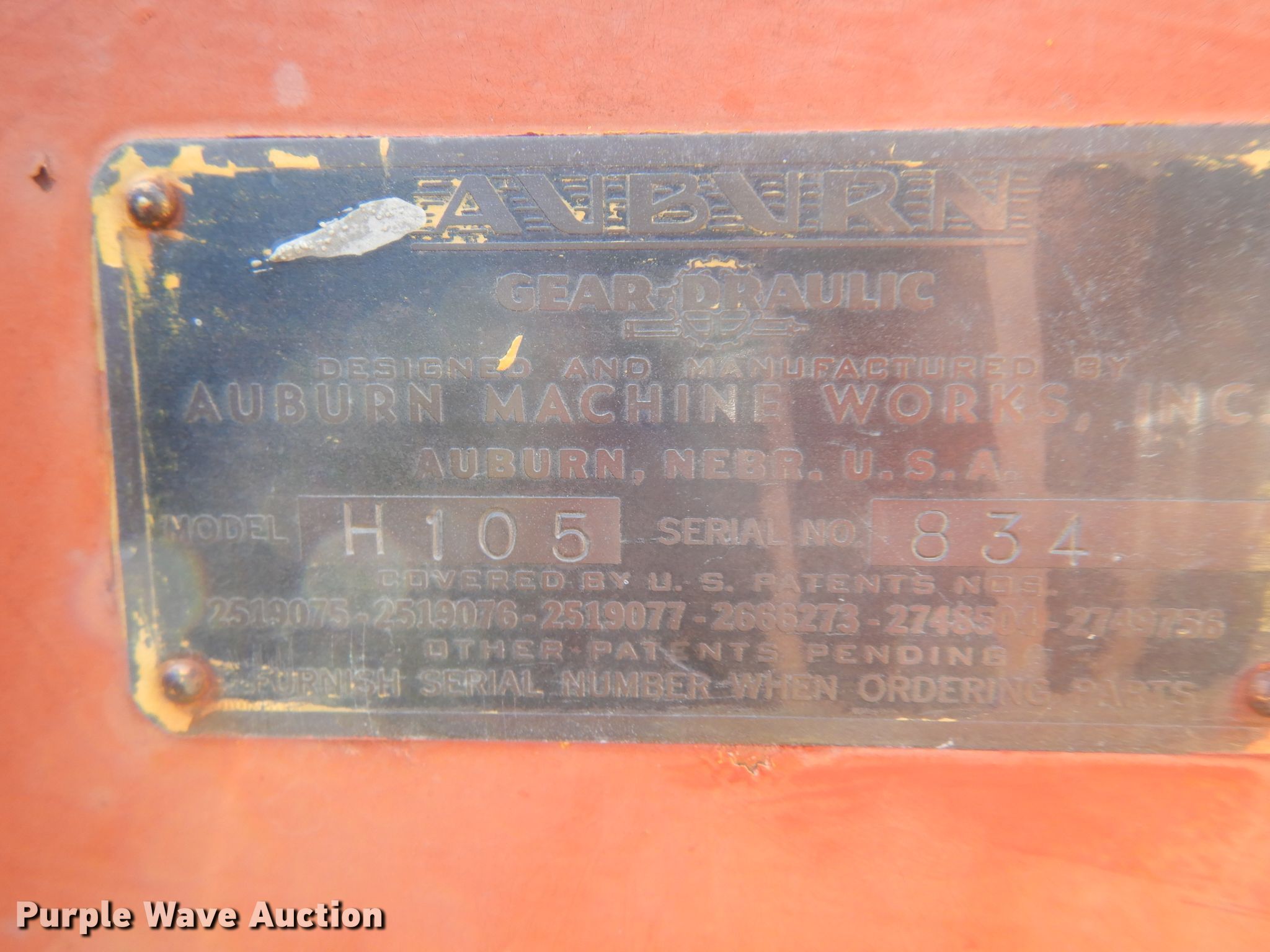 1959 International 340 tractor. 1,277 hours on meter, Serial: 4331. Engine Cylinders: 4, Fuel type: Gas. Transmission Manual, 5F - 1R. Tires Front: 5.50-16, Rear: 12.4-28. Notes Trencher Auburn H105, Boom length: 8', Serial: 834. City of Pratt. 924 S Jackson St. Pratt, KS 67124