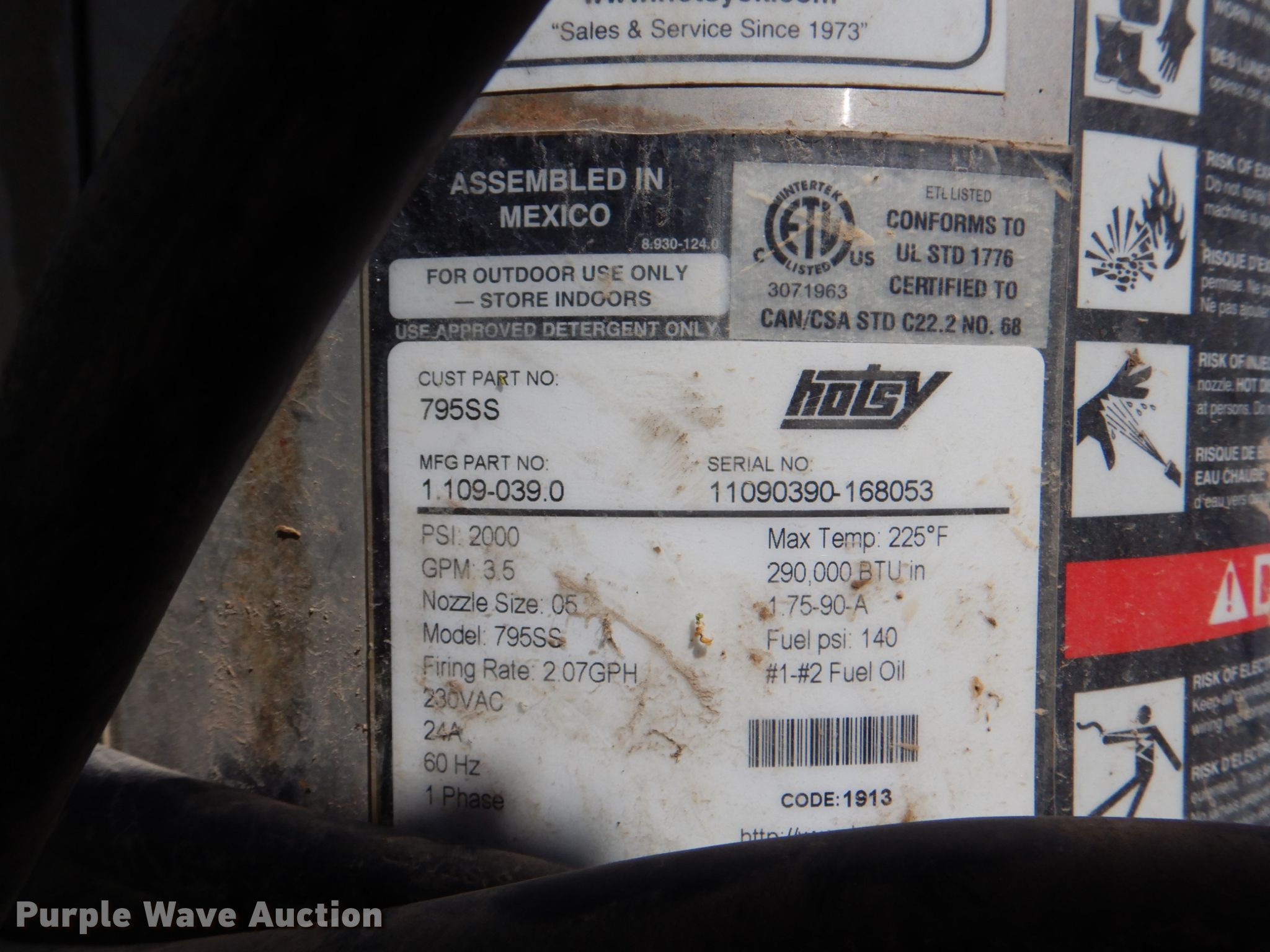 Purple Wave is selling a used Pressure Washer in Oklahoma. This item is a Hotsy 795SS pressure washer with the following: 230V AC, Single phase, 2,000 psi, 3.5 gpm, Diesel fired burner, No wand, Unknown operating condition