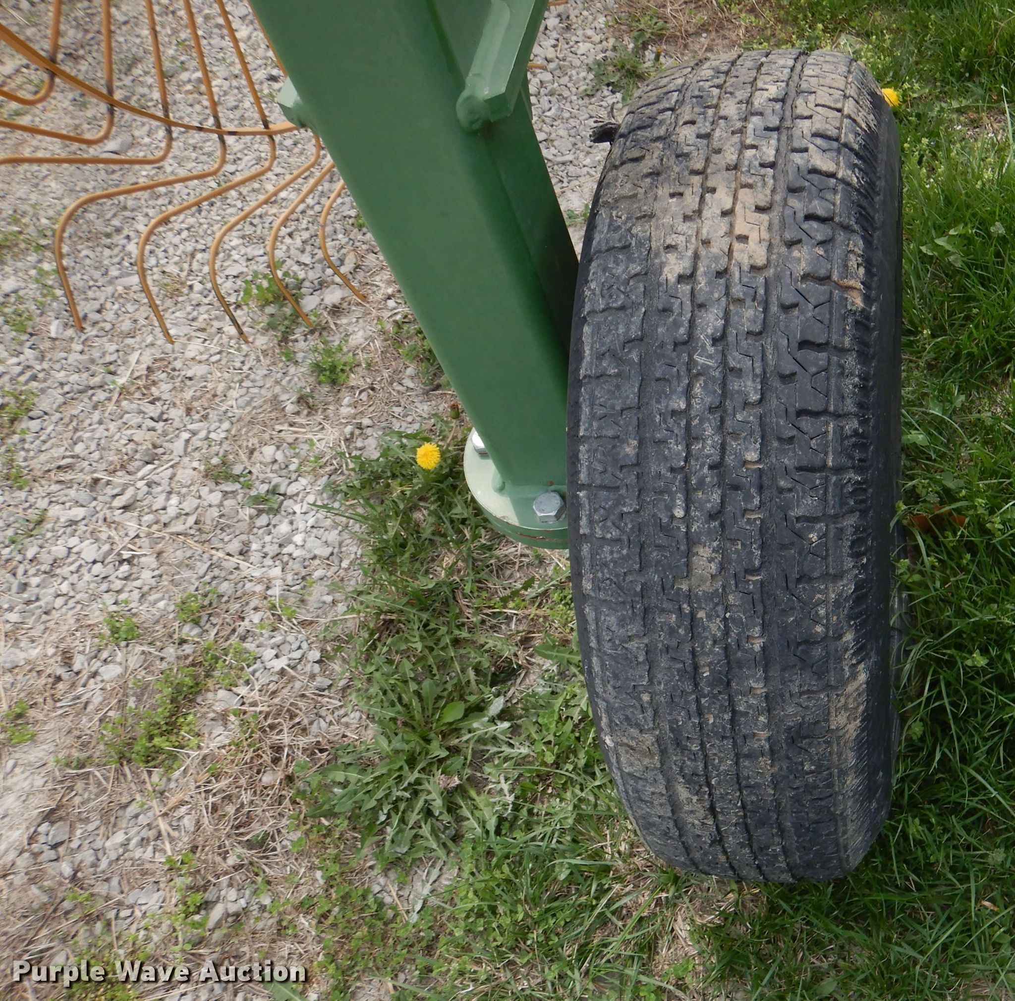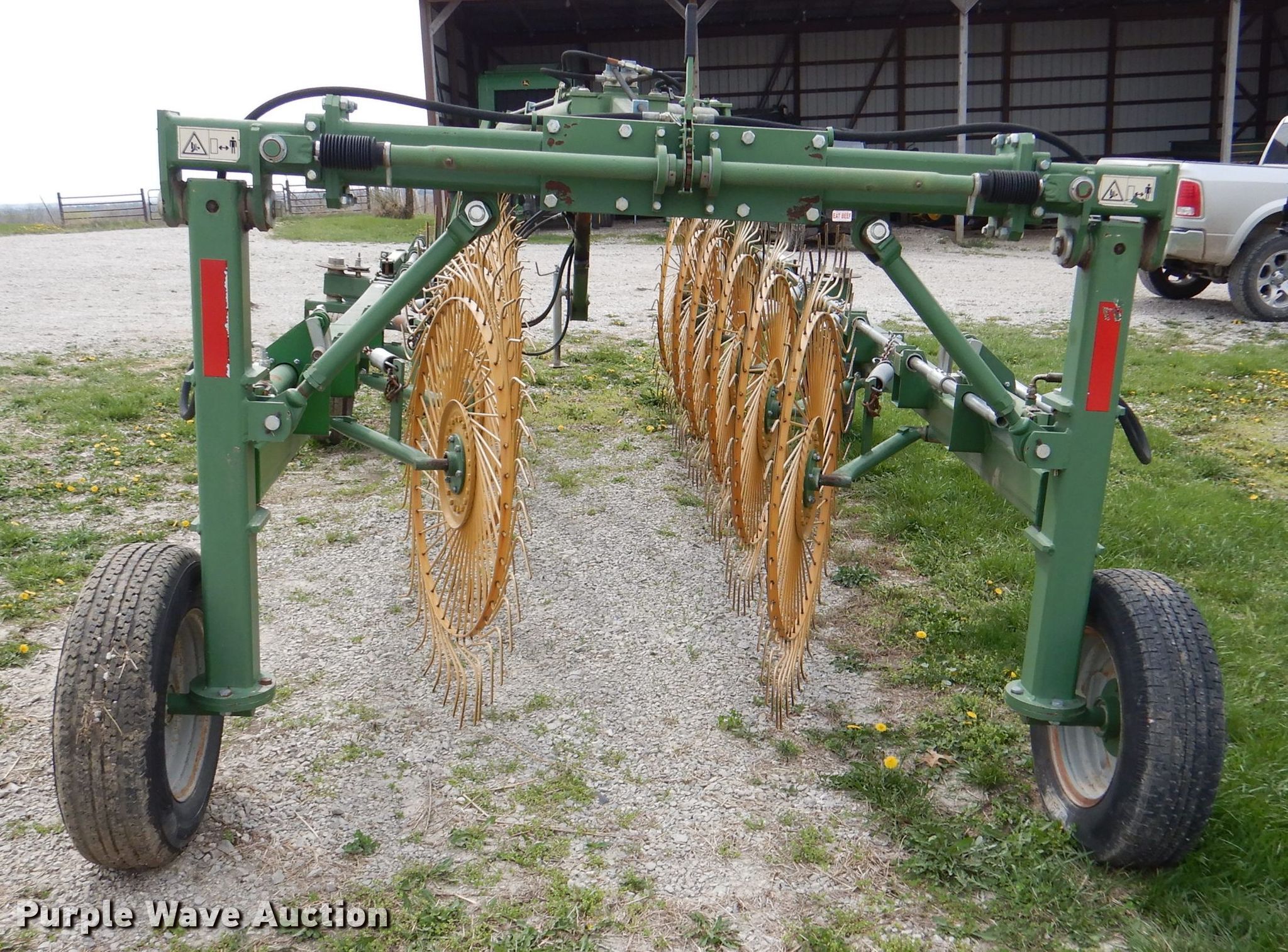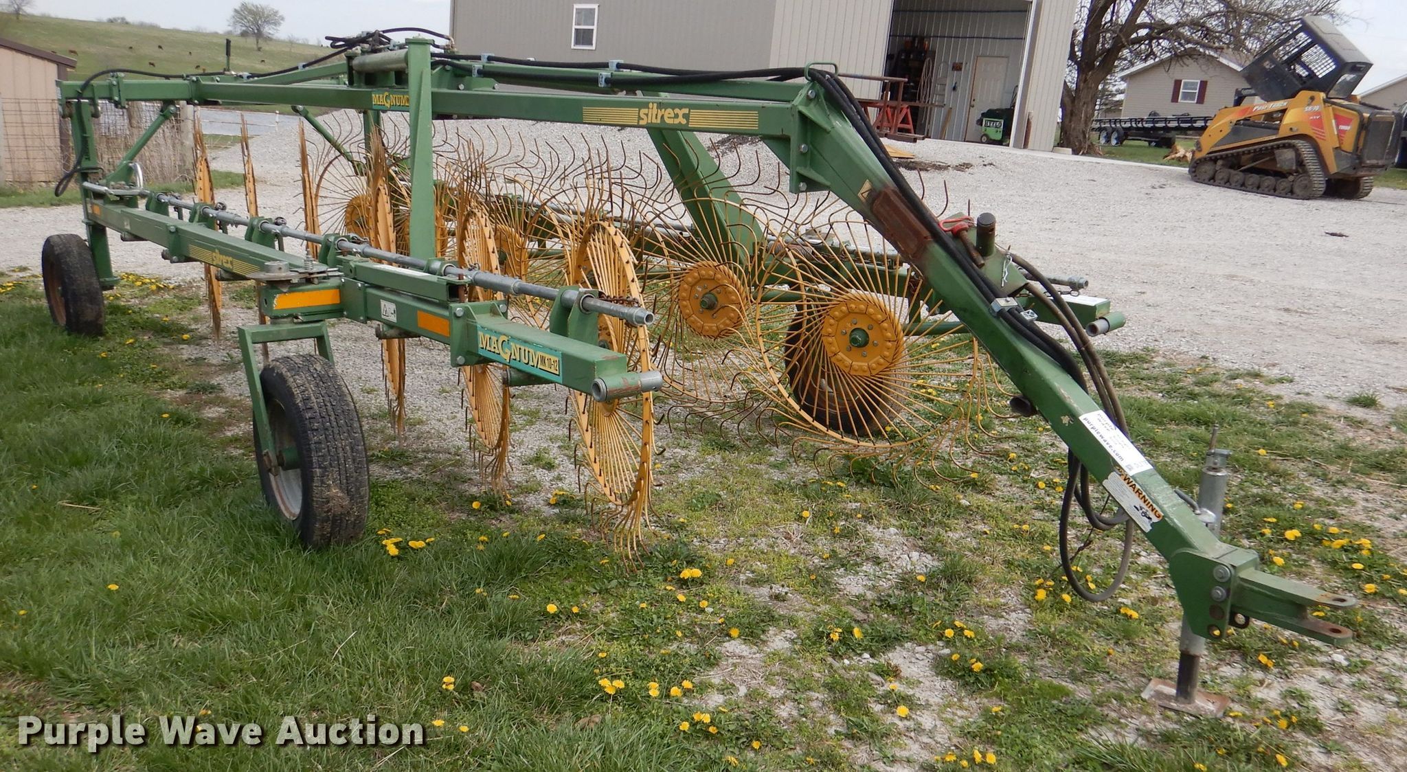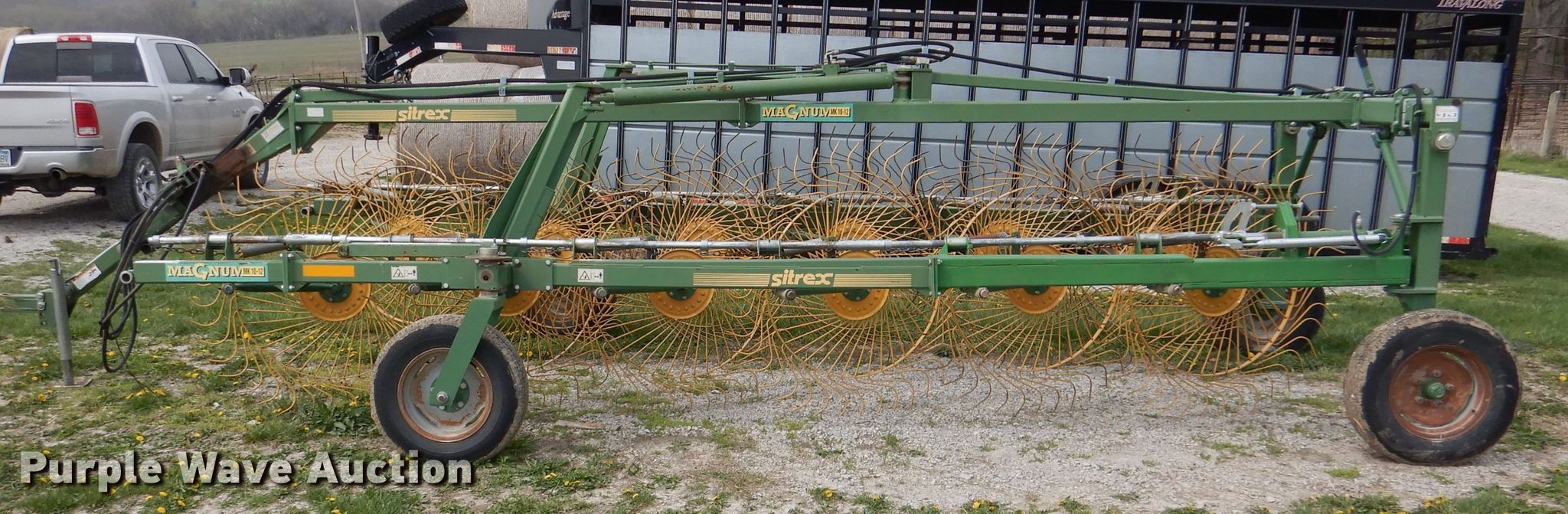 Purple Wave is selling a used Hay Rake in Kansas. This item is a Sitrex MK-12 hay rake with the following: 25'W, (12) 36" diameter wheels, Hydraulic fold, 205/75R15 tires, Serial: 151493