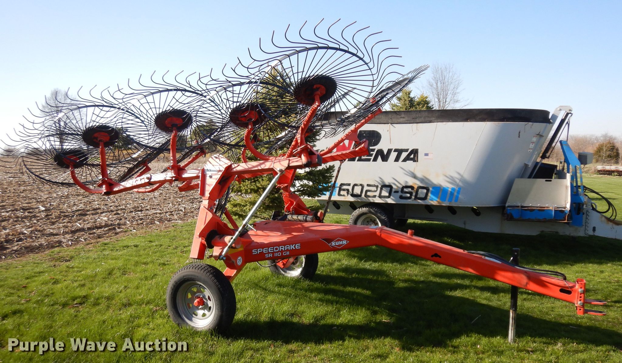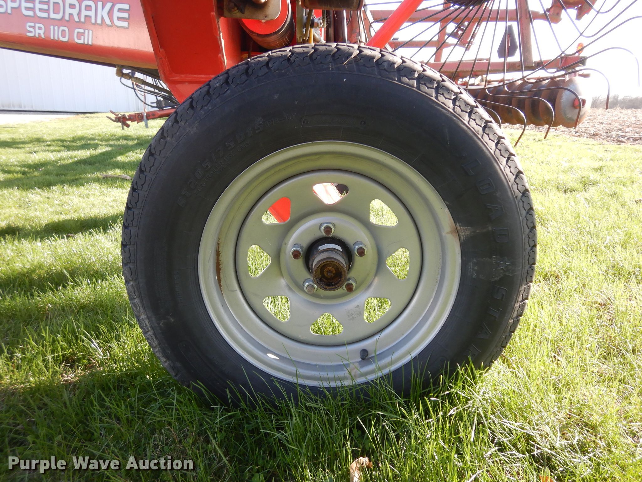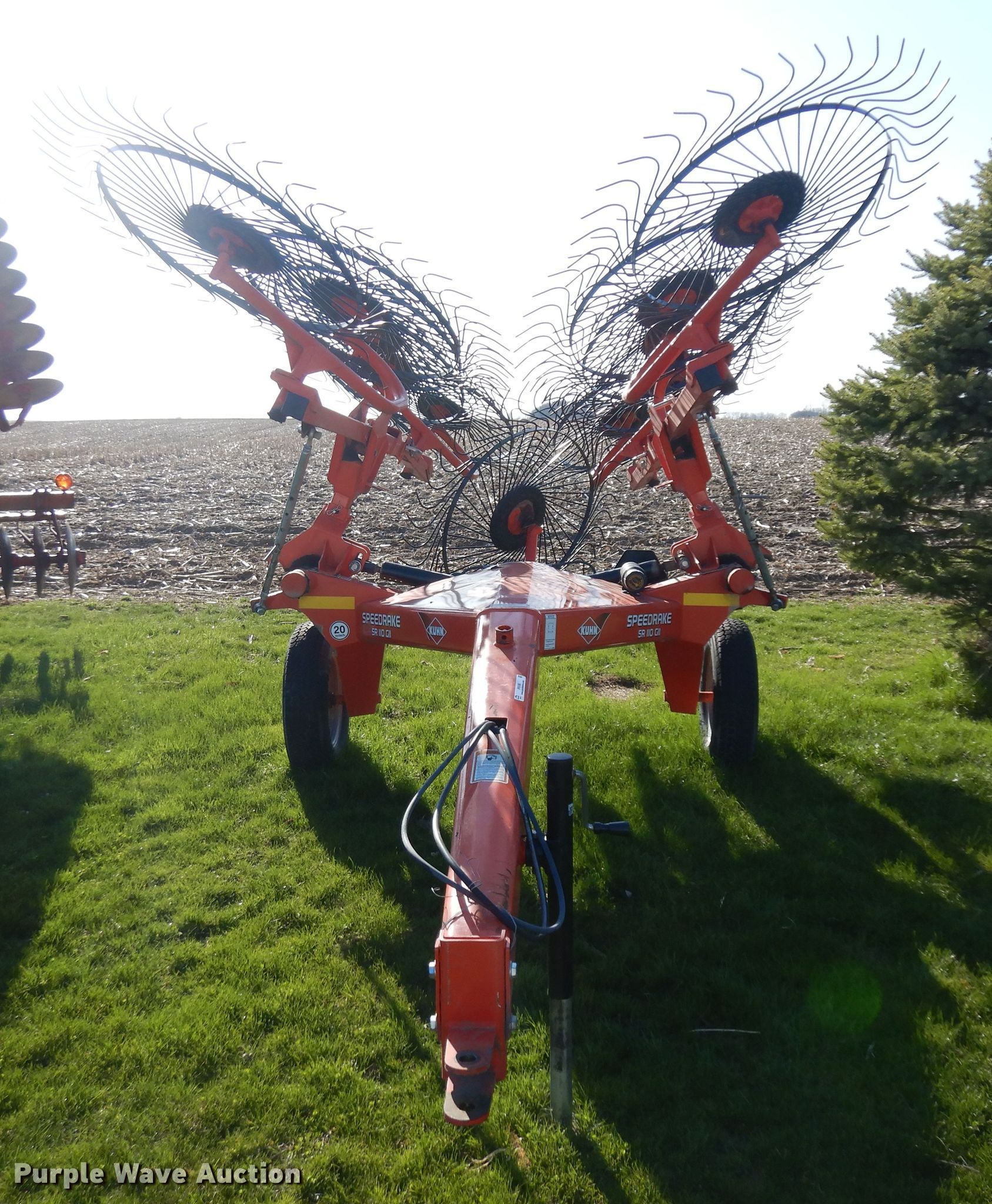 Purple Wave is selling a used Hay Rake in Illinois. This item is a Kuhn SR110 GII hay rake with the following: 24'W, Hydraulic fold, Tire size: 205/75D15, Serial B4497