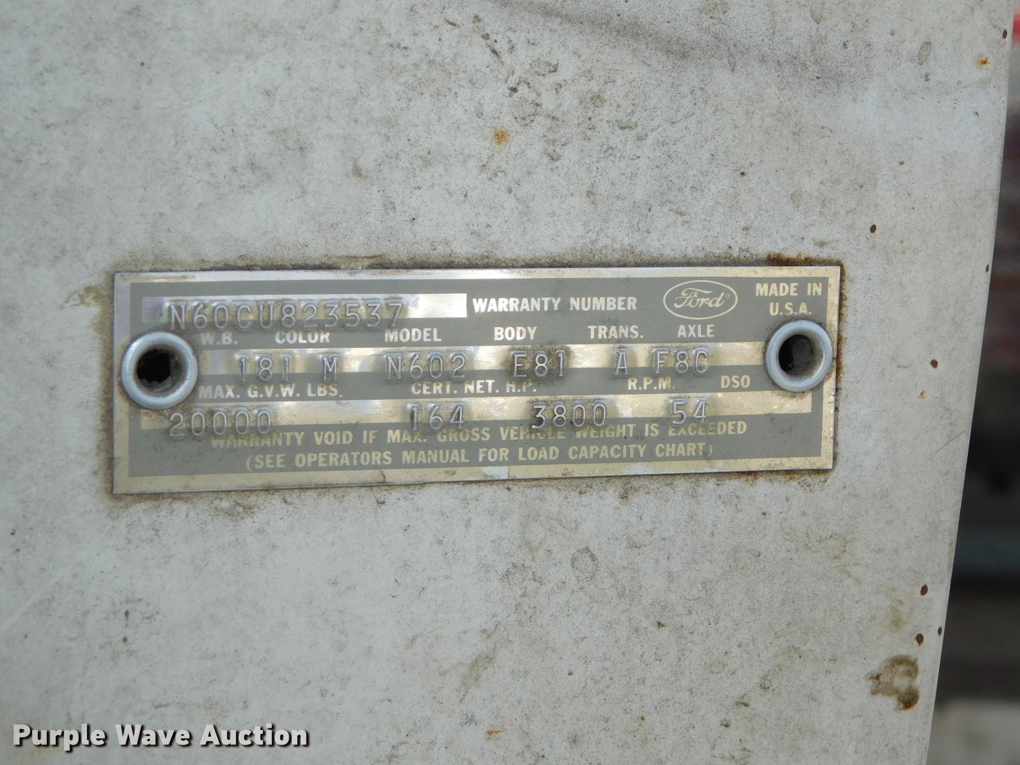 1966 Ford 600 flatbed truck. 139,370 miles on odometer. Engine Cylinders: 8, Fuel type: Gas. Transmission Manual, Speed: 4. Chassis Axles: Single, Brakes: Hydraulic, GVWR: 20,000 lbs, Wheelbase: 181". Interior Heat. Operational Flatbed 17.5' L x 94" W. Tires Size: 9.00-20. Notes Parts missing, Driver window broken , Non-operational unit. Nebraska title. N60CU823537. 215 W Paul St. Hastings, NE 68901