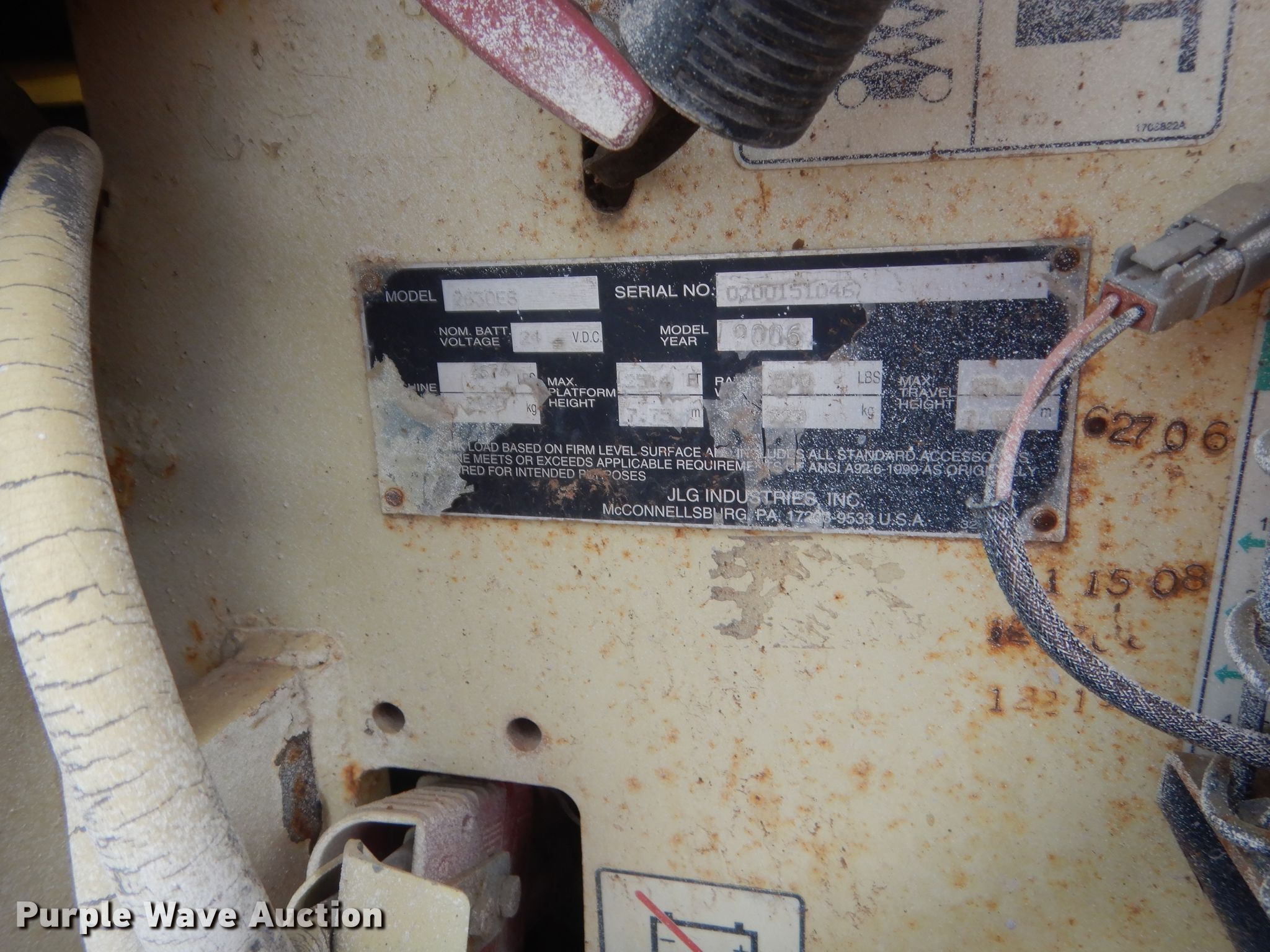 Purple Wave is selling a used Scissor or Vertical Lift in Oklahoma. This item is a 2006 JLG 2630ES scissor lift with the following: 365 hours on meter, Serial: 0200151046