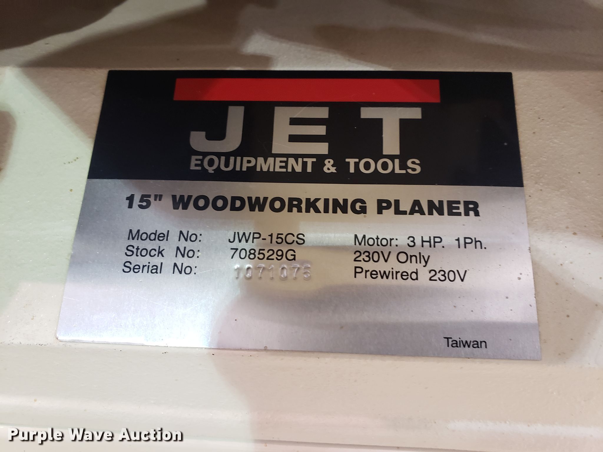 Purple Wave is selling a used Tools in Oklahoma. This item is a Jet JWP-15CS Gold Jet series planer with the following: 15" working width, 16" roller in/out feed, 230V electric motor, 3 HP, Single phase, Serial 1071076